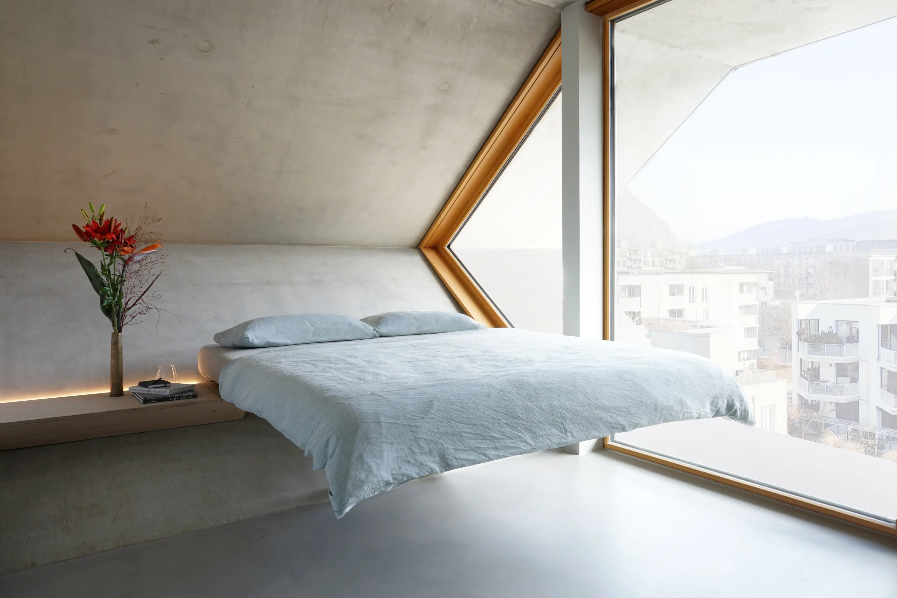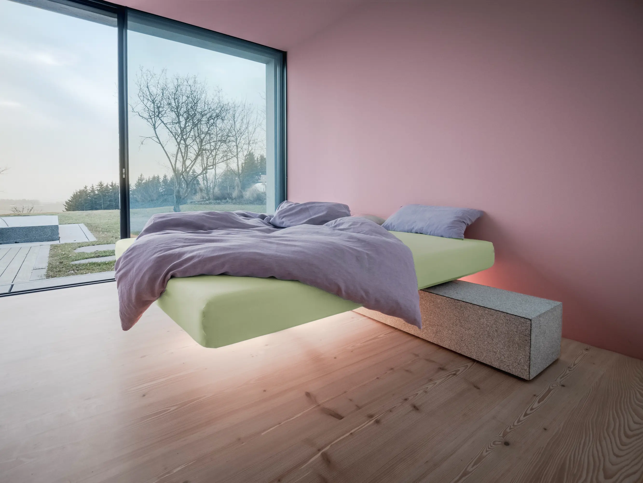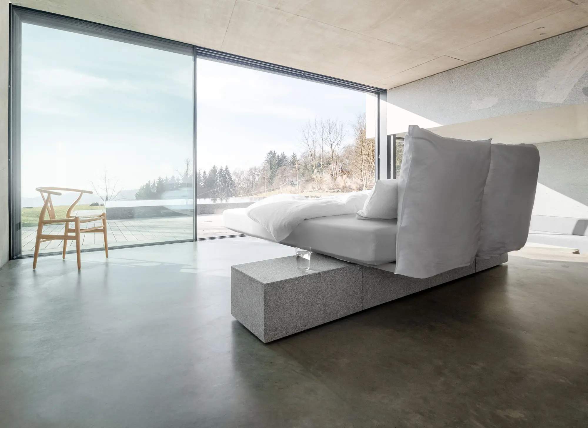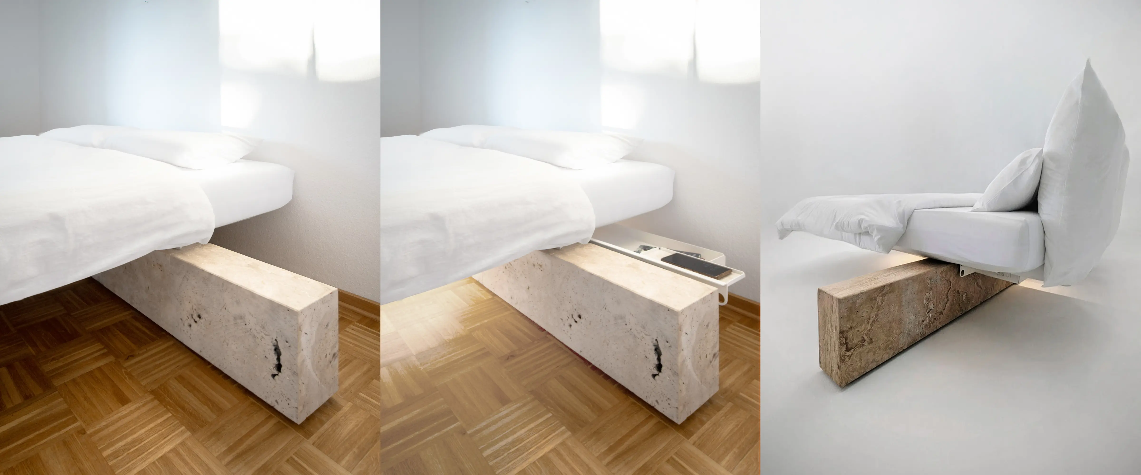 The Architect's Bed uses its floating lightness to create a sense of spaciousness where space is often scarce. It combines the bed, nightstand, and headboard into a single, minimalist statement piece. The light sleeping surface balances on a solid foundation of natural stone—a dialogue of contrasts. A hidden drawer replaces the nightstand, while freestanding pillows form the headboard. An intelligent design object that lends a unique calm and elegance to the bedroom, letting the space breathe.