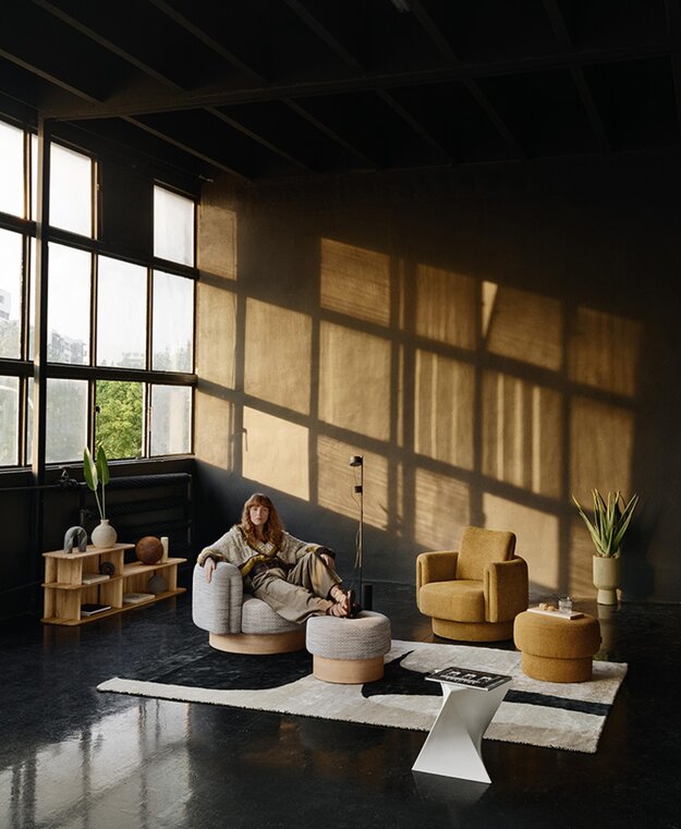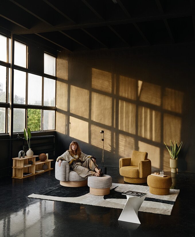The Bofii armchair has an interesting form, with a strong focus on detail. Handcrafted by craftsmen with extensive experience, It is available in two sizes of armrests and backrest cushions, allowing for the creation of various compositions by multiplying and combining different variants of this piece of furniture. The armchair offers a high level of seating comfort. The armrests are at a pleasant height, and the recessed plinth makes it easier to get up. The swivel base and matching footrest enhance user comfort. The base can be upholstered or veneered with oak veneer (in natural, walnut or black colour).