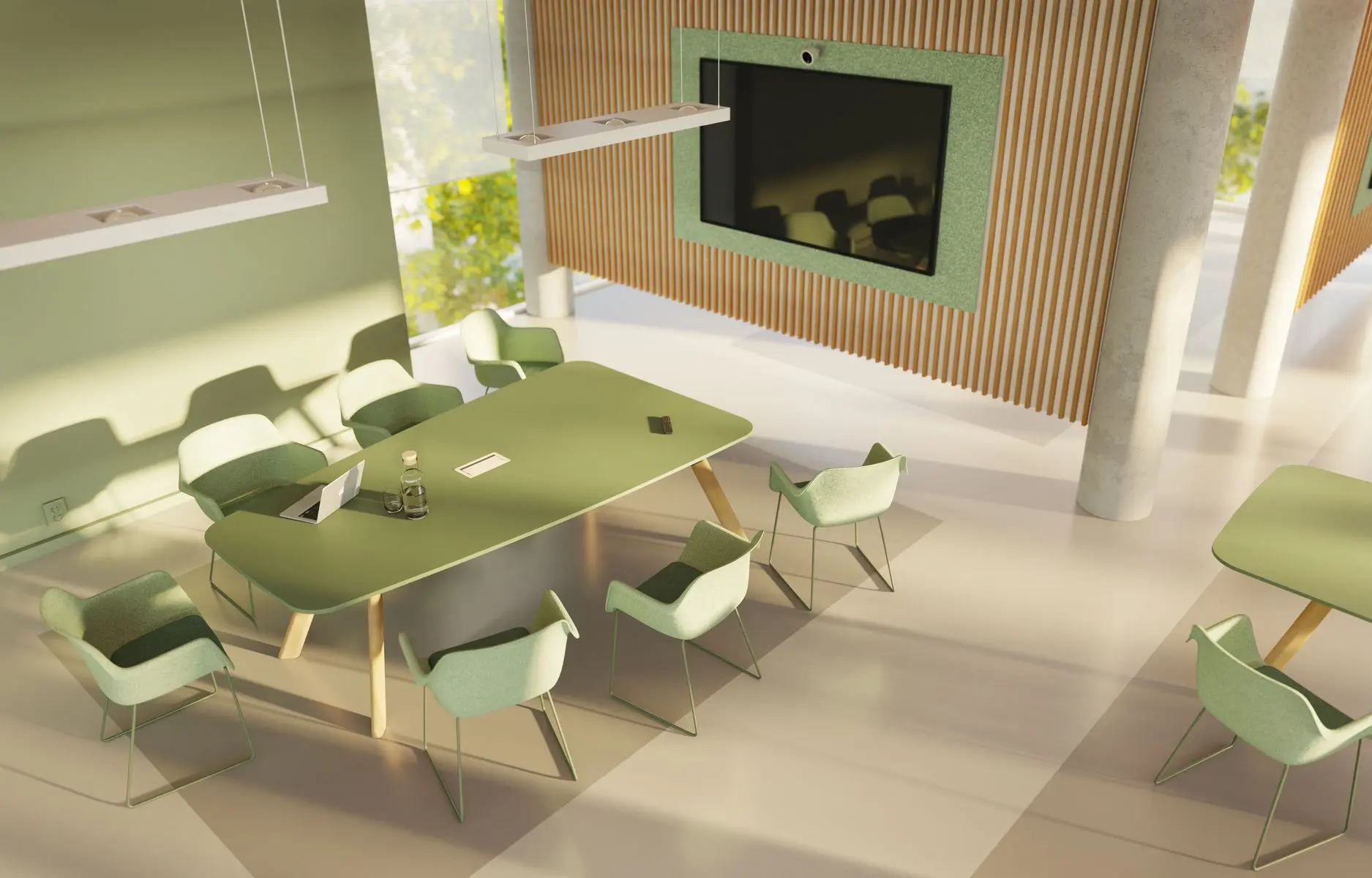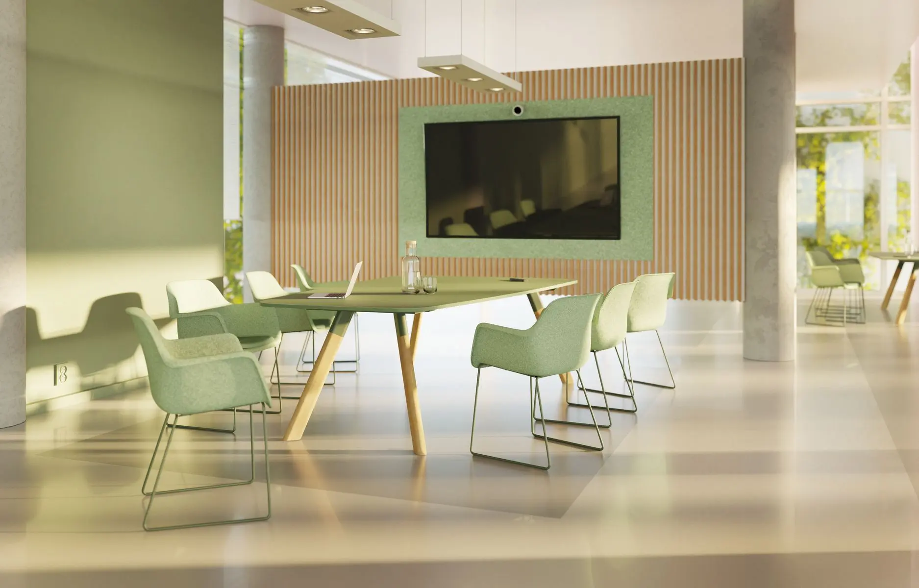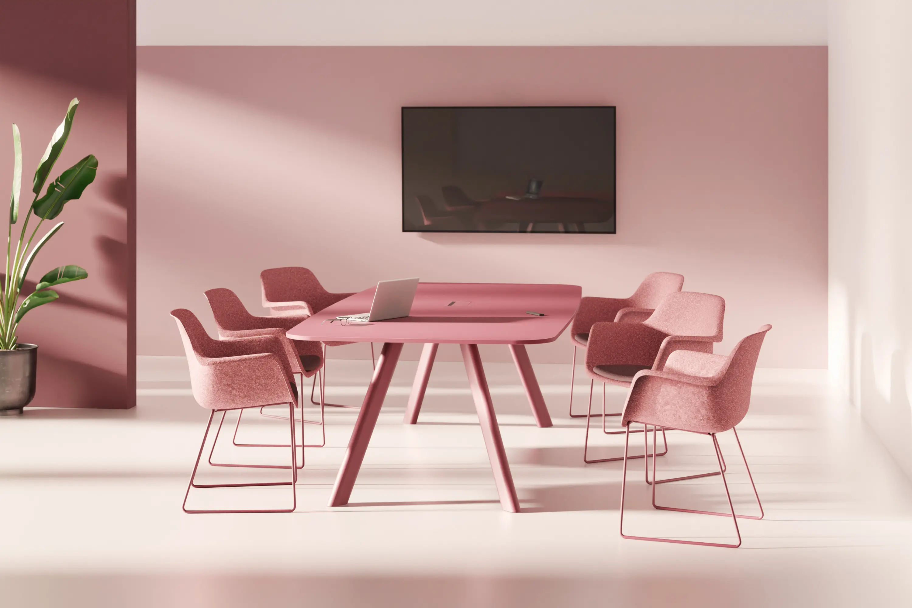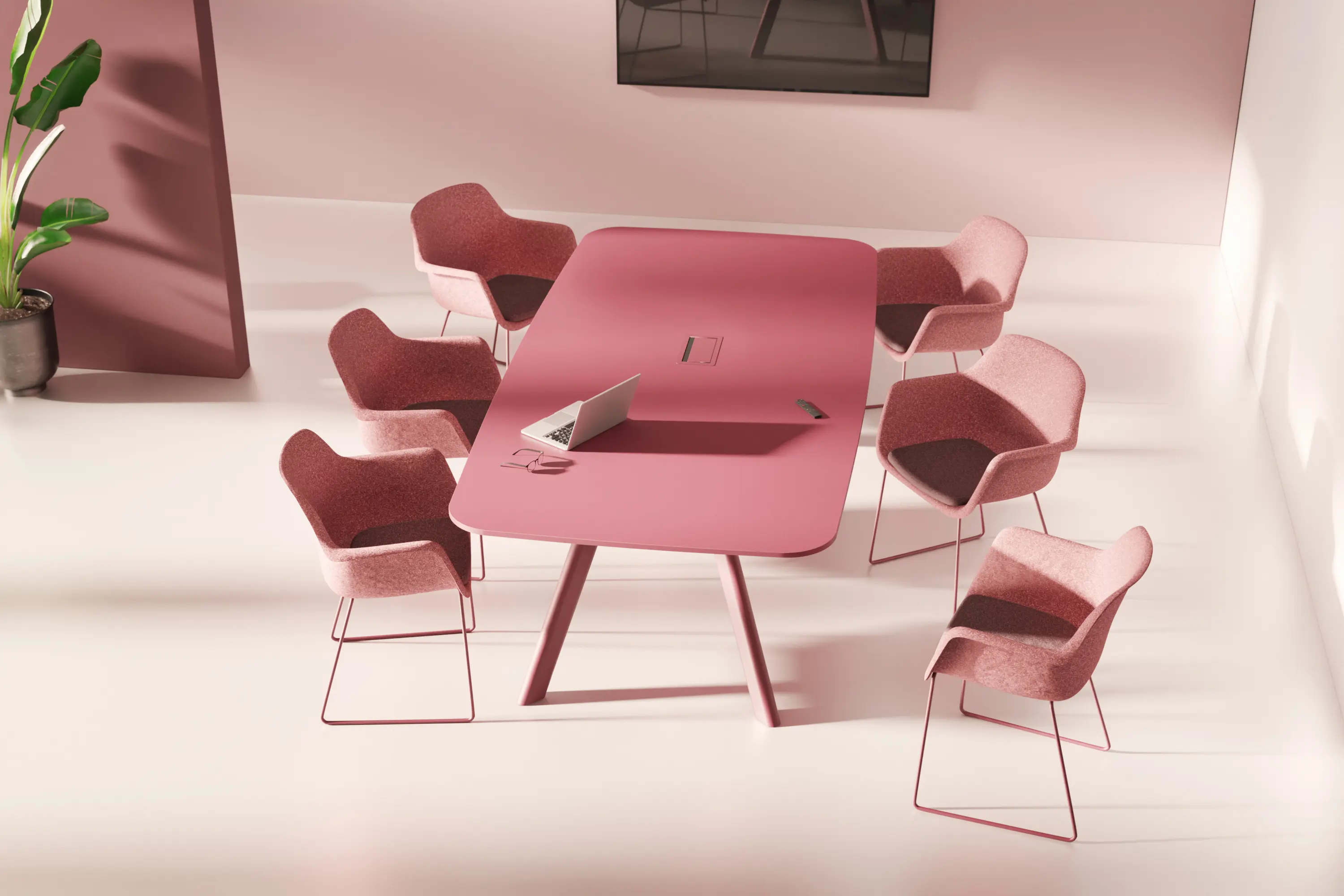 Contact was developed with video conferences in mind. The table with rounded edges is available in two versions: barrel-shaped for versatile meetings and trapezoidal for optimal visibility of the screen and camera perspective. The wide side of the trapezoidal table is straight, allowing two tables to be easily placed side by side. It is available with either a wooden or steel frame. Contact represents a design language that combines aesthetic appeal with social functionality and is available in many colours. Good design considers not only the space but also the people who use it.
