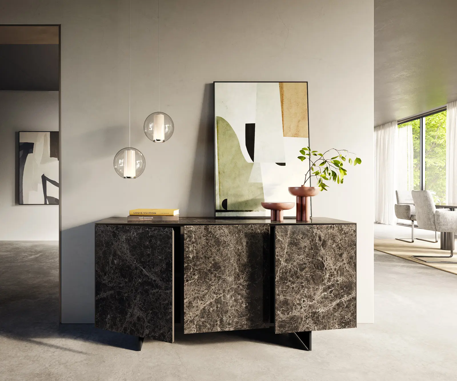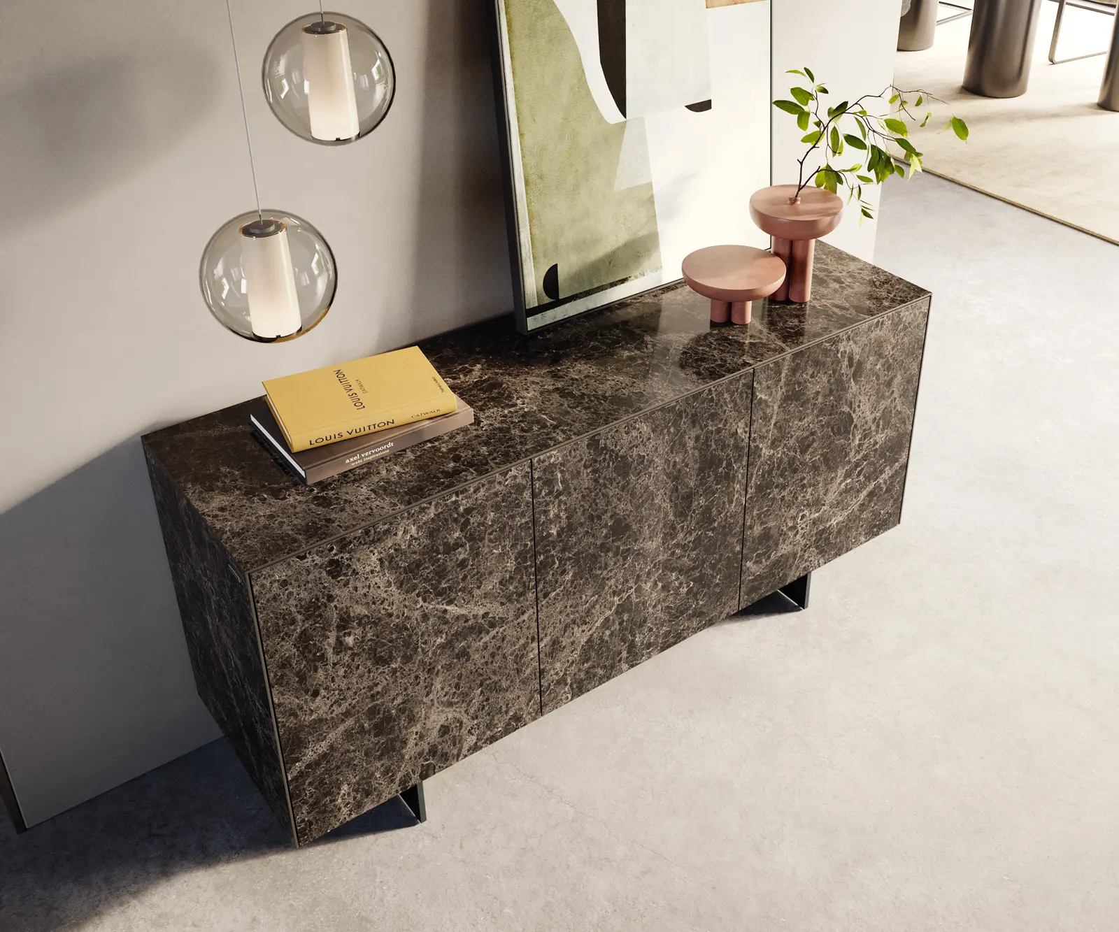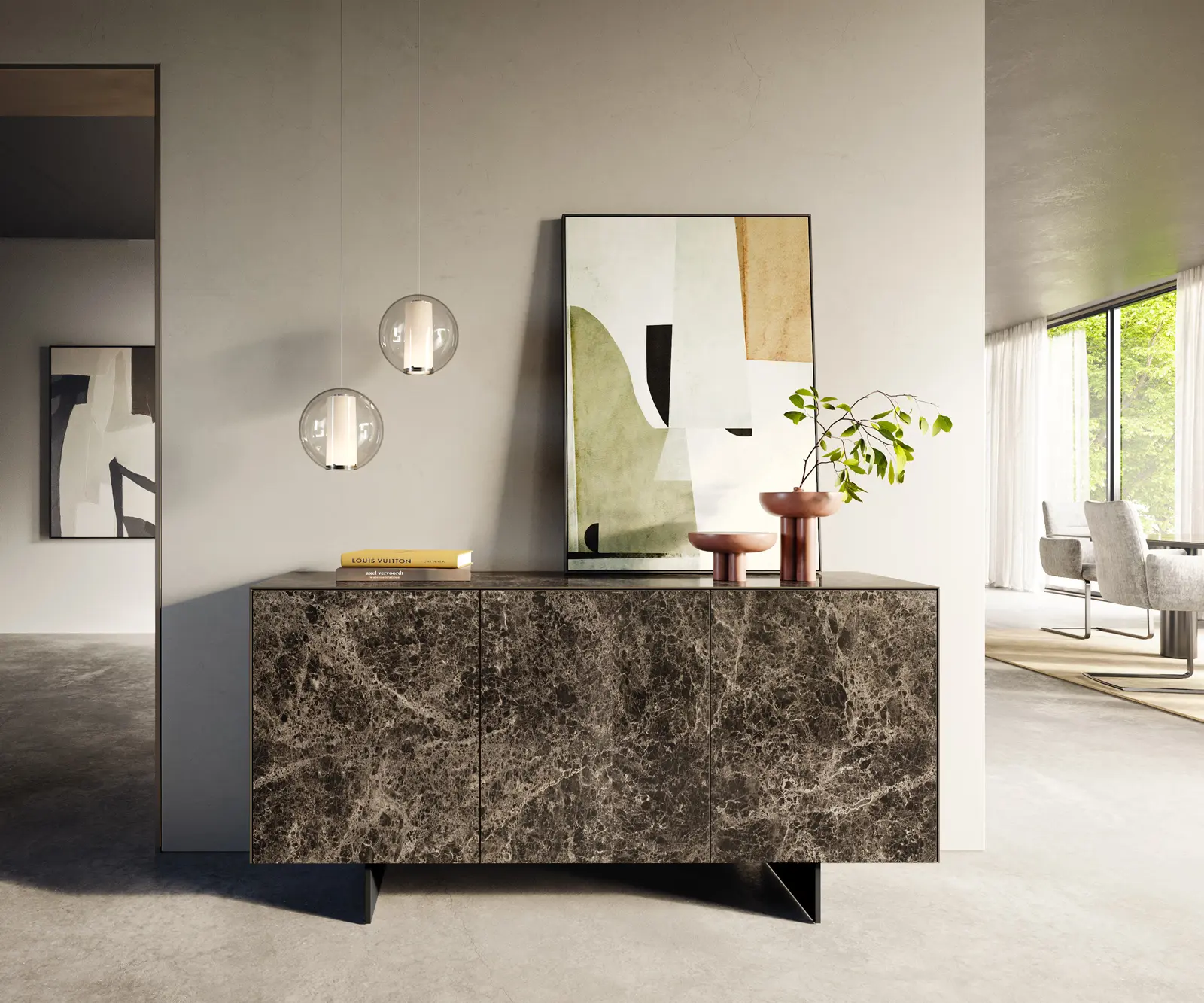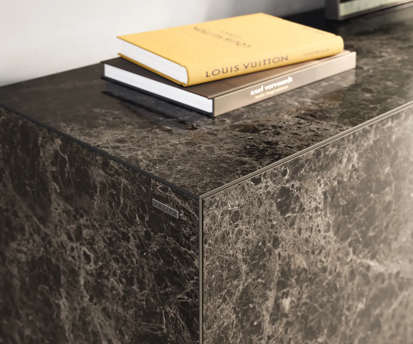 CUOR. Straightforward, powerful, timeless: CUOR embodies our passion for exceptional furniture. Crafted as if from a single block, the series merges premium ceramic with innovative technology and natural elegance. Deep brown tones and fine veining evoke the soul of dark marble, while delicate metal legs add a sense of lightness. CUOR is more than a sideboard – it’s an expression of character, style, and uncompromising aesthetics.