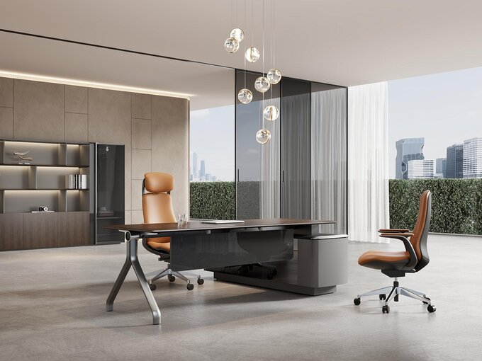 With a business-oriented aesthetic, this executive desk integrates high-quality materials and exquisite design. Inspired by automotive interiors, the desk exudes a sophisticated, opulent ambience suitable for office environments. The sleek Y legs imbue the desk with energy and dynamism. Natural materials create a warm and stable visual impression, while the synthetic panels and metallic elements impart a rational and composed atmosphere, reinforcing the product's texture and visual hierarchy.