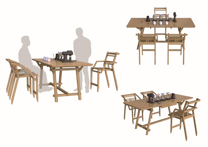Jinjin Hand Drip Coffee Table & Chairs create a convenient and comfortable atmosphere for brewing and enjoying coffee. The design inherits and extends the traditional structure of Chinese furniture, which is influenced by the characteristics of Moso bamboo. The chairs utilize natural, flexible bamboo strips that provide a resilient seating experience and elastic support for the spine. Four table legs, leveraging the elasticity of bamboo, secure the cross support for stability. Bamboo weaving is adhered to the bamboo composite tabletop with water-based glue, ensuring resistance to cracking. This furniture embodies a humble and rustic quality.