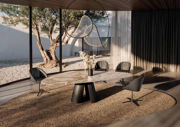 The “Kent” dining table reinterprets the classic dining area by breaking with symmetrical norms and creating an open, communicative atmosphere. The combination of cast aluminum and natural stone gives the table a sculptural, timeless look. The excellent workmanship underlines the claim to elegance and high quality.