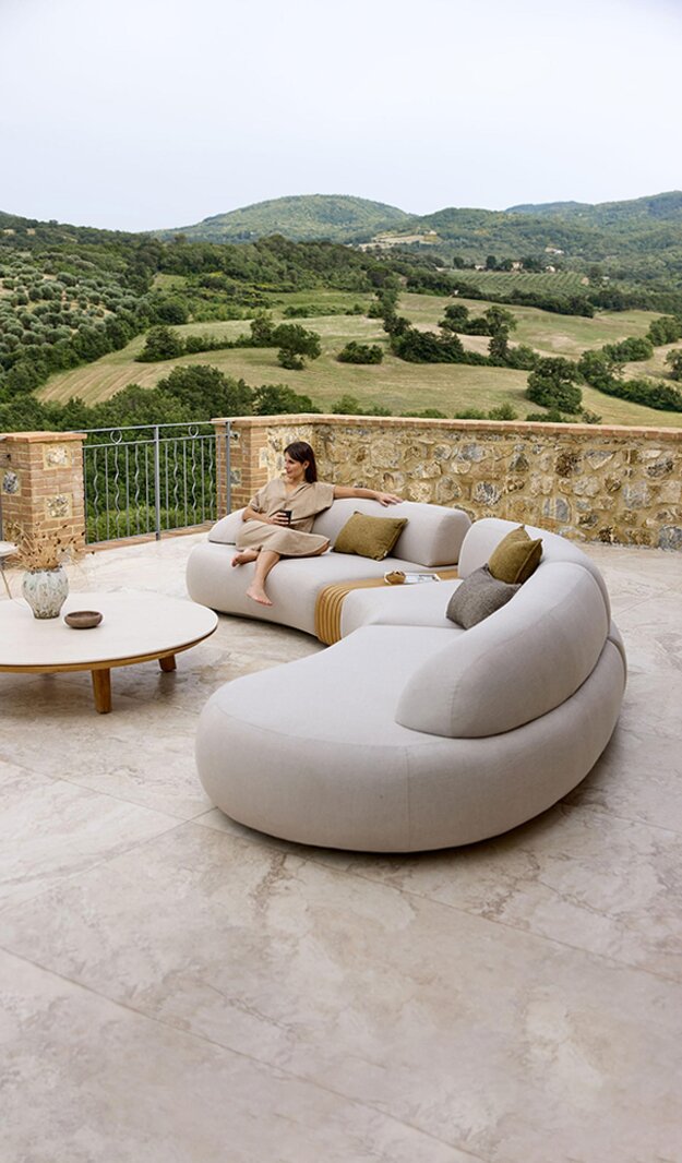 Mellow is an outdoor modular lounge series that harmoniously blend elegance and functionality. Its modular design offers endless possibilities for creating a personalized outdoor retreat, allowing you to configure the setup for your needs and wishes. The design lines of Mellow are curvy and sophisticated which exudes a feminine touch which naturally elevates any space. The modular pieces are fully upholstered in comfortable, UV-resistant fabrics, ensuring lasting beauty and comfort, even under the sun’s most intense rays. It includes Innovative QuickDry and Airflow system, which ensures quick drainage and use of the lounge after a downpour.