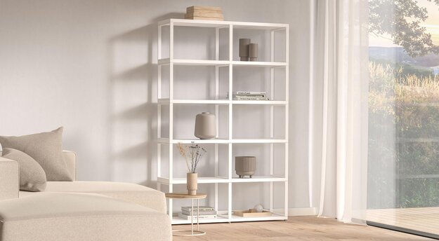 MAXX is a modular shelving system that can be customised in the 3D Shelf Configurator to suit individual needs in the home. The open side frames in white steel are particularly strong, and the sustainably produced shelf boards have a resistant surface. The system's modularity makes it extremely flexible and durable: elements can be added at a later date or the whole unit can be rearranged. This makes it versatile as a sideboard, bookshelf or room divider. The system was awarded the Best of Design Award 2024 by Schöner Wohnen magazine.