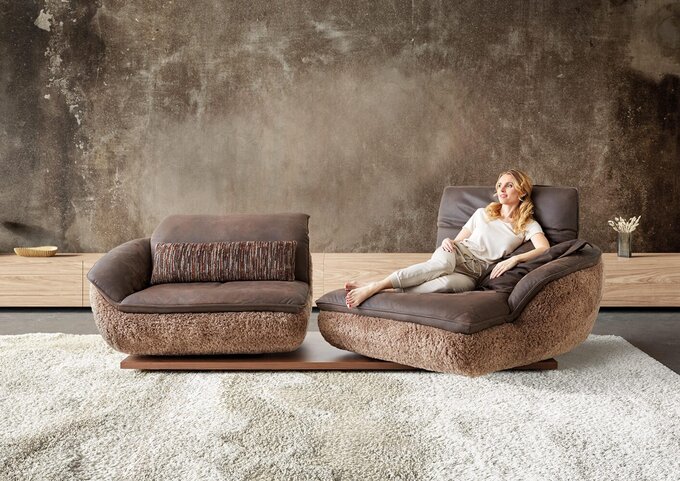 The organic design language of the seating units, paired with the wooden plateau, creates unmistakable accents. Well-proportioned elements and soft lines flow harmoniously into one another and provide an exciting contrast to the consistent clarity of the plateau. Voluminous seats invite you to linger and relax - an oasis of relaxation. The highlight, however, is the finely adjusted functional unit, which lulls the owner into an atmospheric sense of calm. Pleasant, fluid movements are integrated into the elegant design and can be easily locked in your favorite position with your little finger. MOOOVE - rocking, pushing, turning.