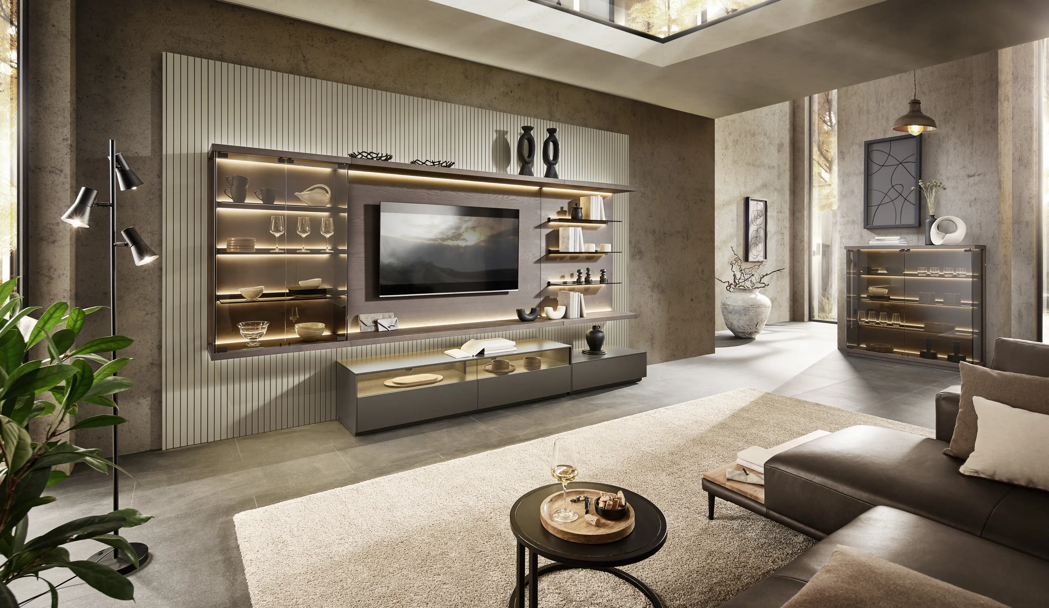 The Muro wall unit combines elegant design, integrated functionality, and top-quality craftsmanship. Made in Europe, it impresses with fine materials, a clear design language, and customizable options in high-quality wood and lacquer finishes that can be mixed and matched. The hidden cable management ensures a clean overall look. The modular system with open, closed, and dust-proof elements, frameless glass display cases, as well as variable low and highboards, offers versatile use. The adjustable grooved back panel grows systematically with the space. Dimmer-controlled, glare-free LED ambient lighting creates atmospheric light scenes.