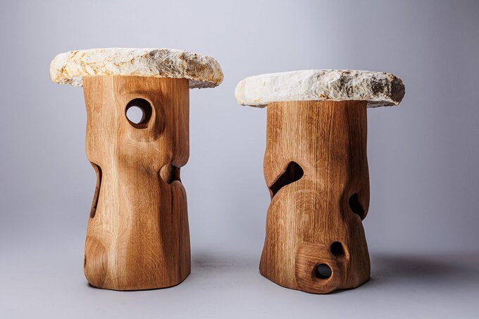 "Symbiosis in Form" is a sculptural table and stool set that merges reclaimed wood with mycelium, a biodegradable material grown from sawdust waste. This project transforms discarded materials into functional, aesthetically compelling objects, highlighting the symbiosis between nature and design. The base, sculpted from recycled lumber, contrasts with the mycelium tops, creating a striking interplay of textures. By utilizing sustainable materials, the project promotes a circular economy, where waste is repurposed, and mycelium, a carbon-negative material, decomposes naturally, emphasizing eco-conscious design.