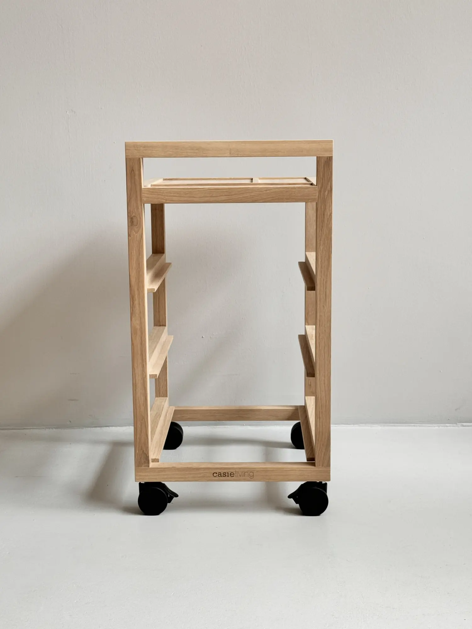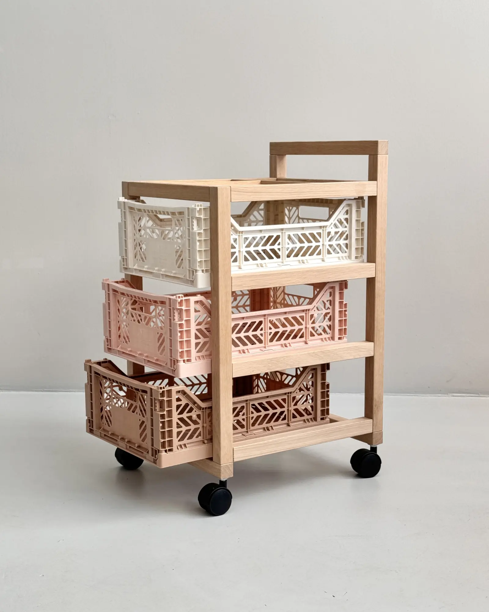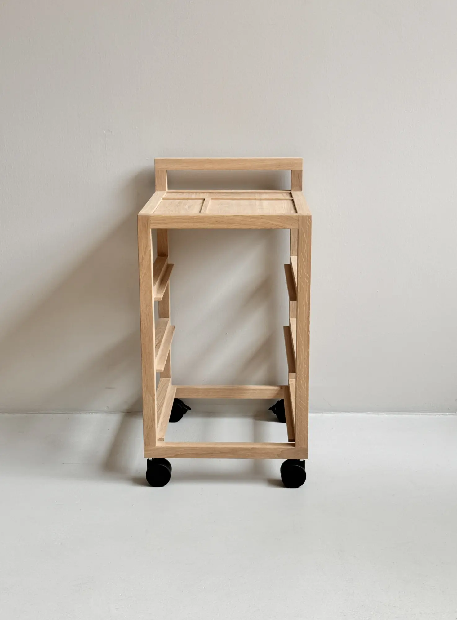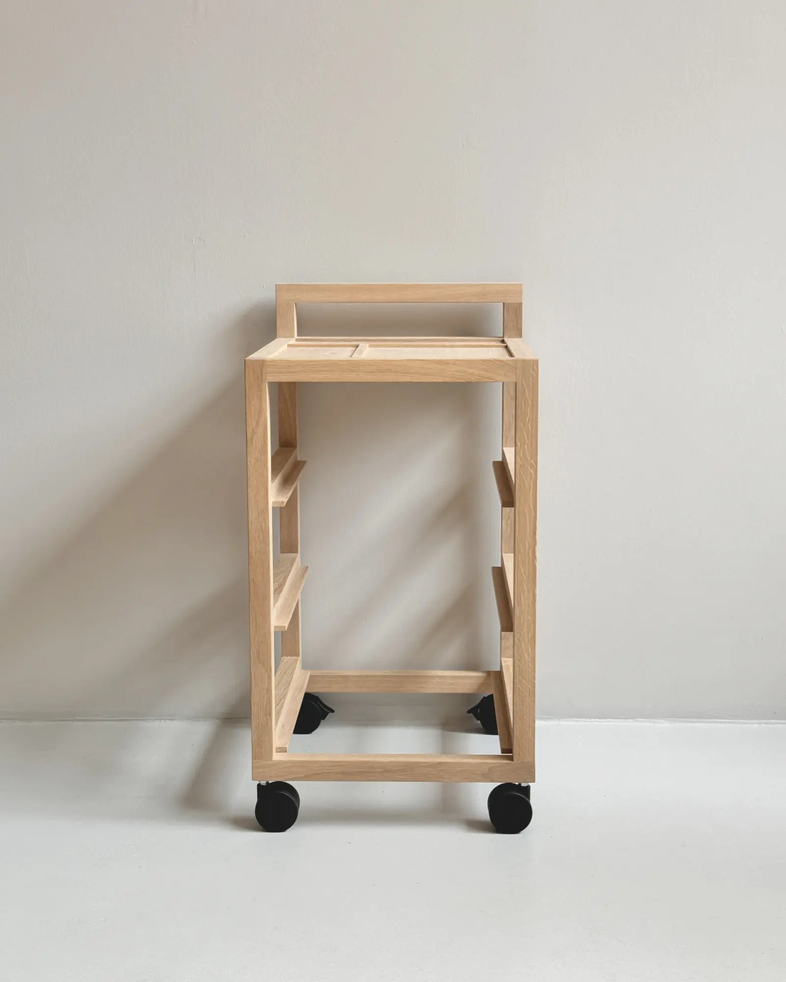 The Trolley – Mobile Storage Frame Unit H3 is a mobile storage system crafted from solid oak, designed without screws and stabilized solely through form-fitting joints. Grooved rails hold the folding crates like drawers, turning functionality into a key design element. Its modular concept allows variable combinations and colour adaptations, conserving resources and promoting longevity. With a clear formal language, reduced aesthetics, and high mobility, the trolley unites innovation, sustainability, and contemporary flexibility – offering a versatile solution for modern living and working environments.