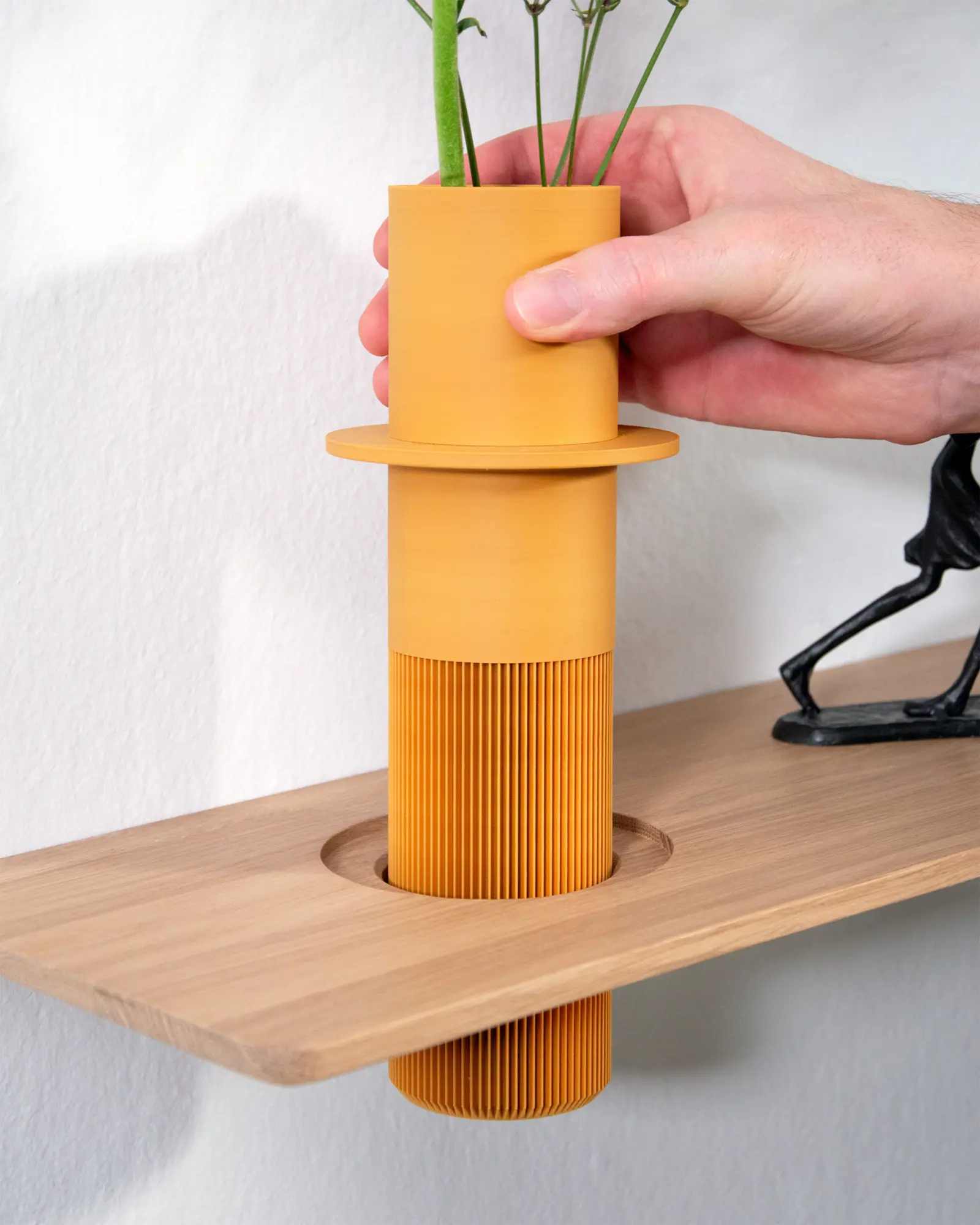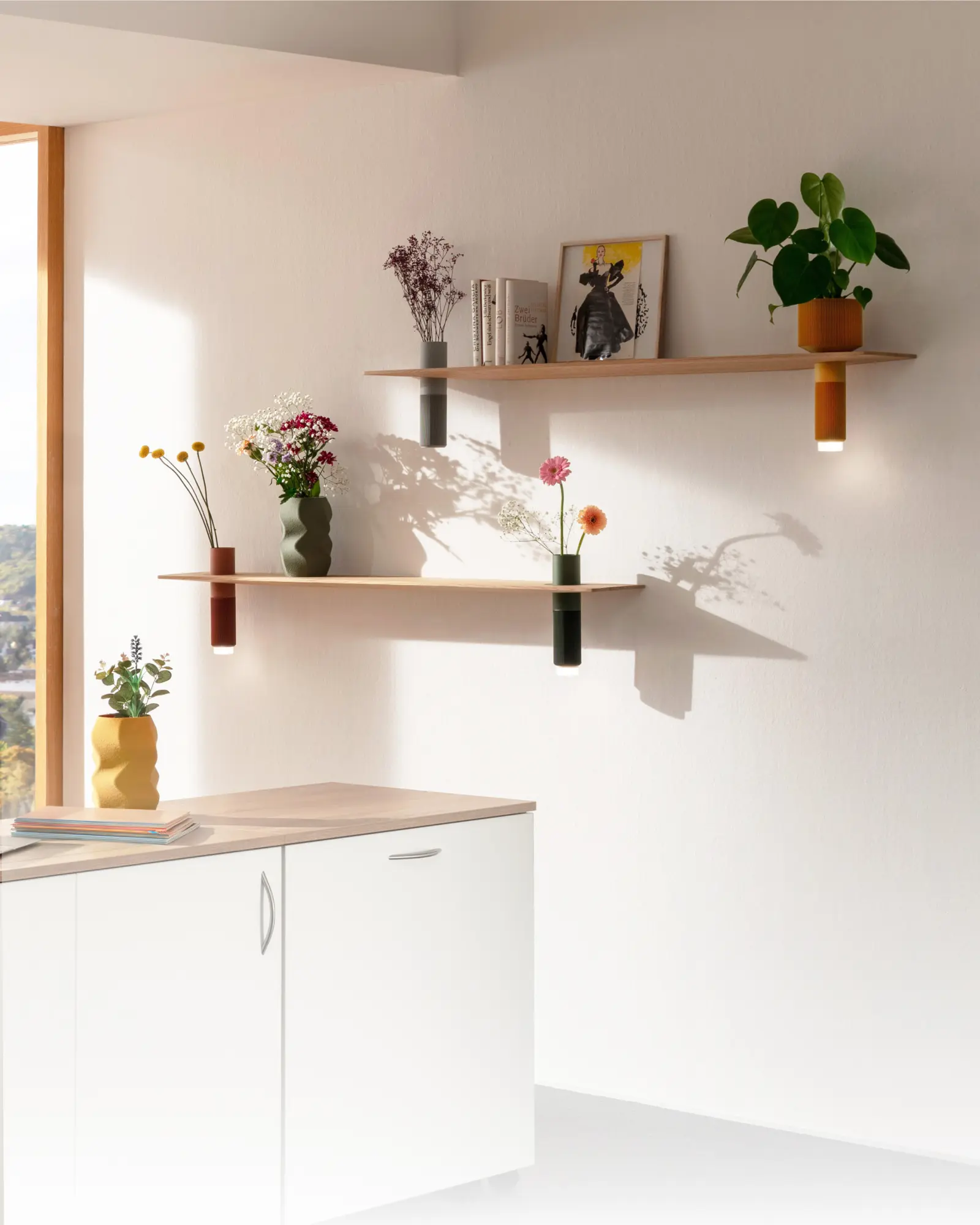 The world's first shelving system with an integrated vase for safe and special interior greenery. The perfect solution for more liveliness in the living space - guaranteed safety for parents with small children or owners of pets such as cats. The design of the vaseboard combines functionality with aesthetics. It sets accents and gives every room a unique atmosphere. Thanks to our three-part modular system, the modular vase can be easily screwed together. Simple, flexible and, above all, completely in your own style. This means that different colours and designs can be combined. Endlessly flexible. Expandable for the kitchen and wardrobe.