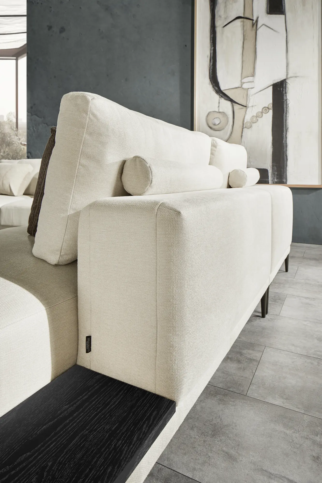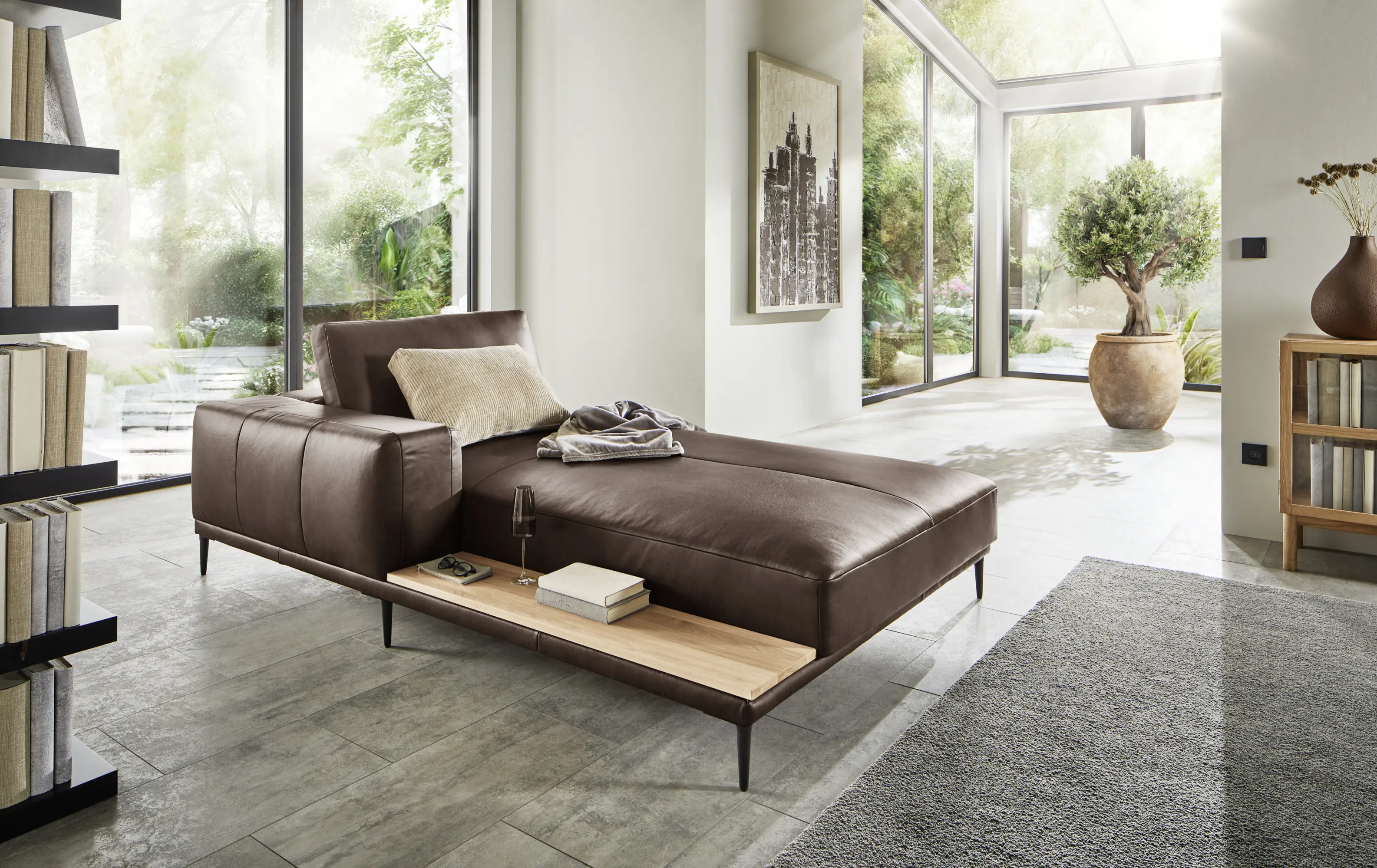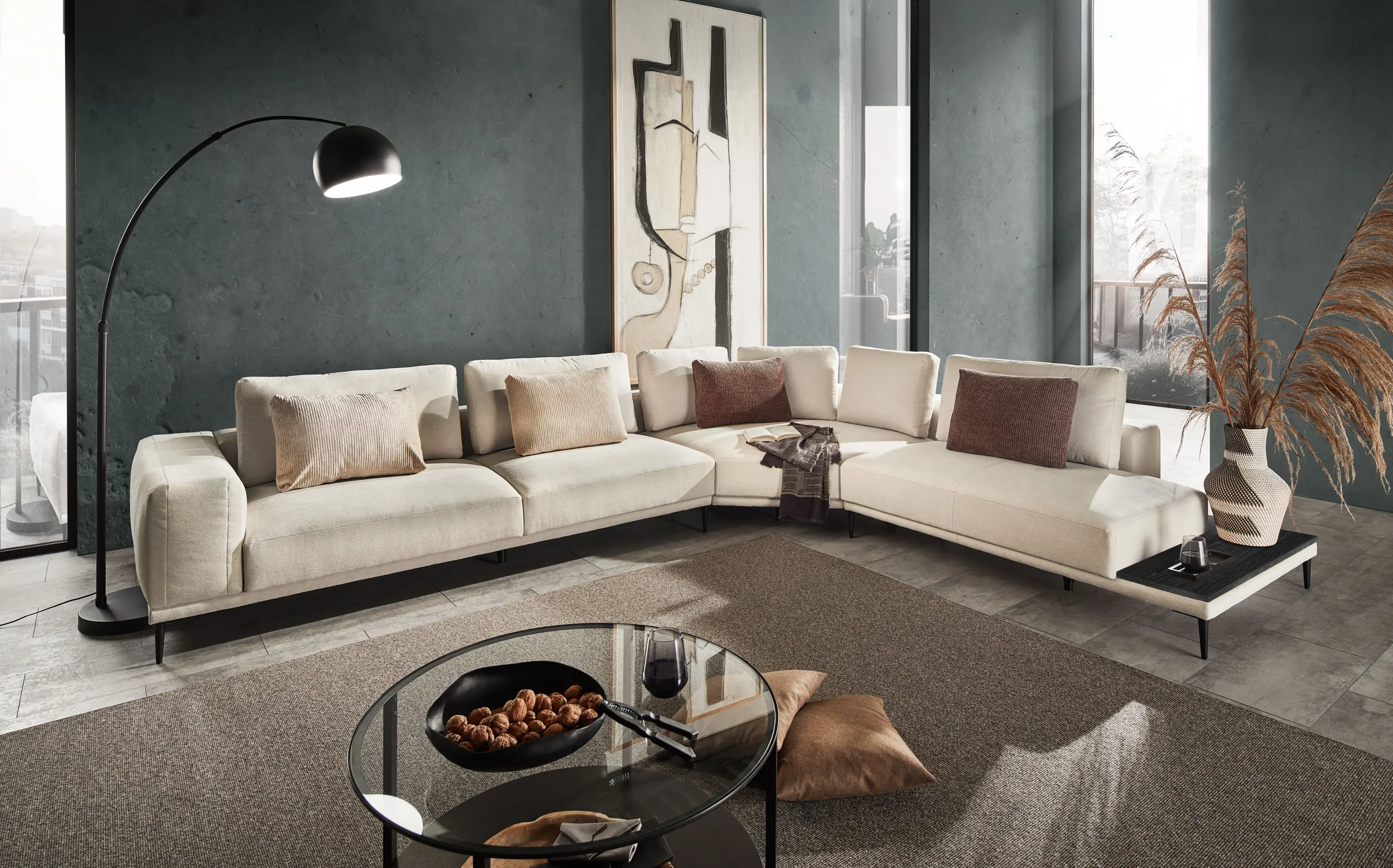 Veduta is a custom-configurable living landscape that combines Italian flair with German precision. It impresses as a versatile sofa system ranging from compact versions to spacious layouts, including an innovative 45° corner module. Despite the reduced height of the continuous back and armrests, the inserted anti-tilt back cushions ensure a comfortable seating height. A multi-layer cold foam construction provides high seating comfort. Craftsmanship-intensive seam details and an upholstered frame in leather or fabric emphasize the quality. Attached tables made of solid oak allow the sofa to blend harmoniously into the living area.