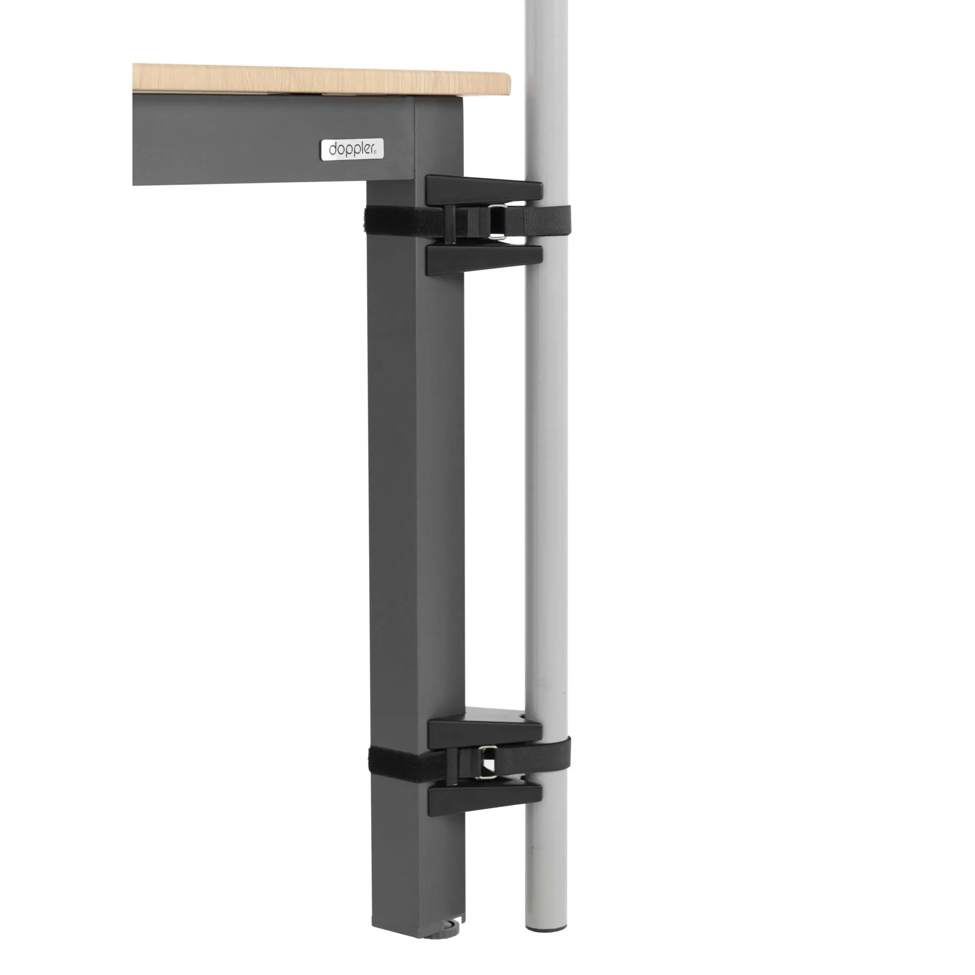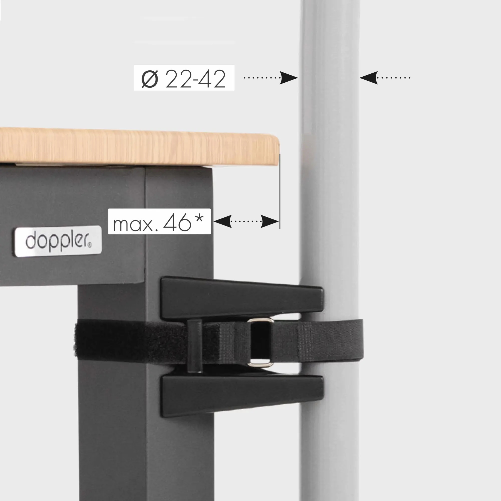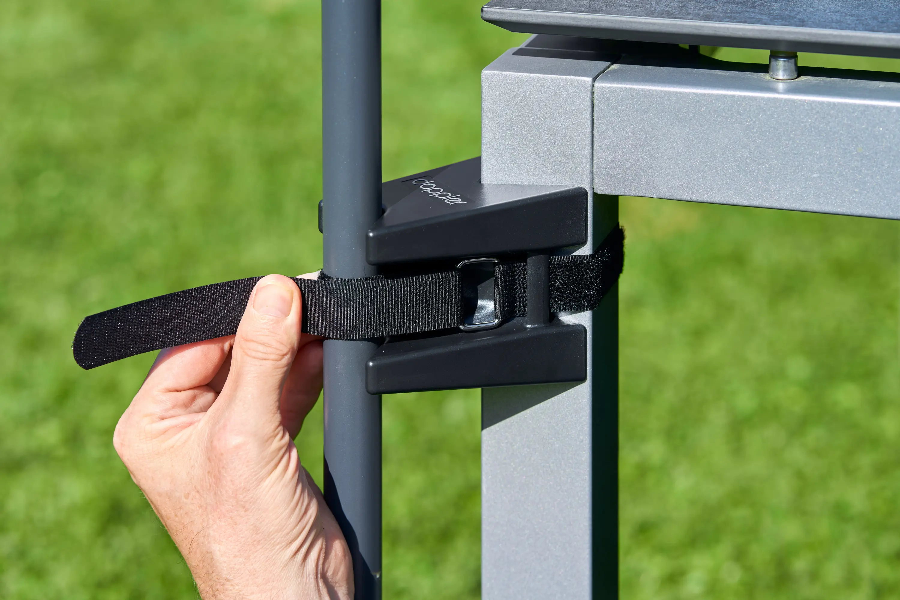 Table-Fix offers a simple and aesthetic way of attaching the parasol directly to the leg of the garden table. This saves space, avoids tripping hazards and reduces material consumption compared to the large, conventional parasol stands. Two holding elements with a V-shaped opening and a strap each ensure a firm connection between parasol and table. With the Velcro strap, the fastening set can be easily adapted to different table leg sizes and parasol tube diameters. The simple assembly allows flexible attachment depending on the position of the sun. This eliminates the need for bulky, heavy stands.