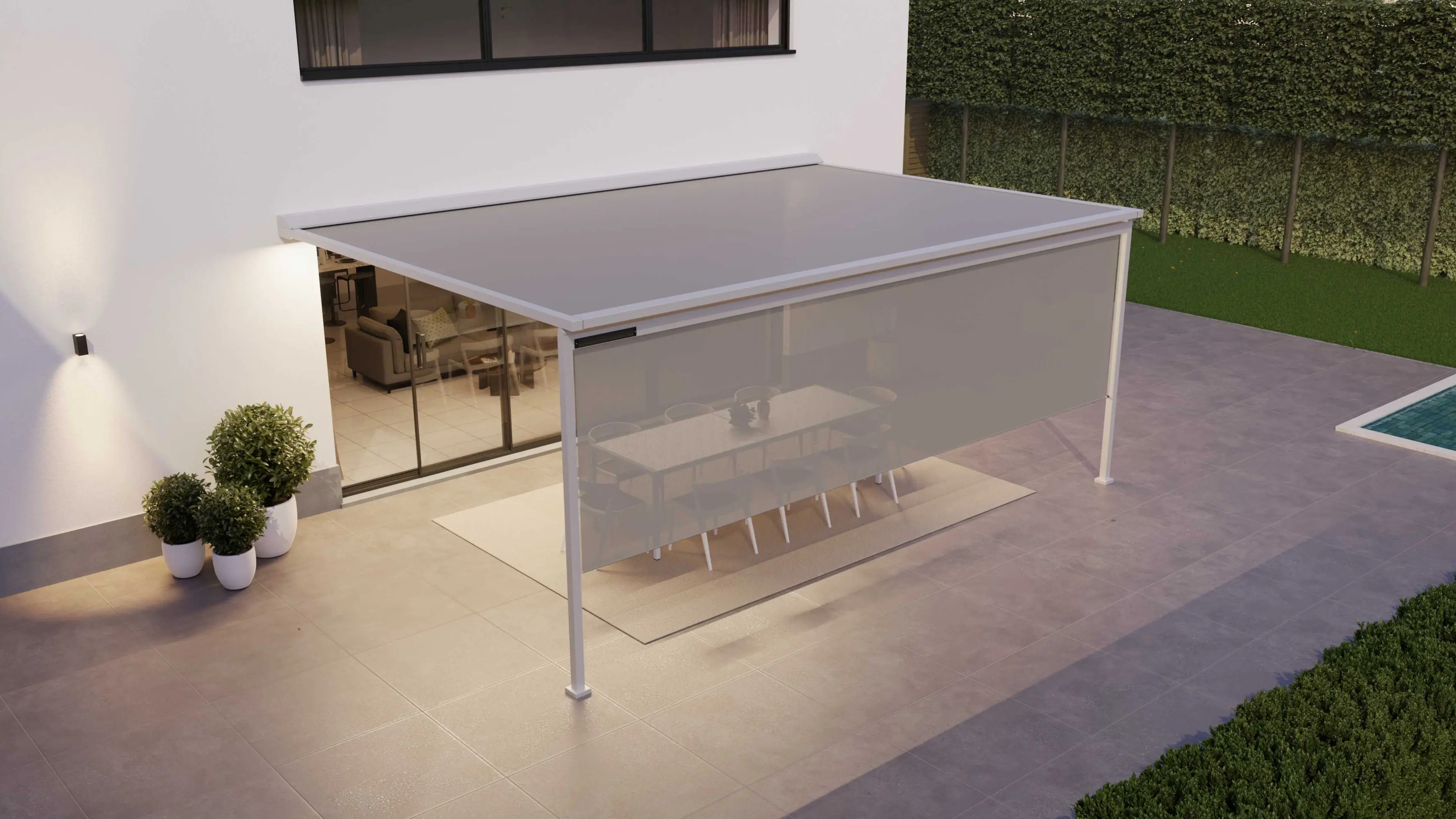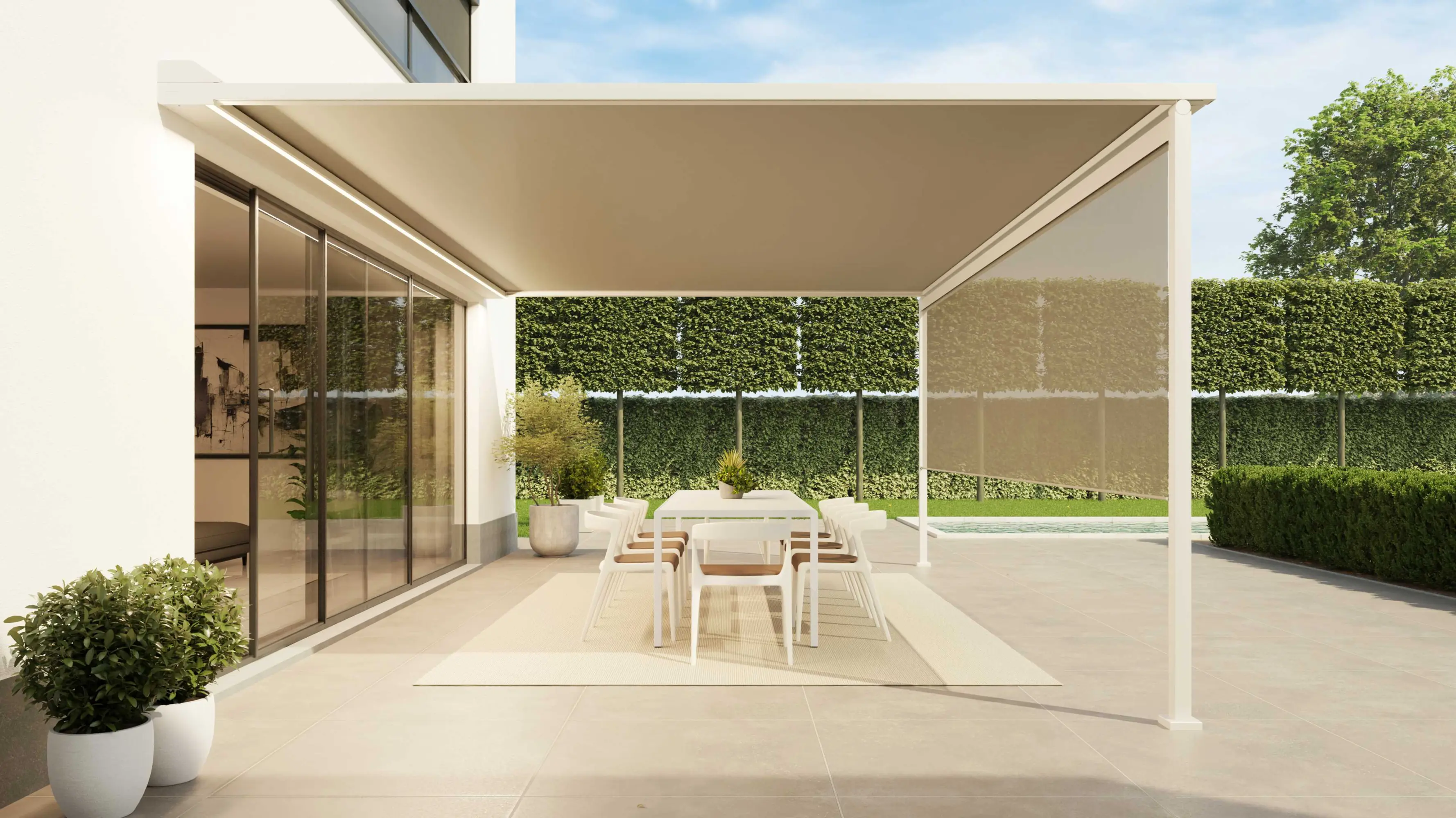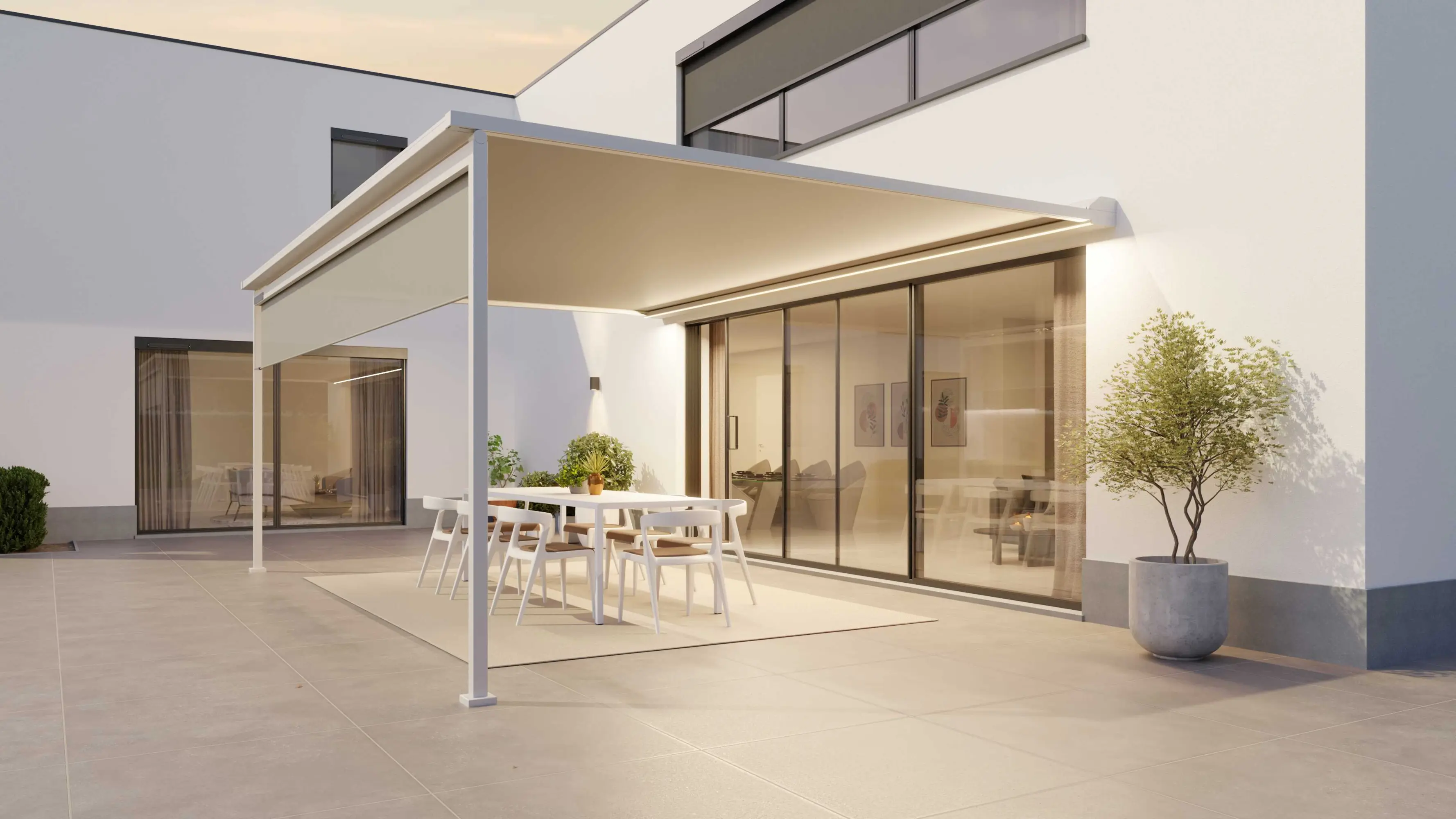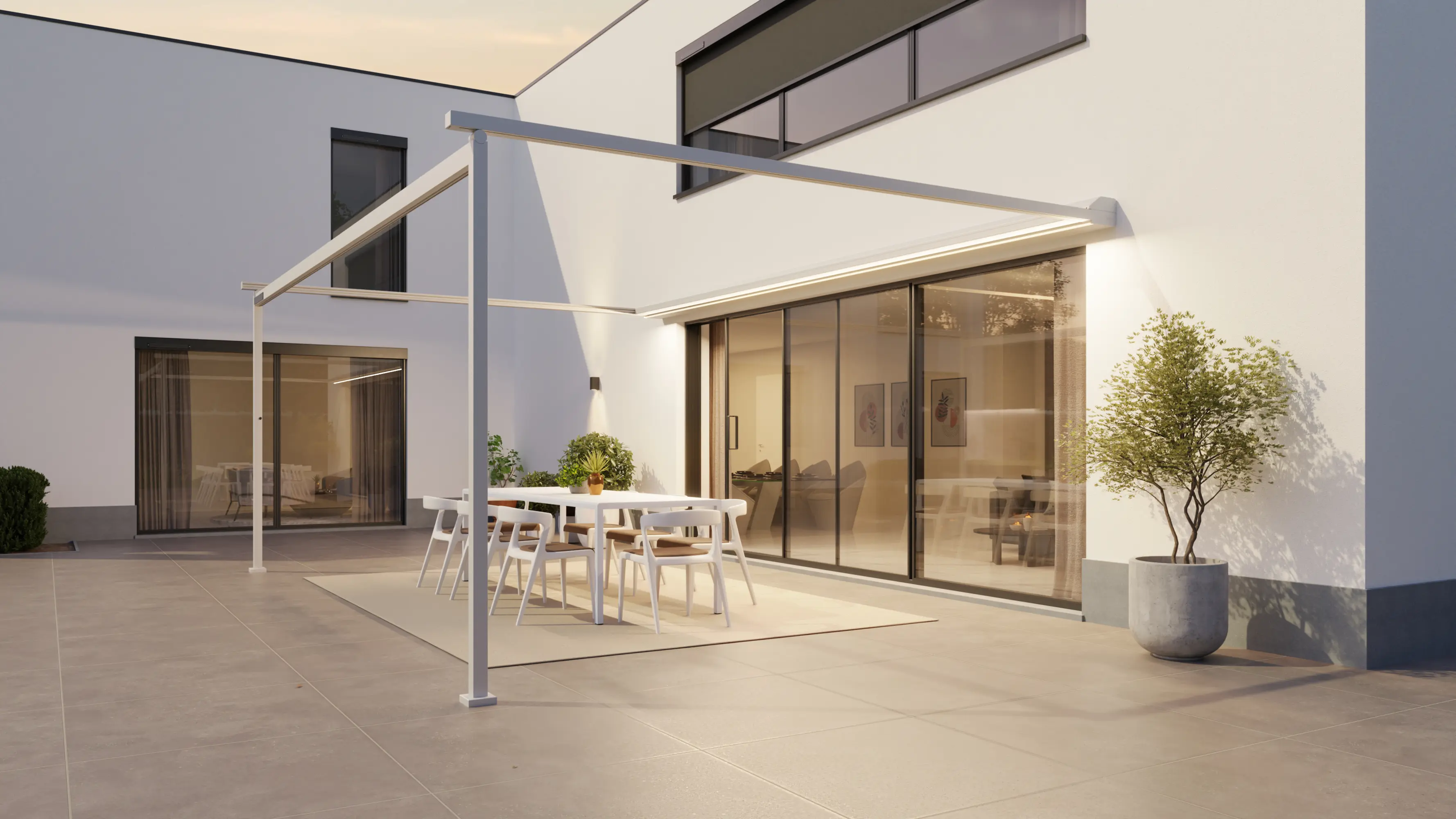 Versuz Linea is a stylish, horizontal terrace awning that blends minimalist design with high functionality. Mounted seamlessly against the façade, it features adjustable vertical posts for flexible installation on any patio. The horizontal construction ensures a sleek, architectural finish that integrates perfectly with modern homes. The solar-powered Vario valance provides effective protection from low sun and curious onlookers, ensuring optimal comfort and privacy throughout the day. Its motorised system operates autonomously via solar energy, making installation simple and energy-efficient — no wiring required.