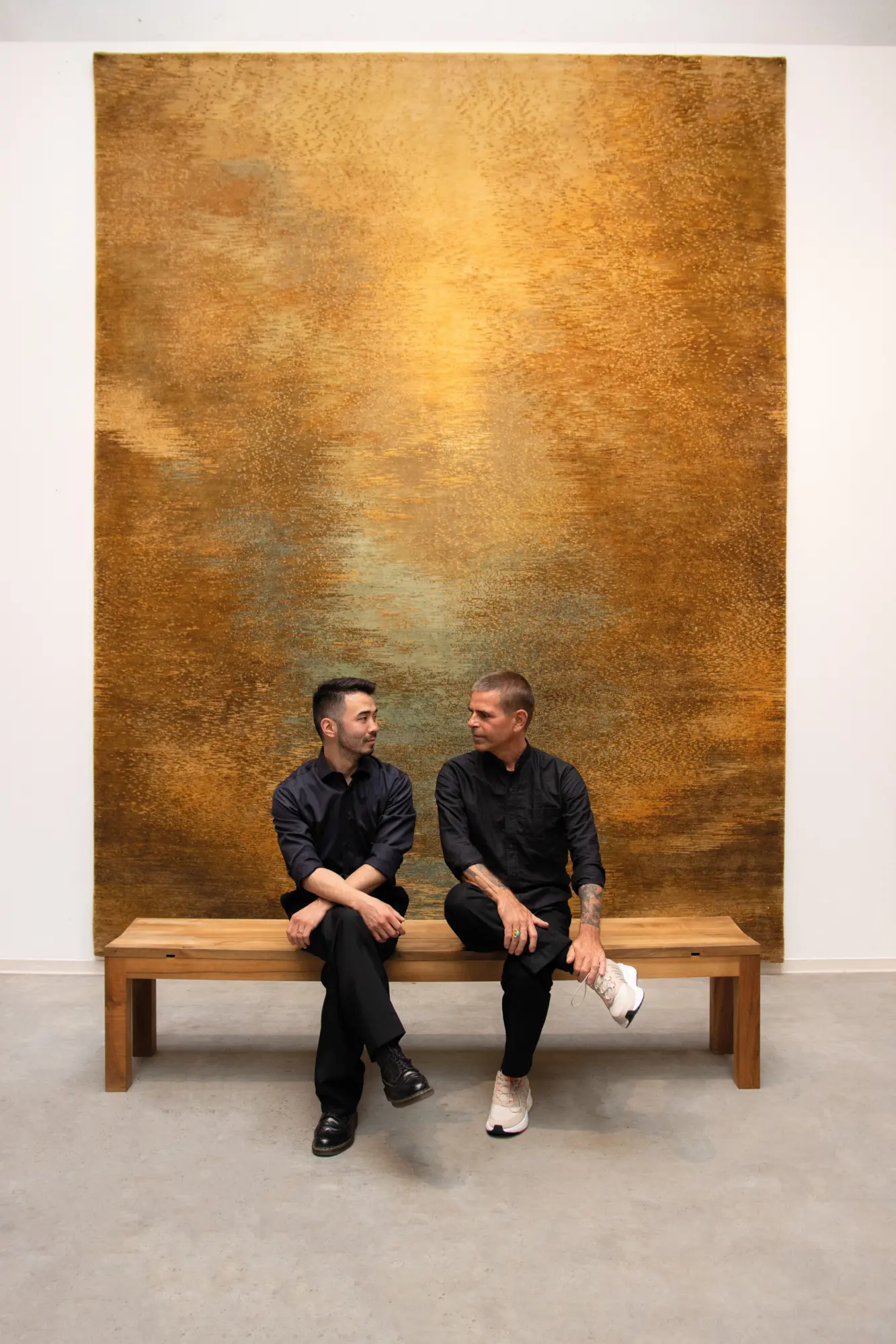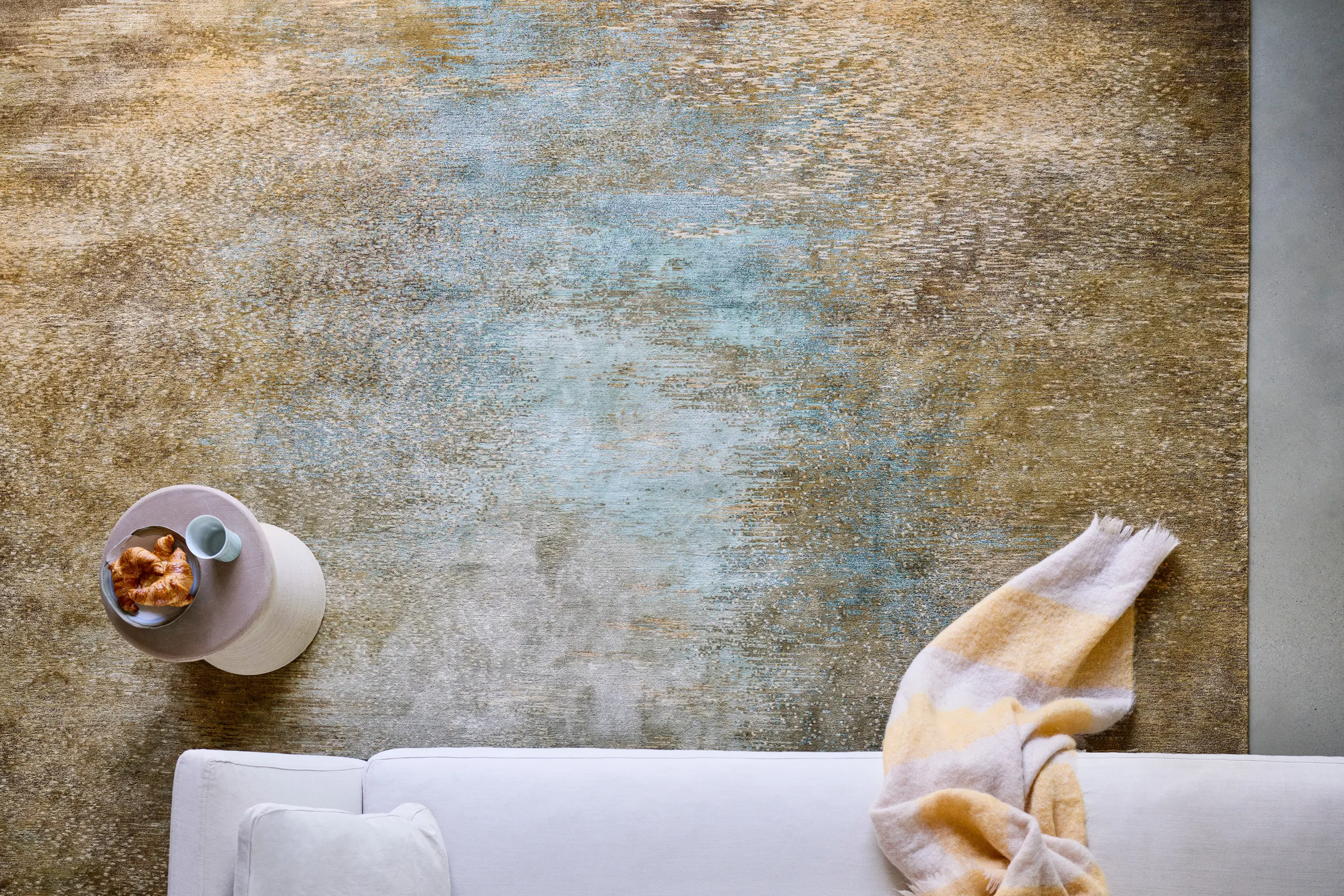 The DOTO carpet in the Cyprinus collection translates the flowing movements and shimmering reflections of the sea into textiles. It is manufactured in a centuries-old tradition. Only natural materials such as hand-spun Tibetan highland wool, Nepalese nettle and Chinese silk are used in the knotting process, which takes around four months. This high-quality material mix of the carpet offers a special feel as well as a subtle lustre and provides visual depth and high durability.