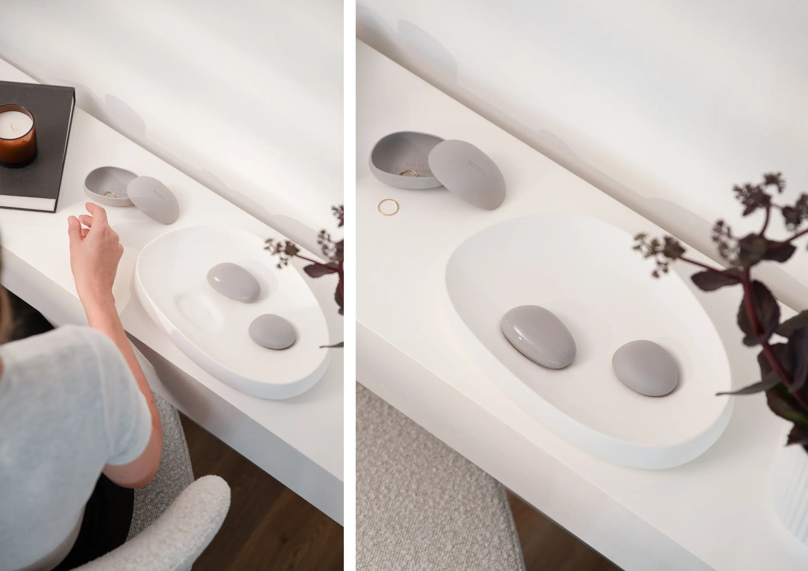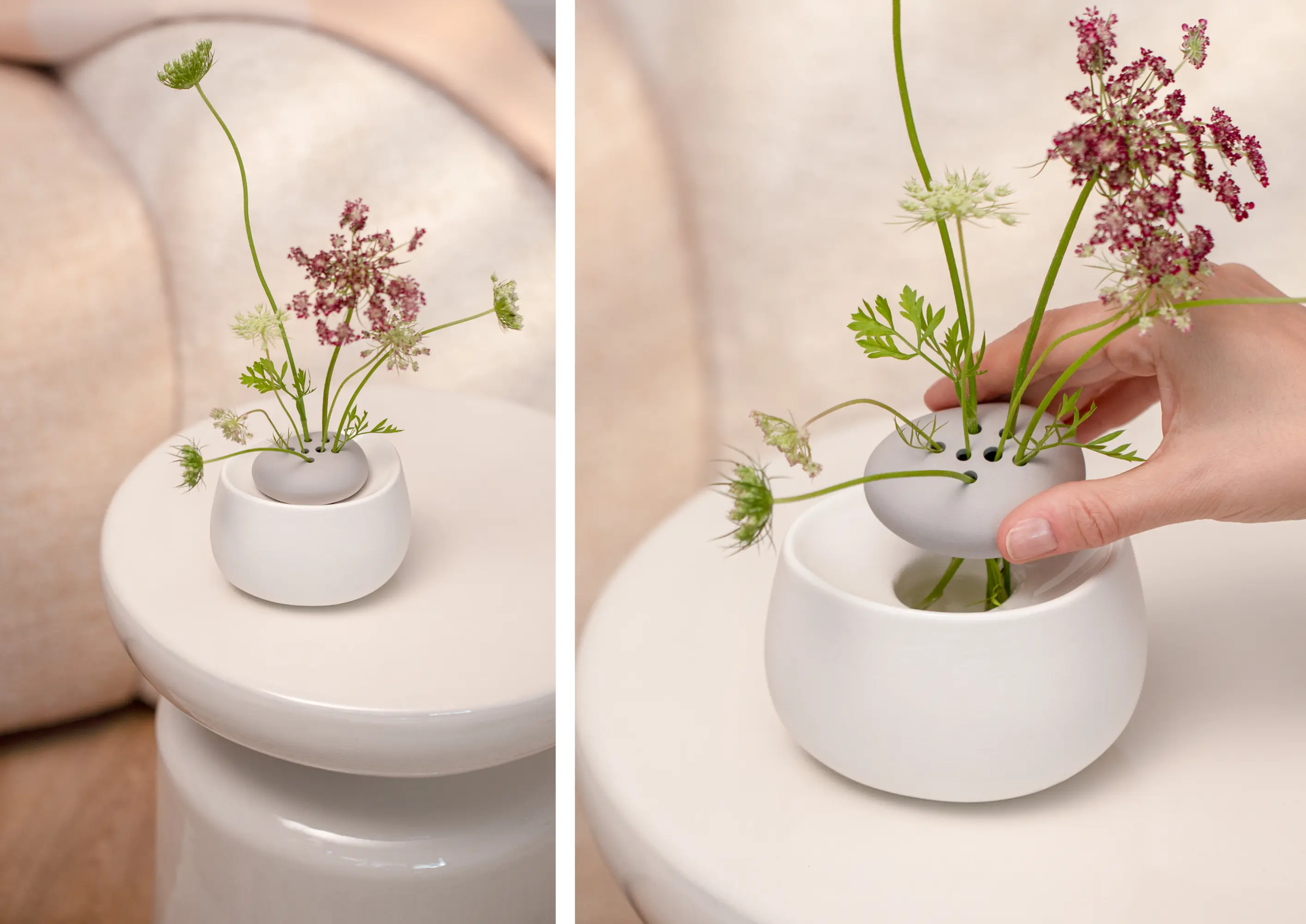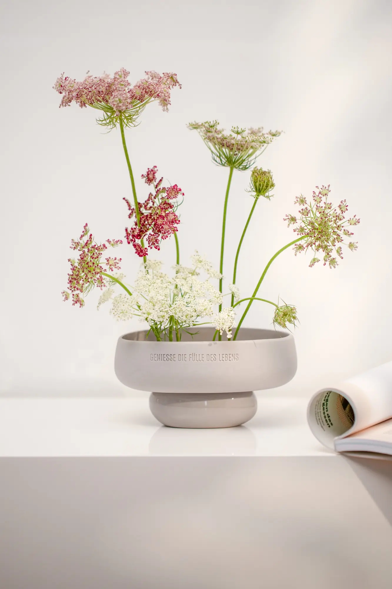 The Räder Natural Elements collection stands for simplicity with depth, for design that allows rooms to breathe. The shapes in the collection reflect the language of nature: soft and asymmetrical, like pebbles shaped by water. Made from robust stoneware, with a play of glazed and matt surfaces, the products are also a tactile experience. The consistent design language offers maximum freedom of combination. The colour scheme is also gently restrained, allowing the form to take centre stage: warm grey and natural white interact harmoniously. The Ikebana elements provide an artistic framework for the collection.