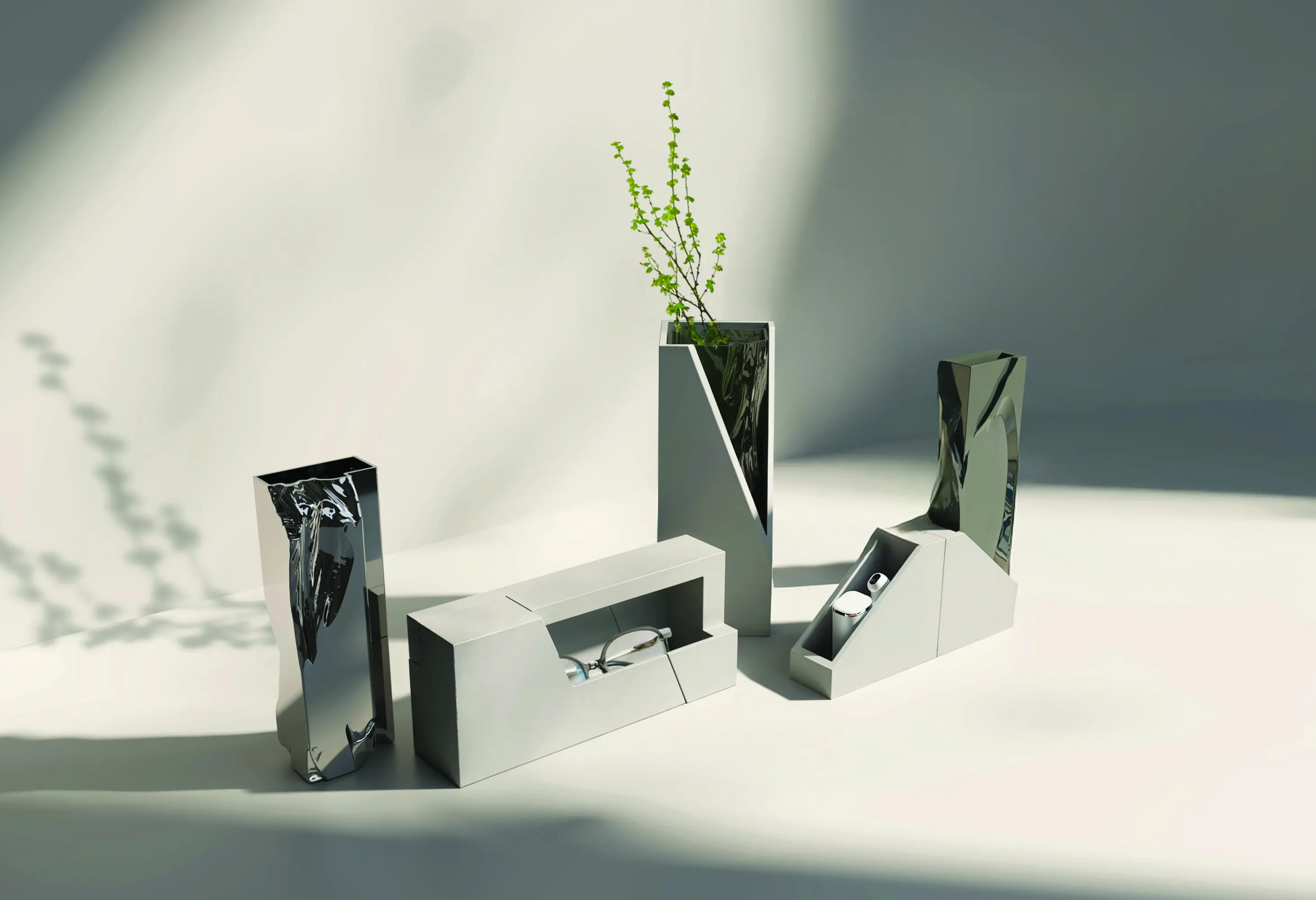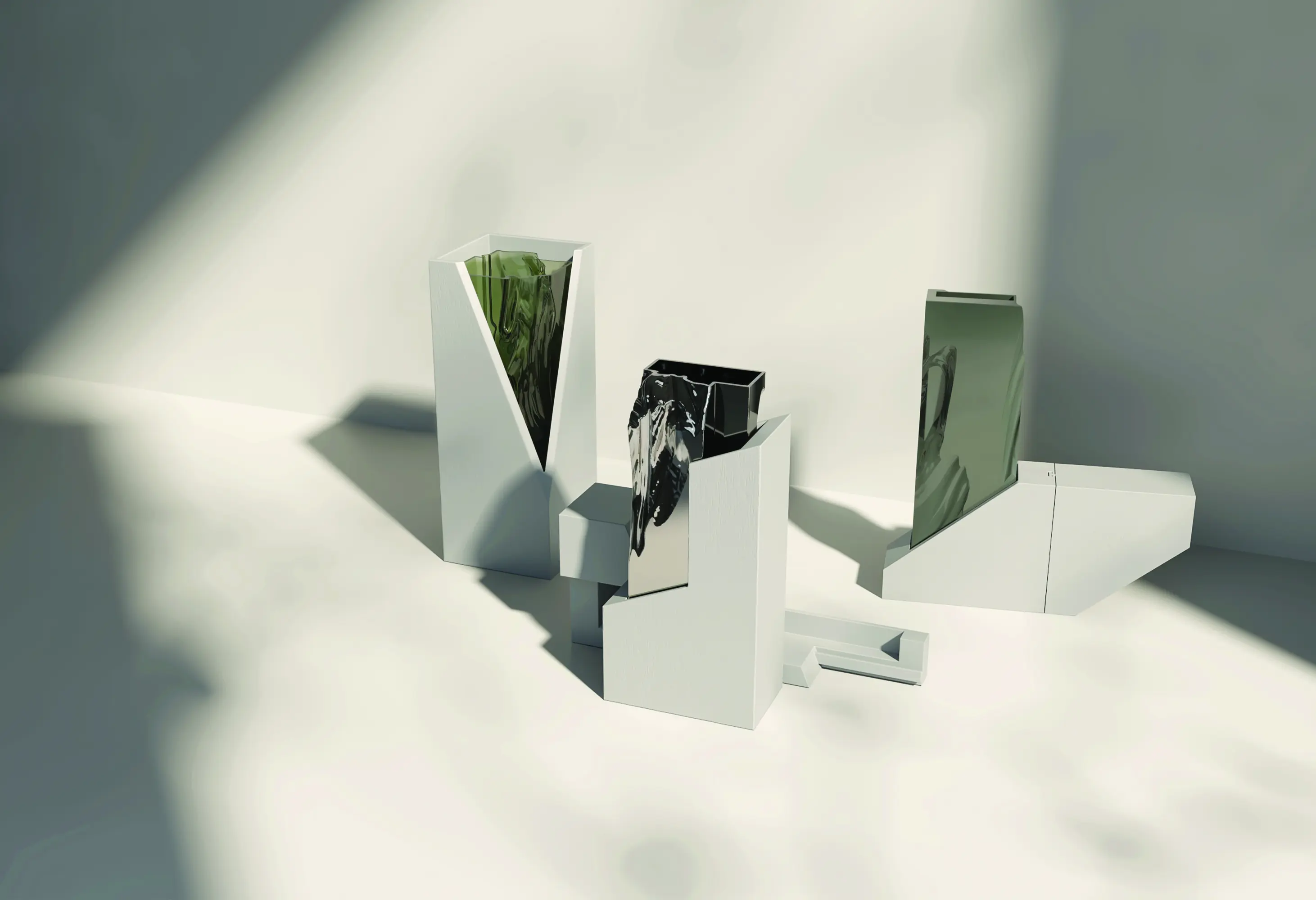 Unearth is a trio of vases that explores sustainable design through material reuse and sensory interaction. Each piece combines a painted reclaimed wood shell with a distinct inner core - transparent, opaque, or reflective - revealing contrasts in texture, light, and tactility. Designed for disassembly and reuse, the vases offer three unique methods of opening, encouraging active engagement. Unearth reimagines recycled materials not as waste, but as vessels of meaning, inviting reflection on care, ritual, and transformation in everyday life.