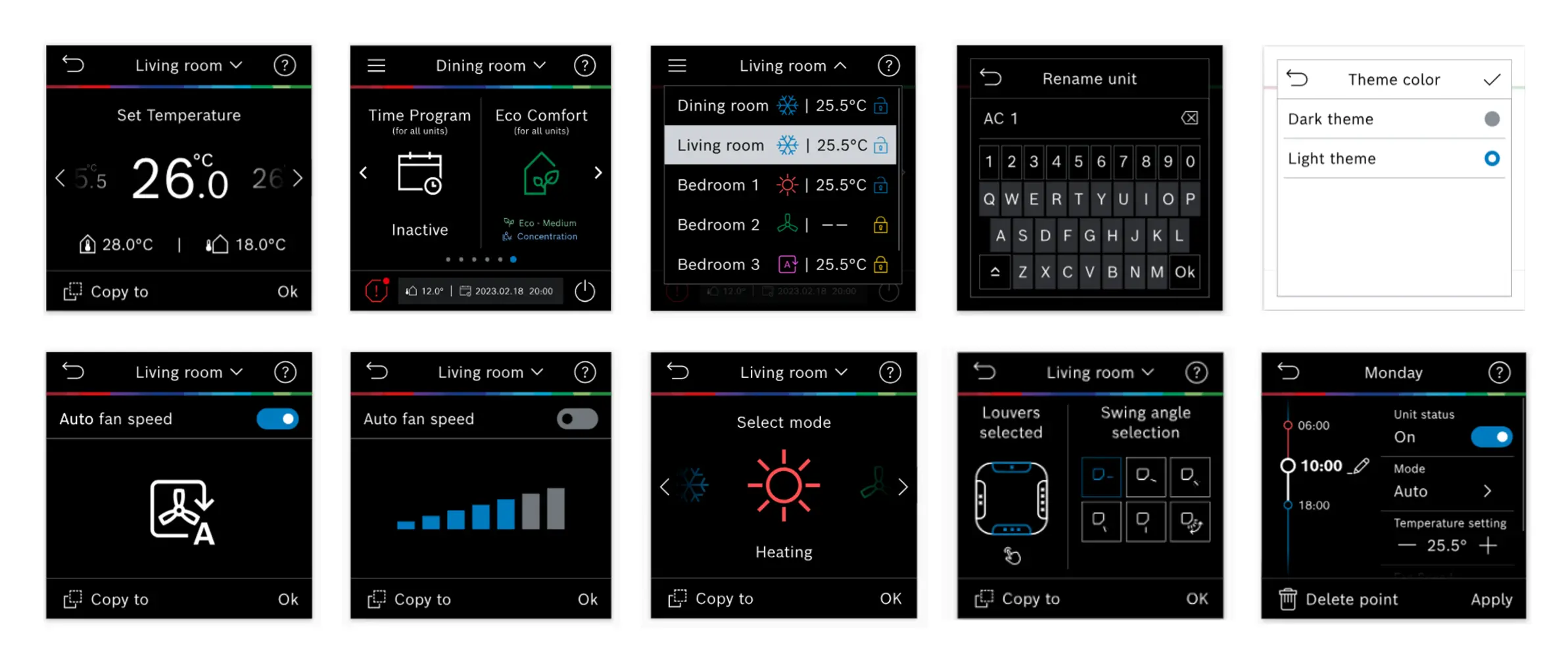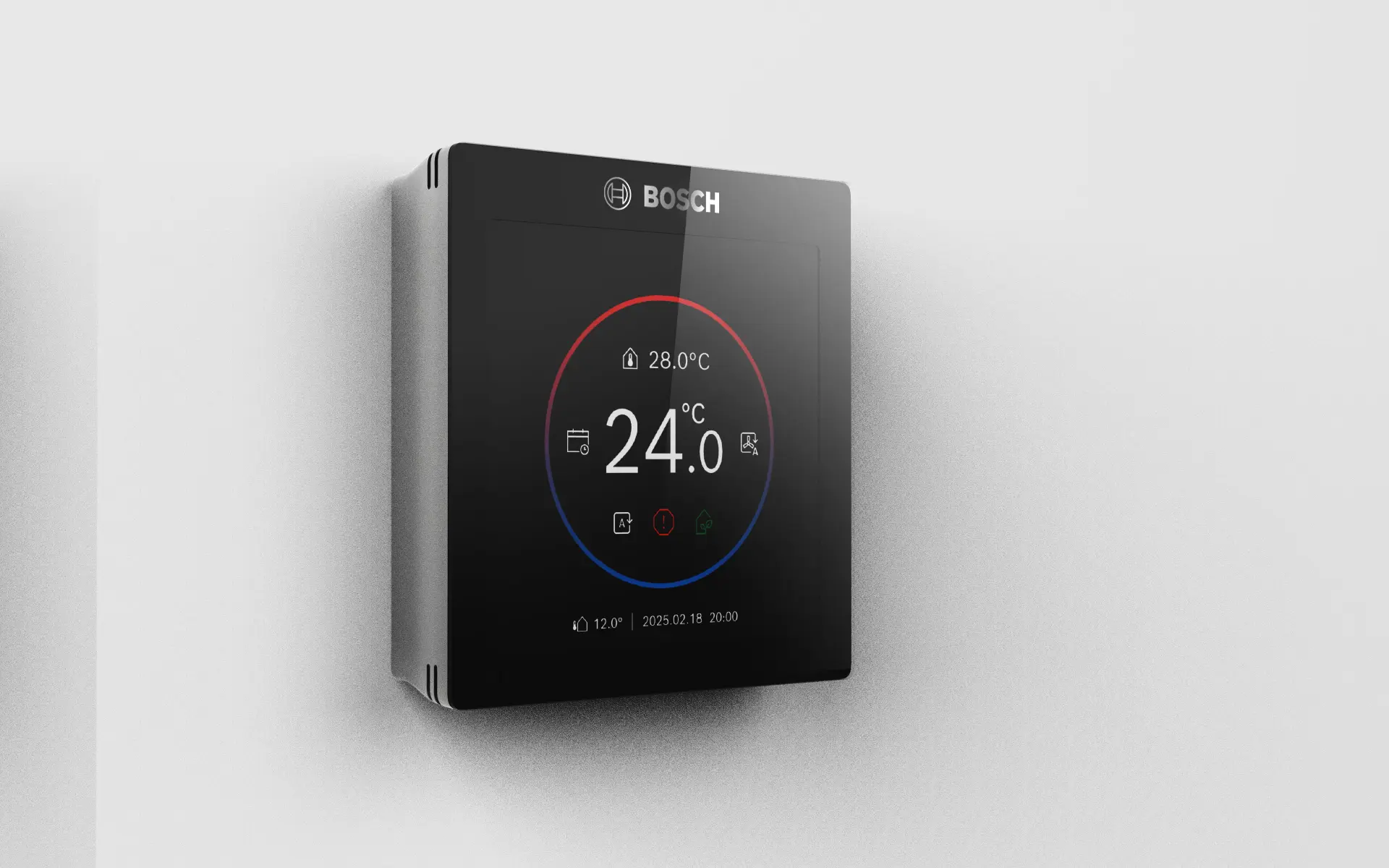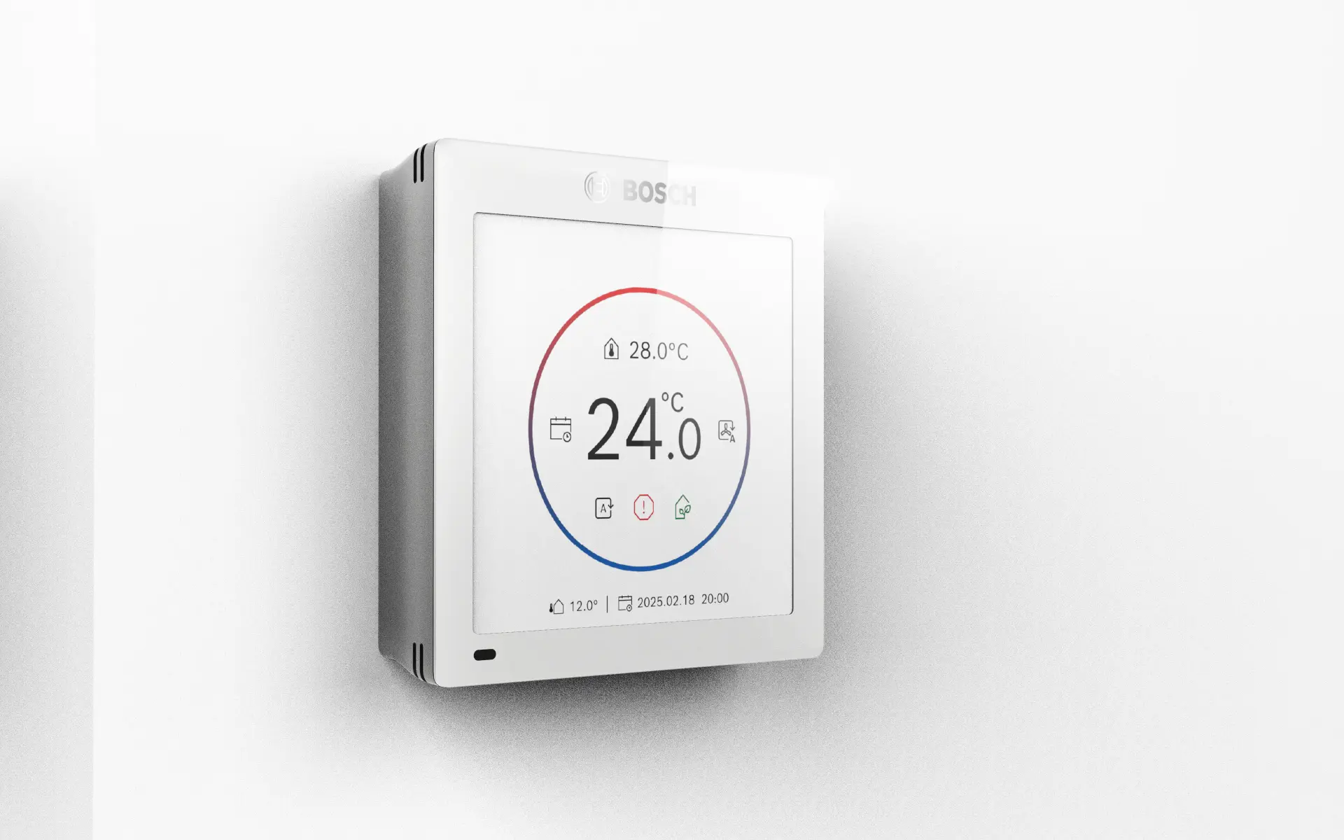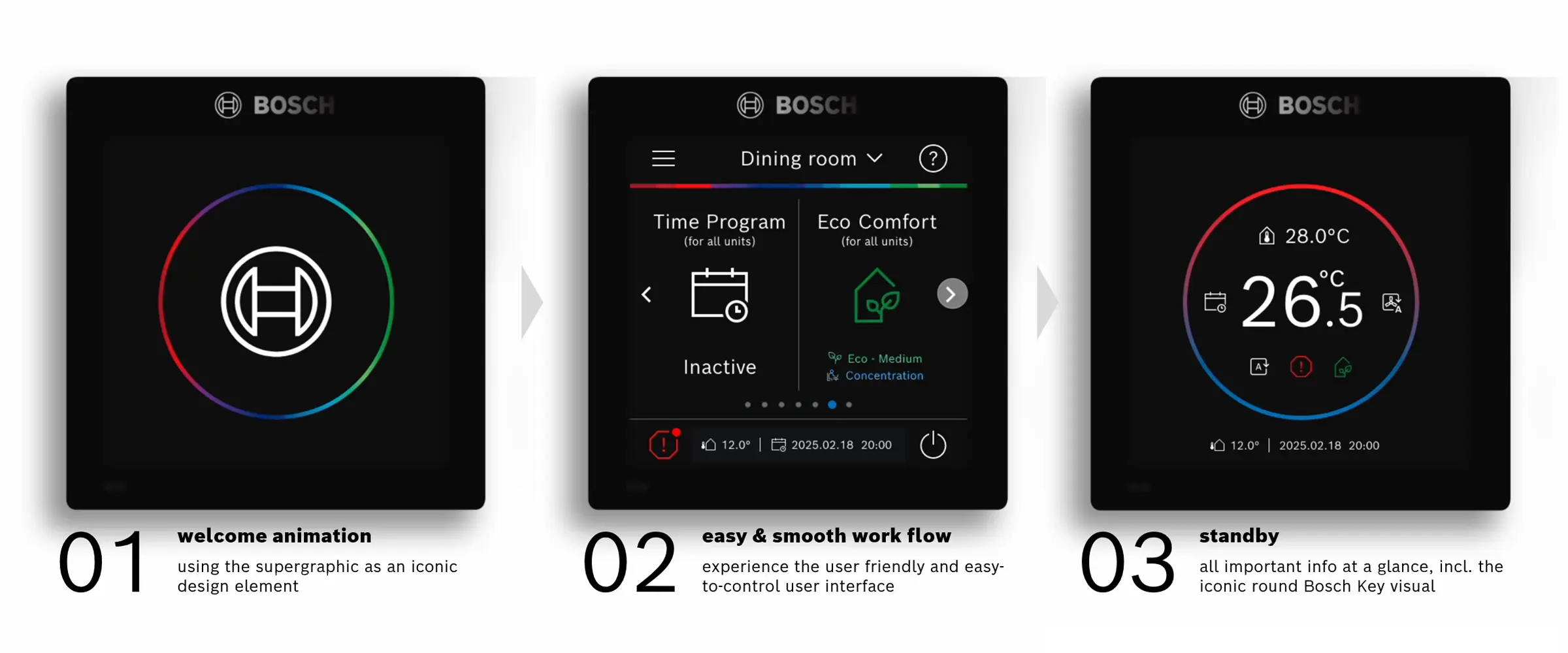 The ARC Touch embodies a clear interaction philosophy and the iconic Bosch design language. Its clean & modern aesthetic is designed to unobtrusively fit into any living space, it’s available in black & white. Using a recessed housing for a sleek appearance with soft shapes underlining the human-centric touch and its non-techy character. The tone-in-tone display integration emphasises its frameless aesthetics. The easy-to-use full touch UI features a modern tile design with a reduced use of colours for a clear focus on active components. Subtle integration of the Bosch Supergraphic as a design element to booster the iconic brand recognition.