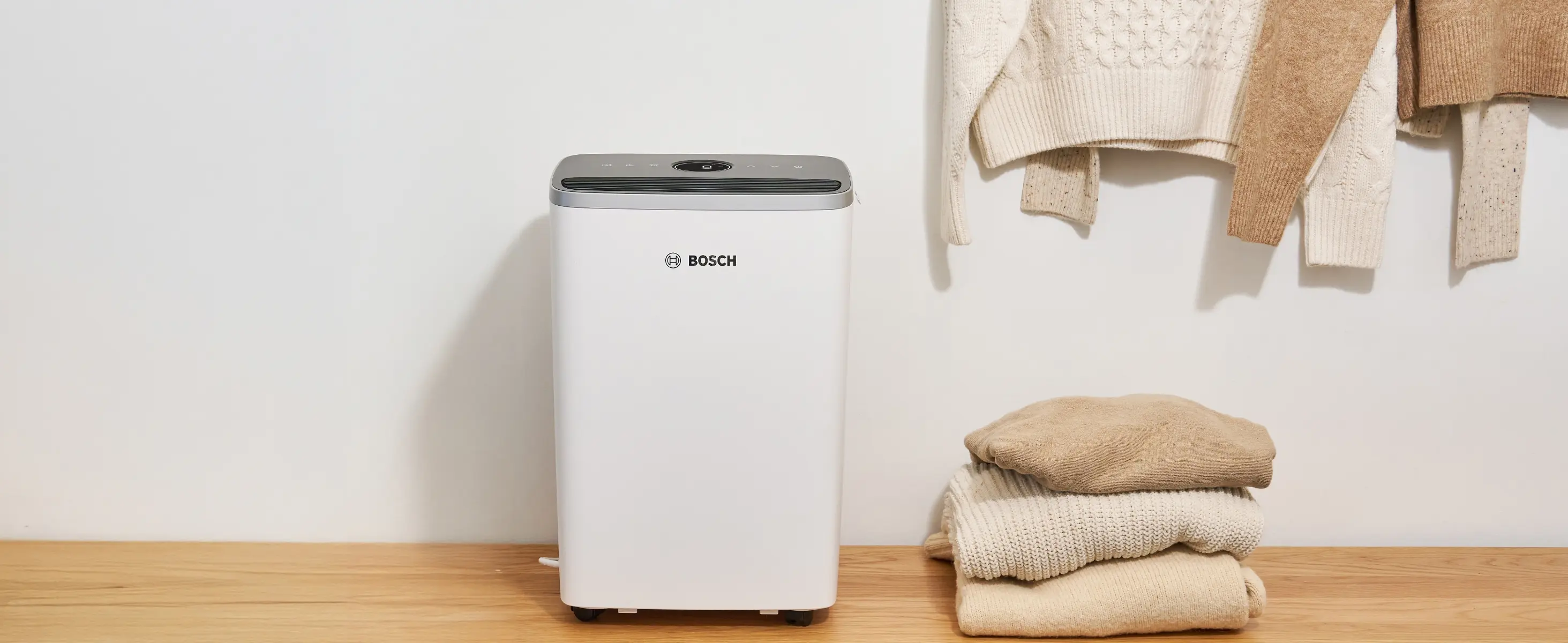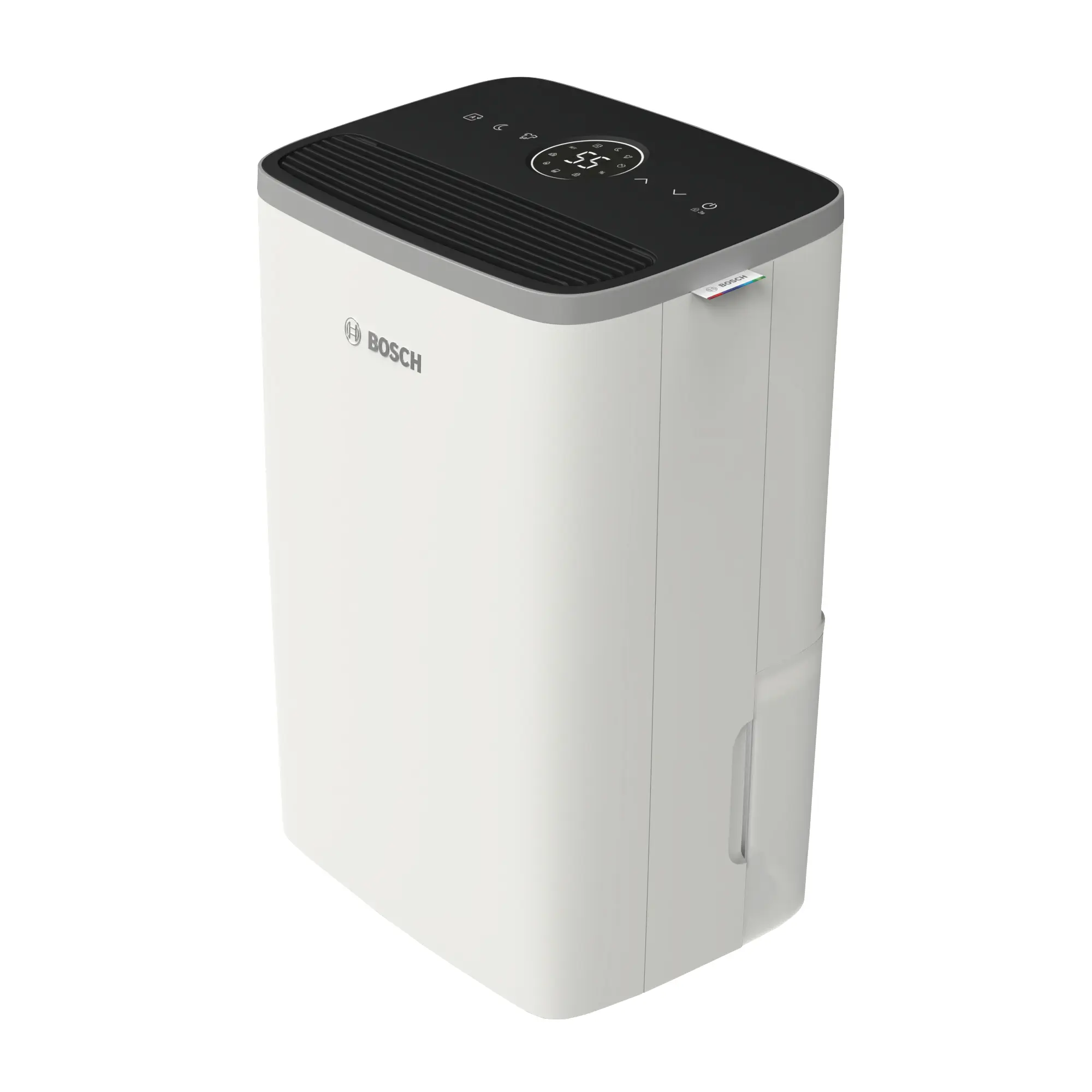The Bosch Dry relies on a clear interaction concept and the iconic Bosch design language. Its clean and unobtrusive design seamlessly integrates into any living space, supported by a fashion-inspired textile logo flag. The orientation of the vertical main body with big smooth edges visually dominates the unit and makes the technical components almost disappear. The semi-matte surface emphasizes the homey & modern character. The easy-to-use interface includes touch control buttons, a display, LED light ring, and illuminated icons, offering an intuitive user experience. It’s slightly tilted towards the user for a comfortable operation.