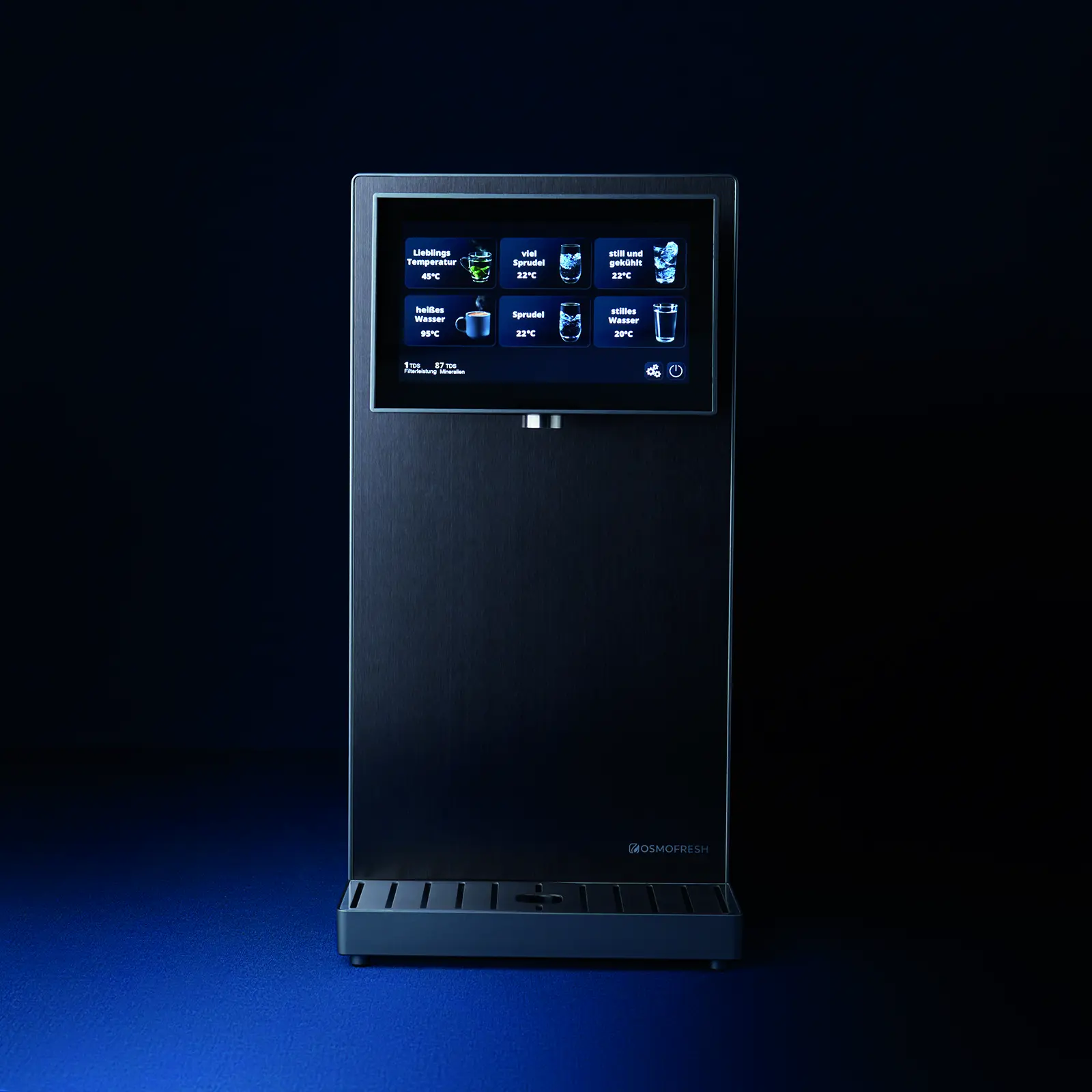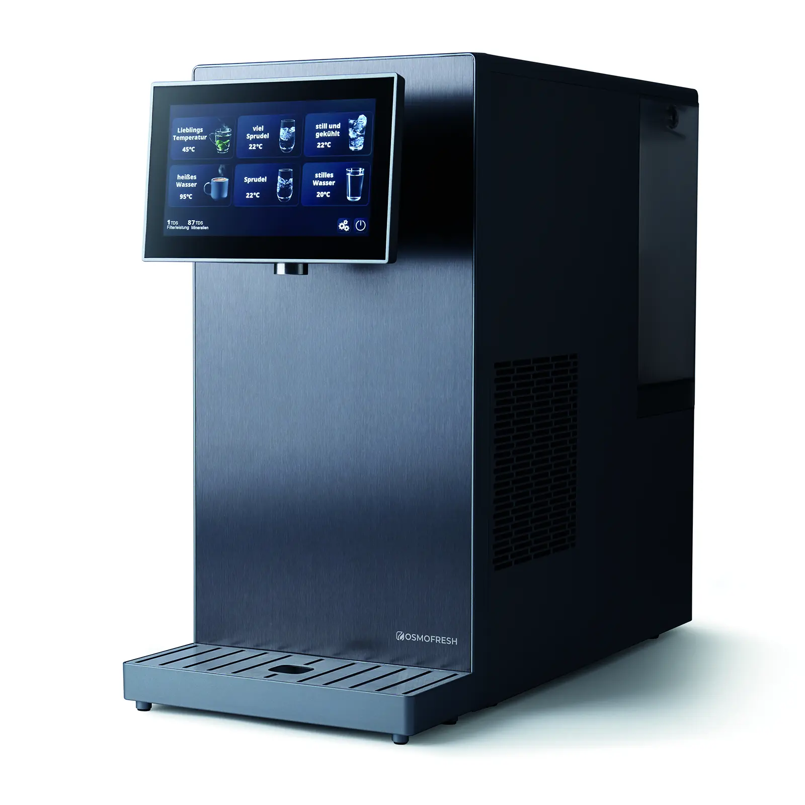 The Fusion Pro combines premium materials with functional elegance and outstanding filtration. It handles almost any incoming water and always delivers mineralized drinking water of the highest quality. Its technically determined, box-like form is refined by a brushed stainless-steel front and a solid stainless-steel outlet. The recessed 7” glass touch display softens the shape and adds visual lightness. Despite advanced technology inside, intuitive menu guidance ensures ease of use. Operable with tank or mains connection and only 22 cm wide.