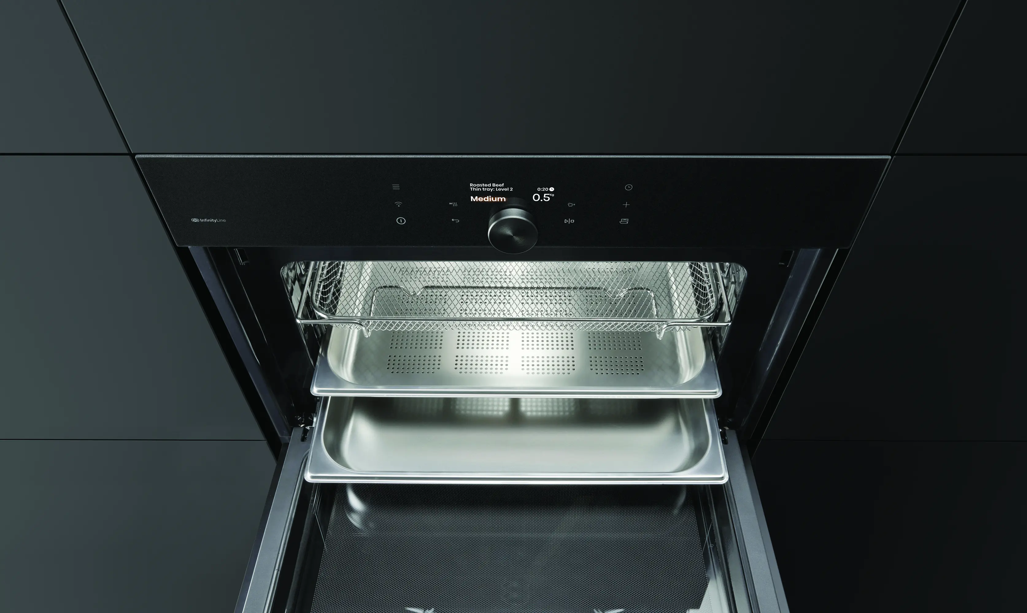 The G800 Infinity Matt series ovens, in a 45cm size, are primarily designed for kitchen studios. Ovens ensures the fastest preheating and even baking, while steam enhances flavour, speeds cooking, and saves energy. Patented matte glass provides a clear view during use and entirely conceals the UI and interior when idle – without any visible window. Glass surfaces and a touch-opening door keep the surface perfectly flush with the furniture. The intuitive UI with text and images offers smart home integration. Sustainable solutions reduce materials, enable recycling, improve efficiency, and extend the oven’s functional and aesthetic lifespan.