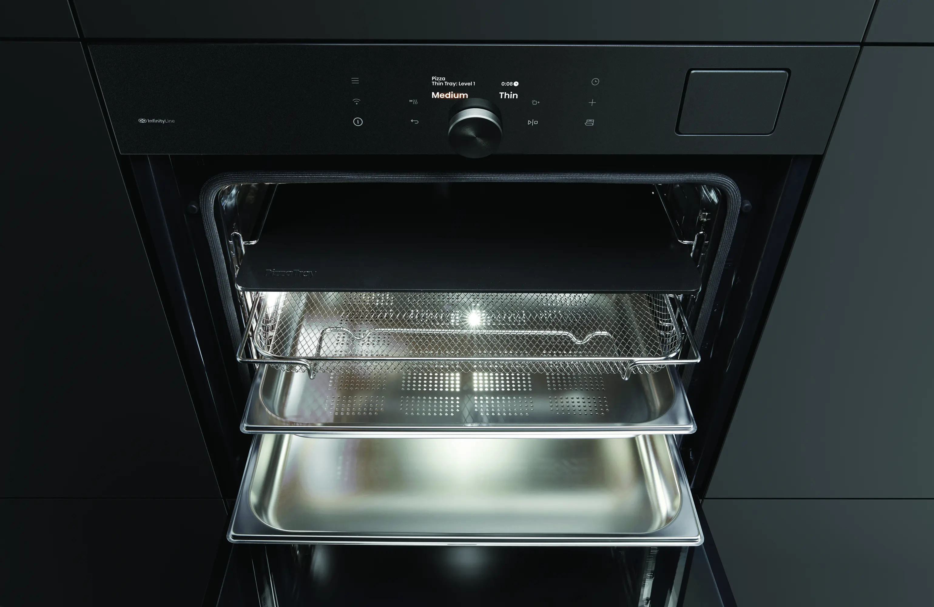 The G800 Infinity Matt series ovens, in a 60 cm size, are primarily designed for kitchen studios. A patented interior ensures the fastest preheating and even baking, while steam enhances flavour, speeds cooking, and saves energy. The pro pizza function with a baking tray reaches 350°C, finishing in just 3.5 minutes. Patented matte glass provides a clear view during use and entirely conceals the UI and interior when idle. Glass surfaces and a touch-opening door keep the surface perfectly flush with the furniture. The intuitive UI with text and images offers smart home integration. Sustainable solutions reduce materials and improve efficiency.