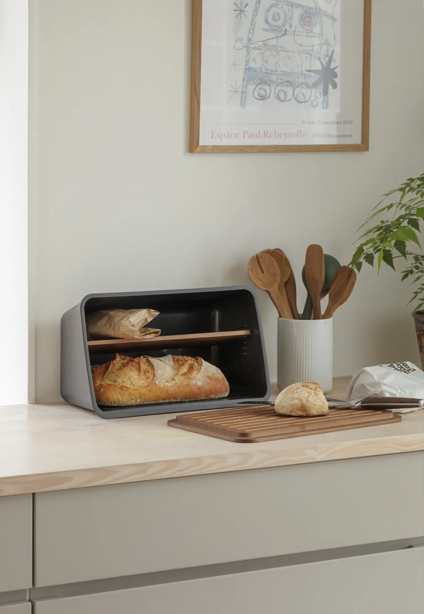 Keep your bread fresh and your kitchen tidy with the Nordic kitchen Bread bin. The FSC-certified carbonised bamboo top is a dual-purpose lid and chopping board. Slice bread directly on the lid, allowing the grooves to catch the crumbs. Inside the bin, the pull-out shelf gives you the option of extra separation and tidying. Turn the bread bin so the lid faces outwards, cabinet-style, and arrange your bread and other baked goods on multiple levels. Whether standing upright or on its side, the lid is securely retained in place.