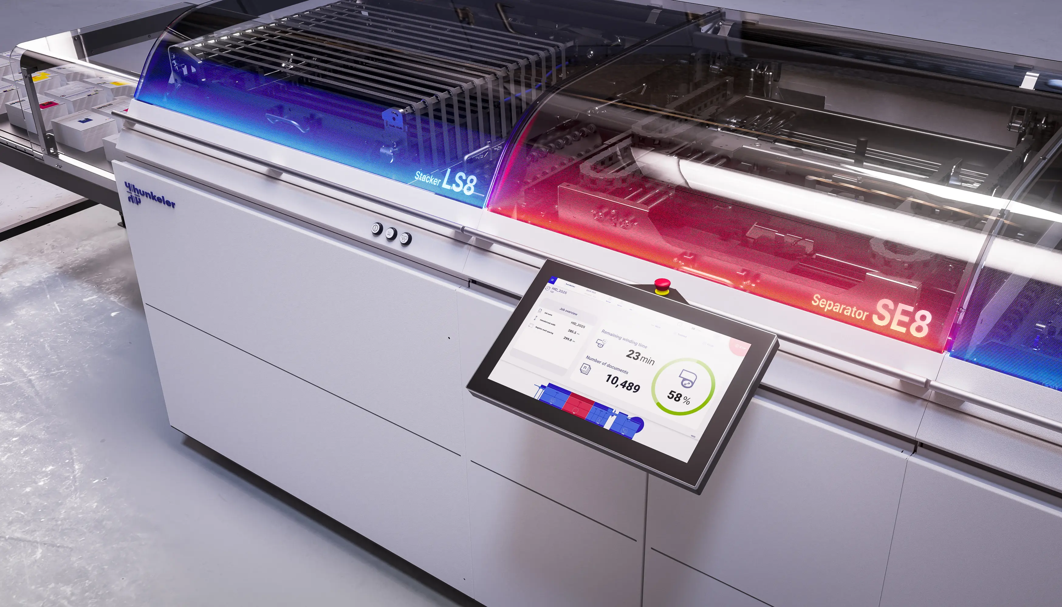 Gen8 EVO sets new standards in paper processing. Ergonomically shaped acrylic covers ensure clear visibility of internal processes. Continuous grip rails allow smooth opening from any position, with integrated rotation for stepless adjustment at any angle. Edge illumination creates a distinctive light gradient on the covers, colour-coded to indicate each module’s status and visually aligned with the movable main display: the interface informs the operator, while the light guides them precisely to the right spot.