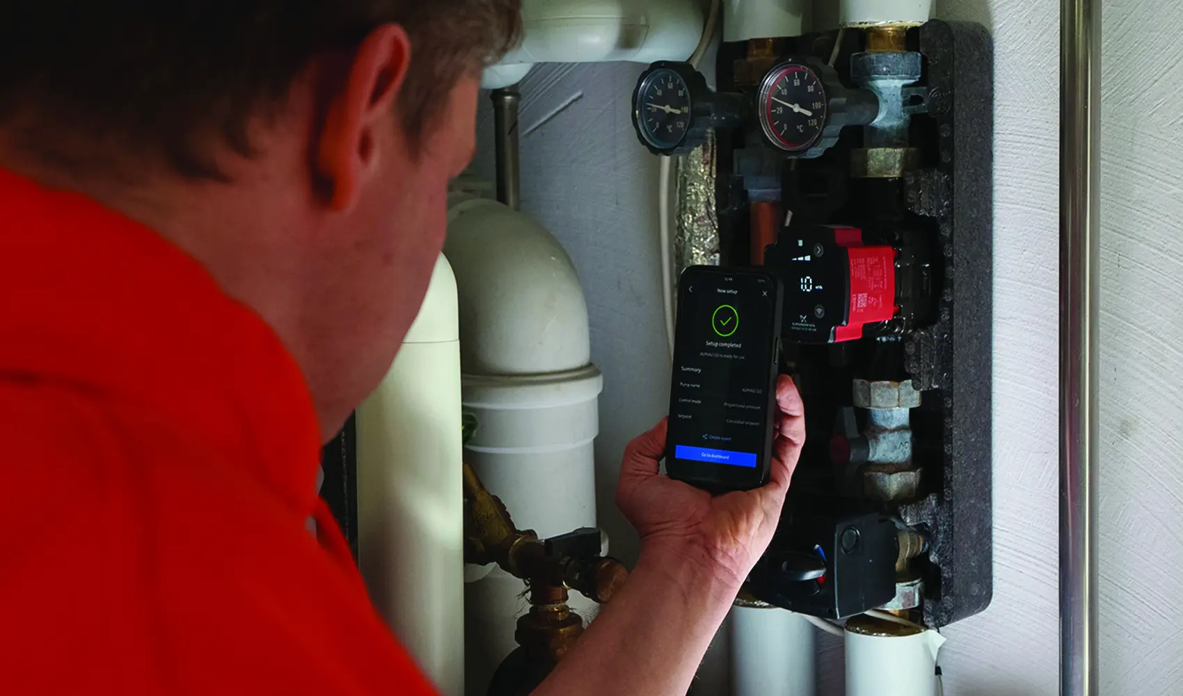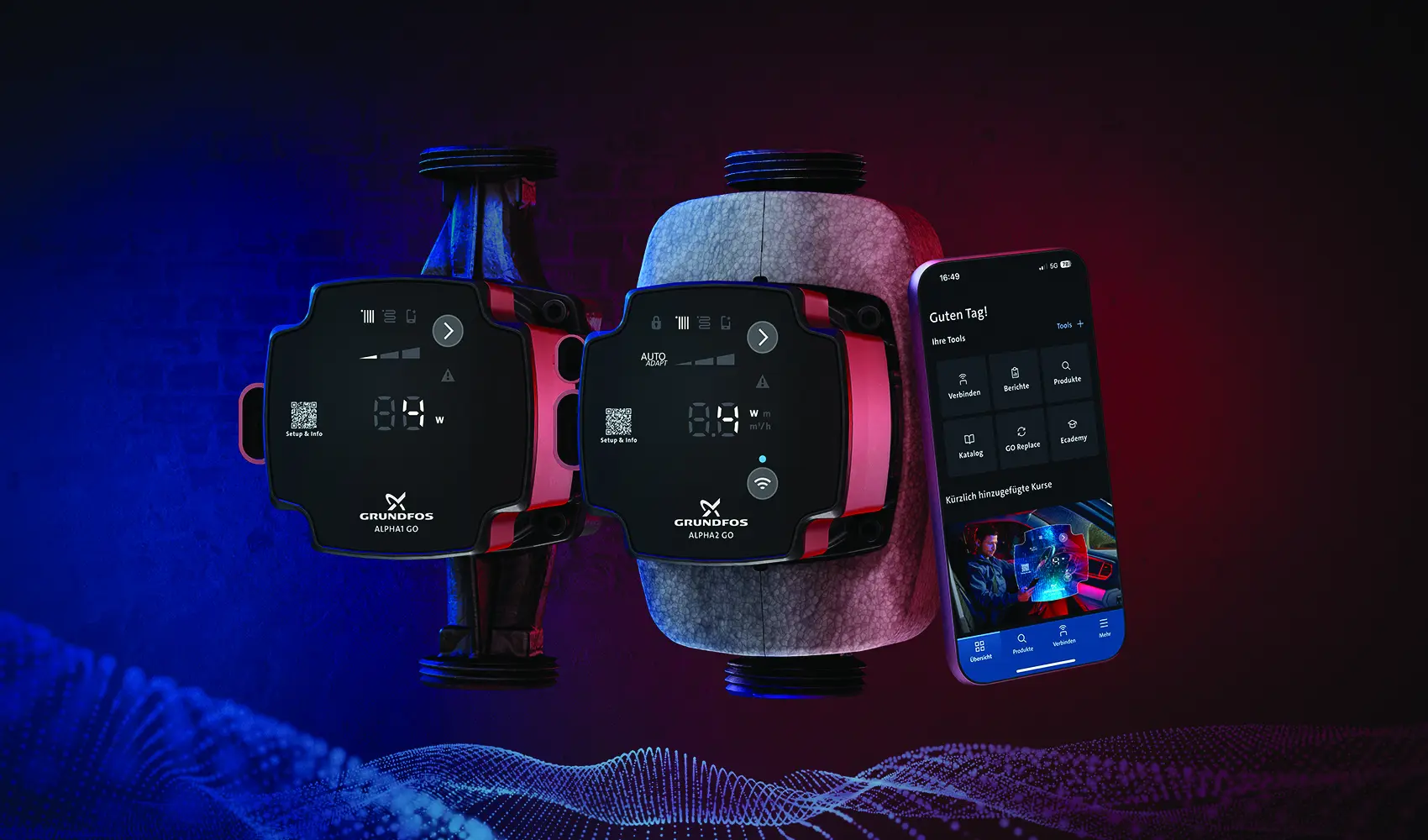 Grundfos is presenting the latest generation Alpha1 GO and Alpha2 GO. The Grundfos GO smartphone app is the central tool for using smart digital features for quick pump replacement, optimum settings, analysis, firmware updates, and other functions. Externally, the new models stand out with their angular housing, which is based on Grundfos integrated pumps, and a redesigned front panel. The display elements have been made more user-friendly, and the QR code on the front leads directly to the guided setup and pump documentation via smartphone and internet access.