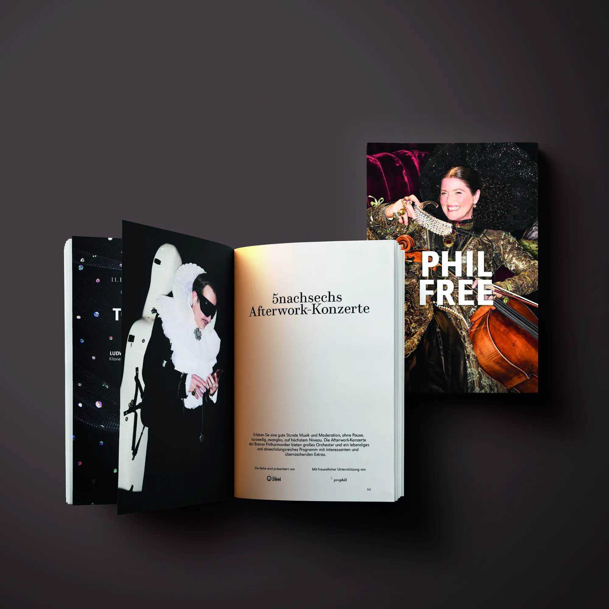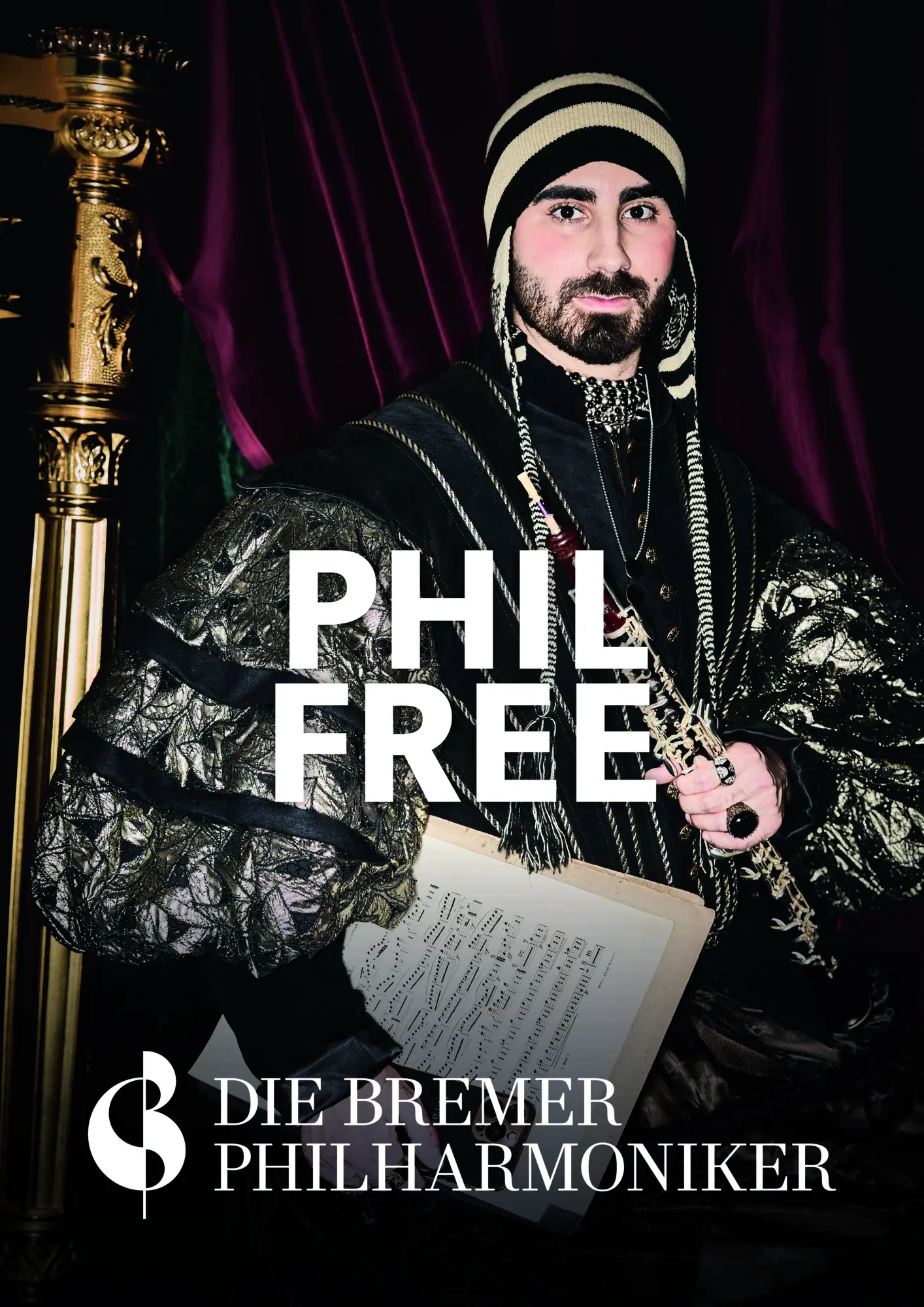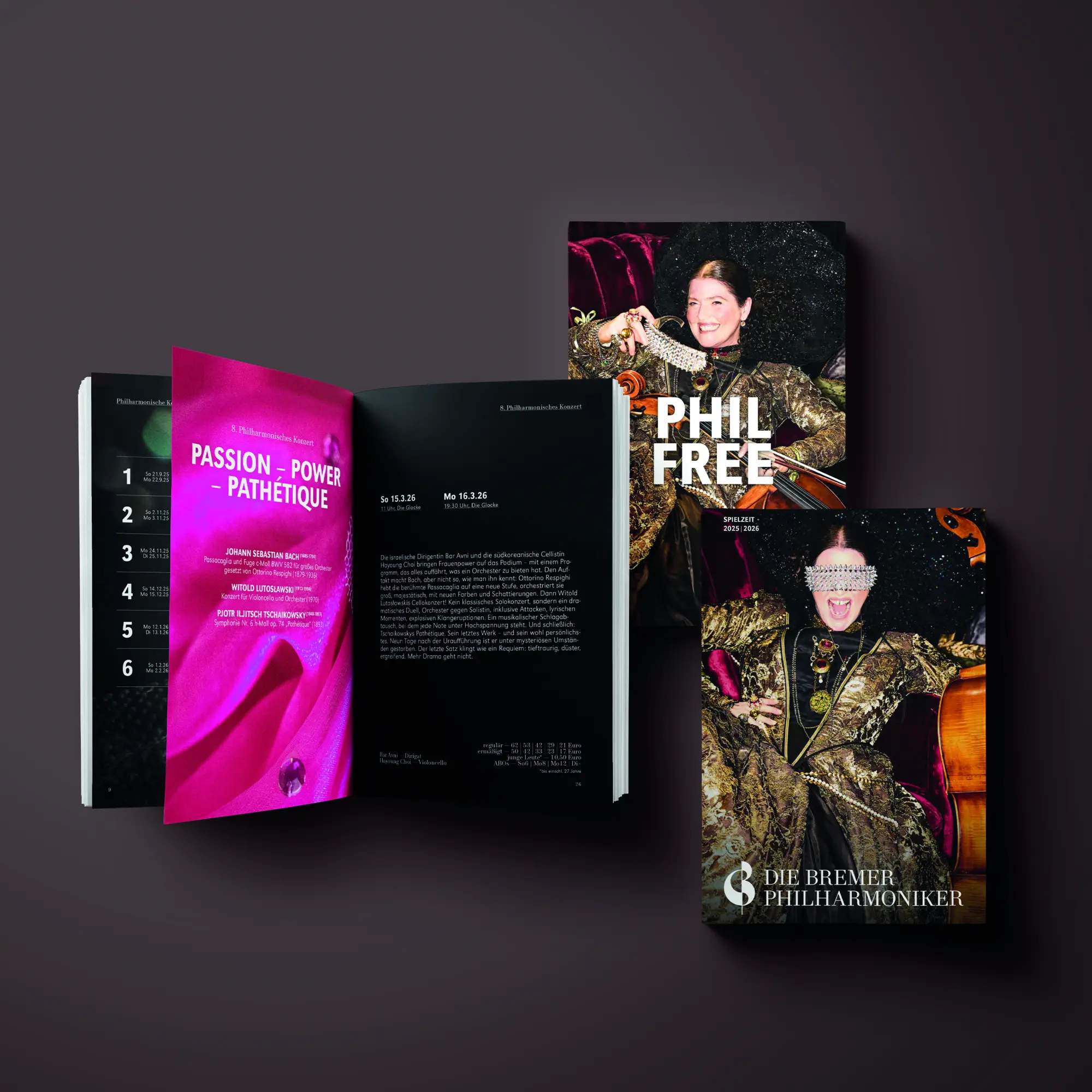 A classical orchestra reinvents itself. With its seasonal campaign “Phil Free,” the Bremen Philharmonic Orchestra breaks free from traditional design patterns and brings joie de vivre and positive energy to the public sphere. The campaign motifs show members of the ensemble in opulent attire with subtle contemporary accessories and were created by Esther Haase, Hamburg. Media: Out-of-home and program catalogue.