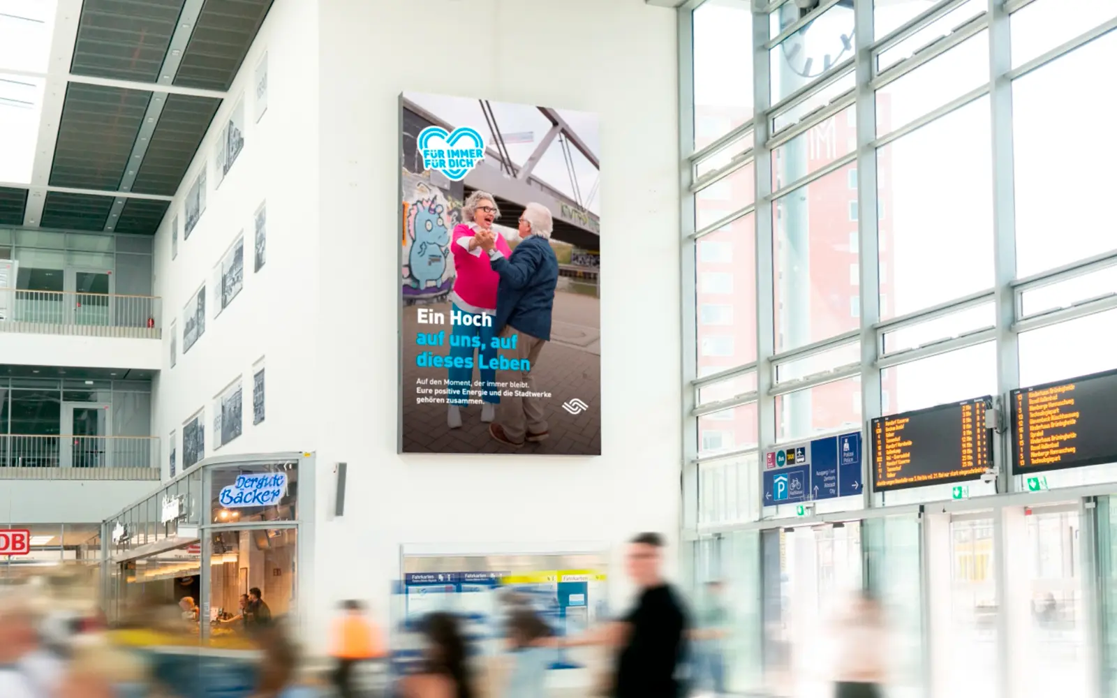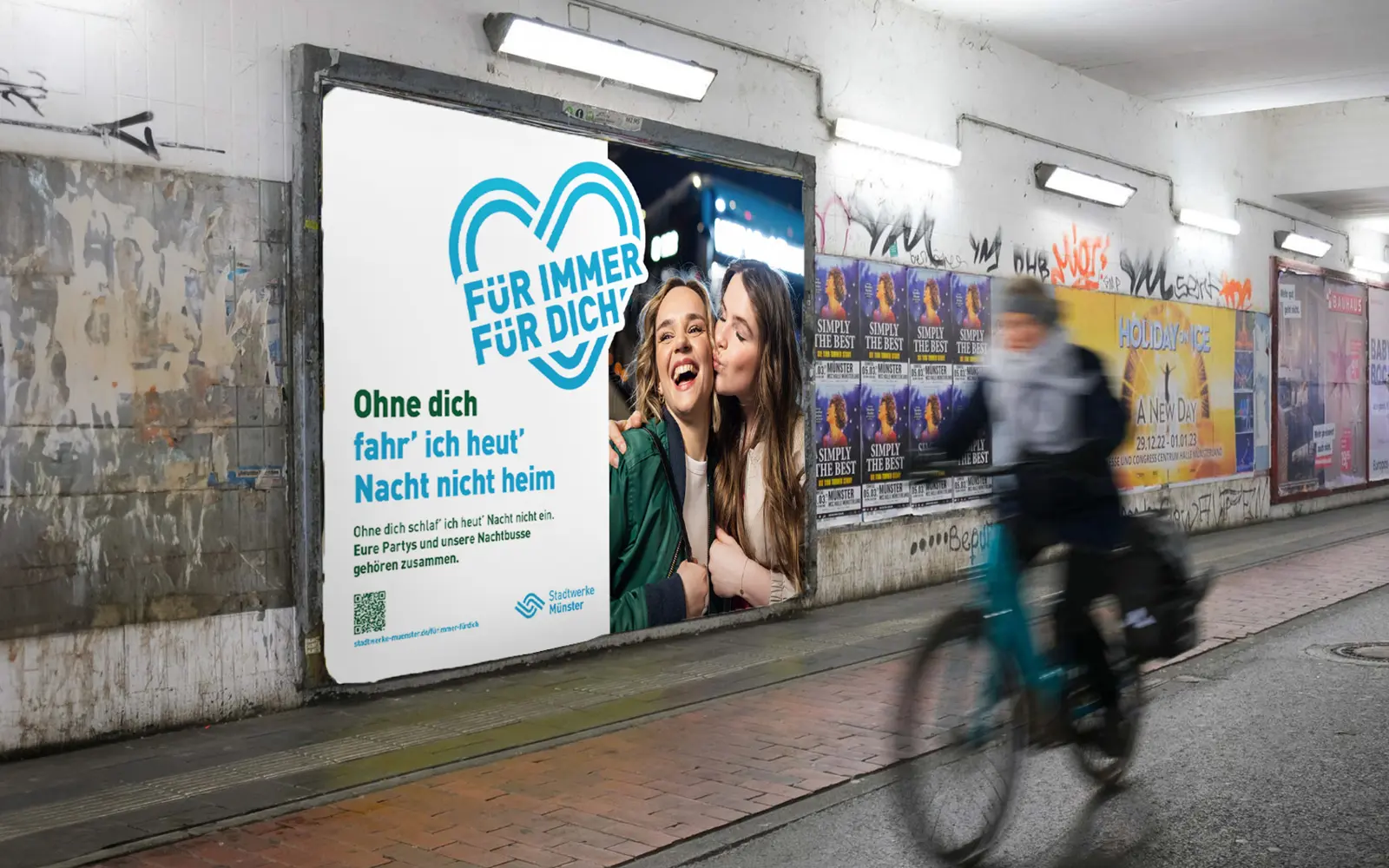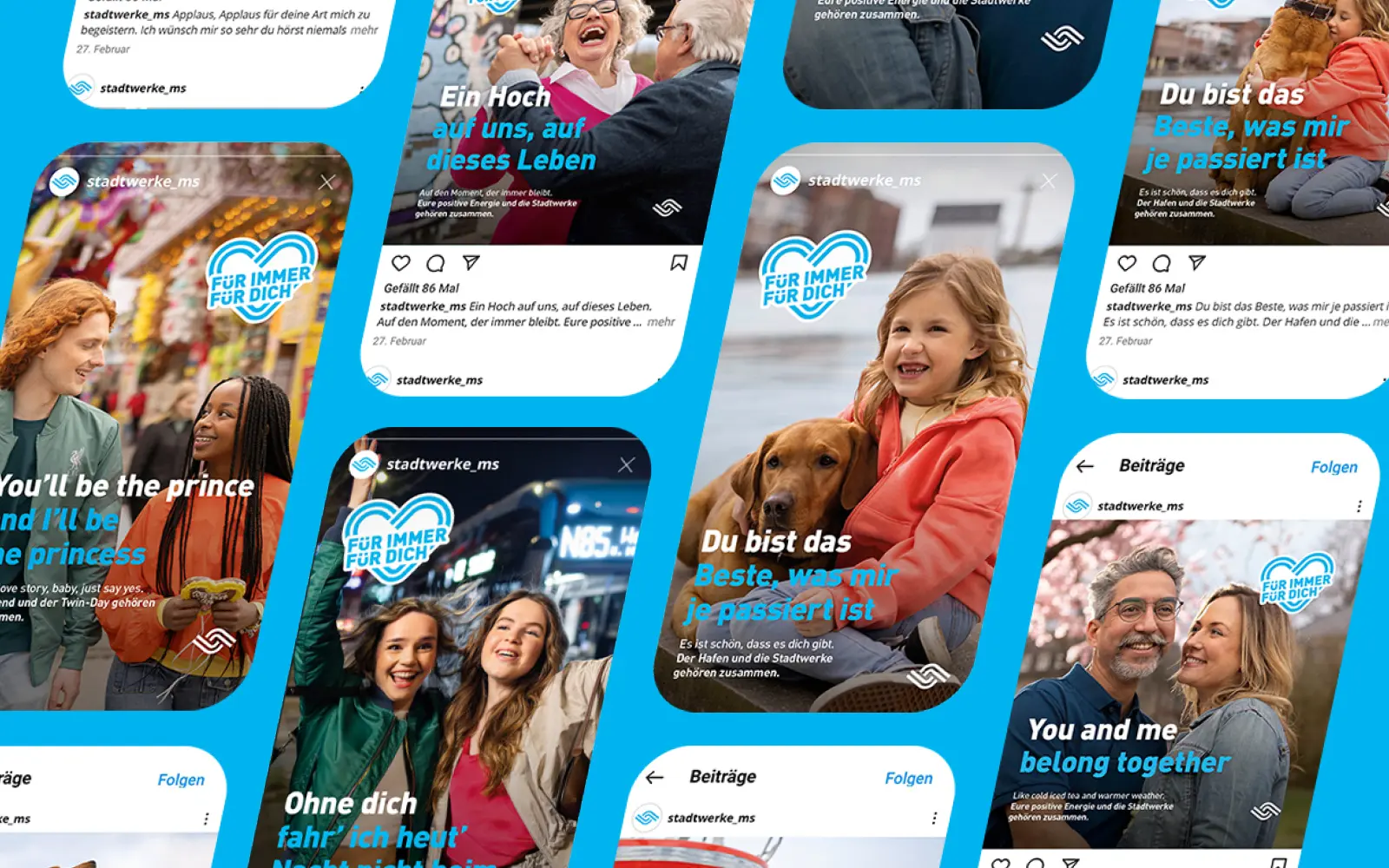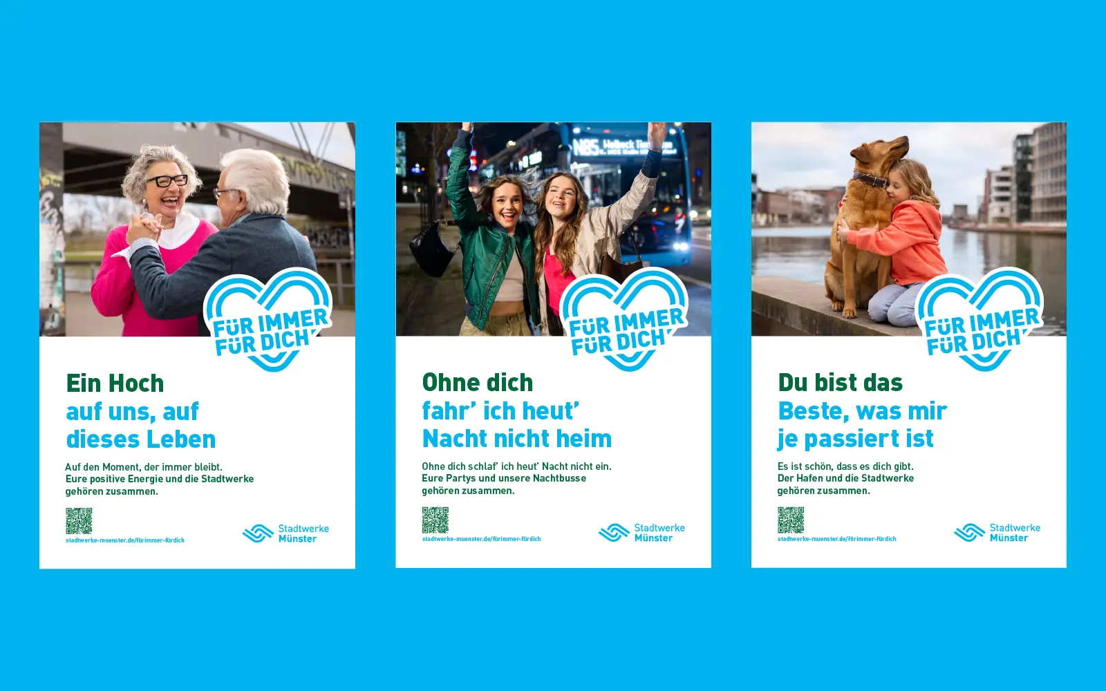 Stadtwerke Münster are more than just a utility provider: they are a partner, a supporter, and a driving force of the energy transition – out of love for the city and its people. At the heart of the campaign is the promise: “Münster, we mean it. FOREVER. FOR YOU.” Close relationships take centre stage: between friends, couples, humans and animals – and between the people of Münster and their Stadtwerke. The campaign convinces with a consistent brand identity, emotional imagery, and catchy lovesong lyrics in the headlines. It creates closeness, sympathy, and recognition – making Stadtwerke the city’s most charming communicator.