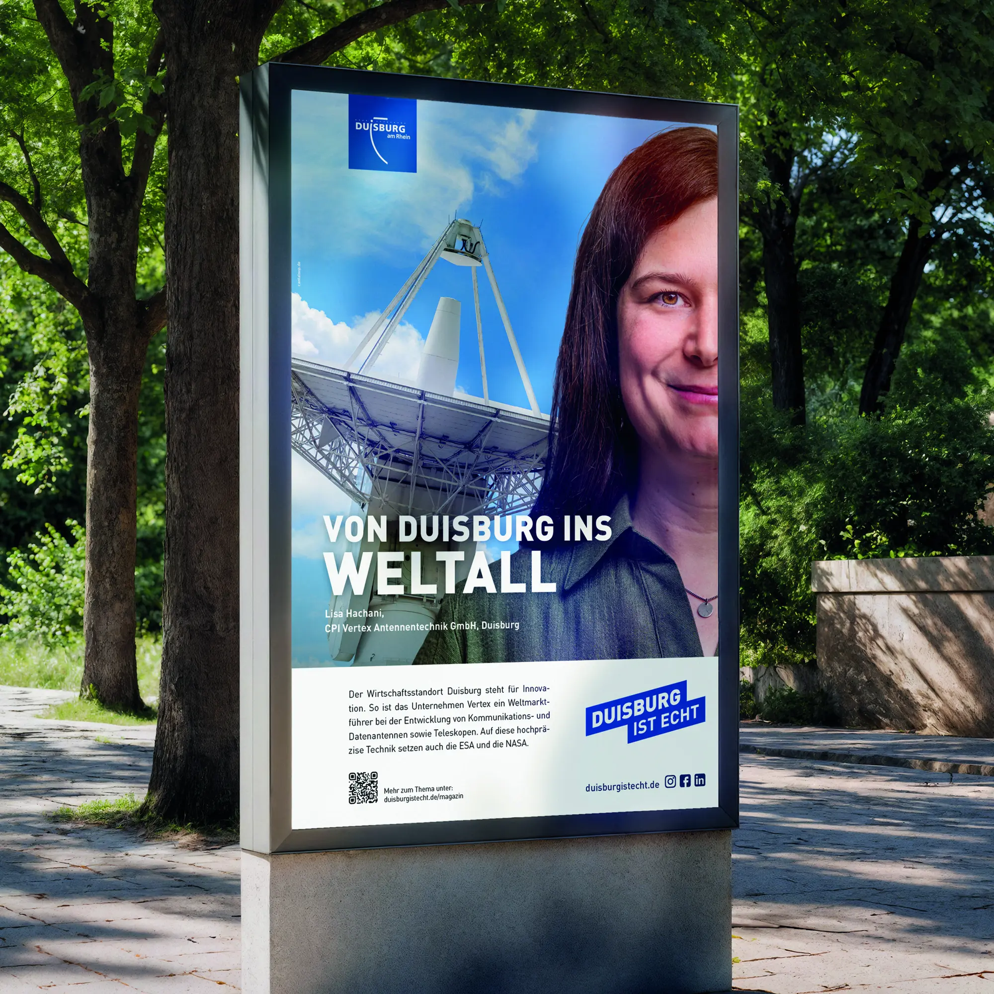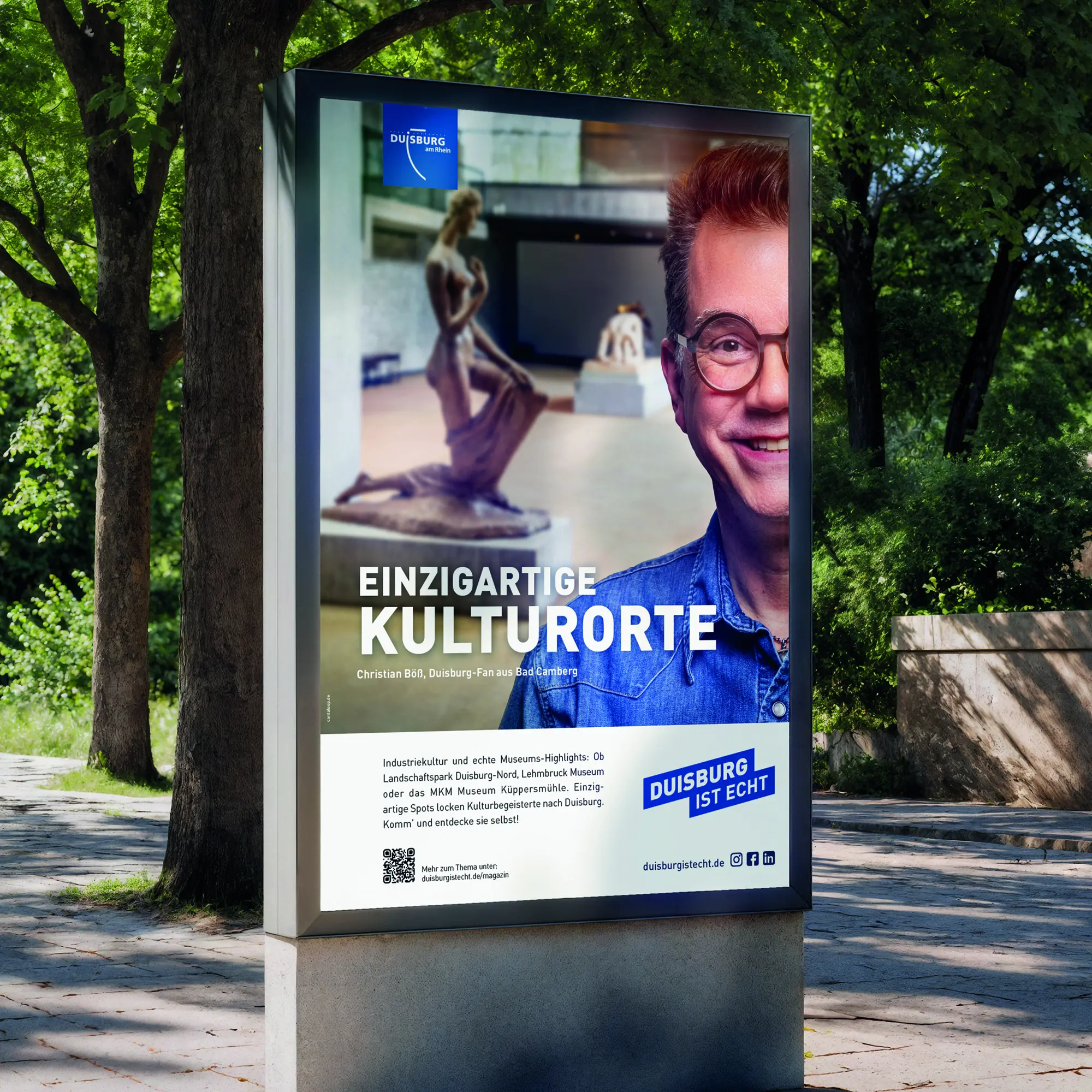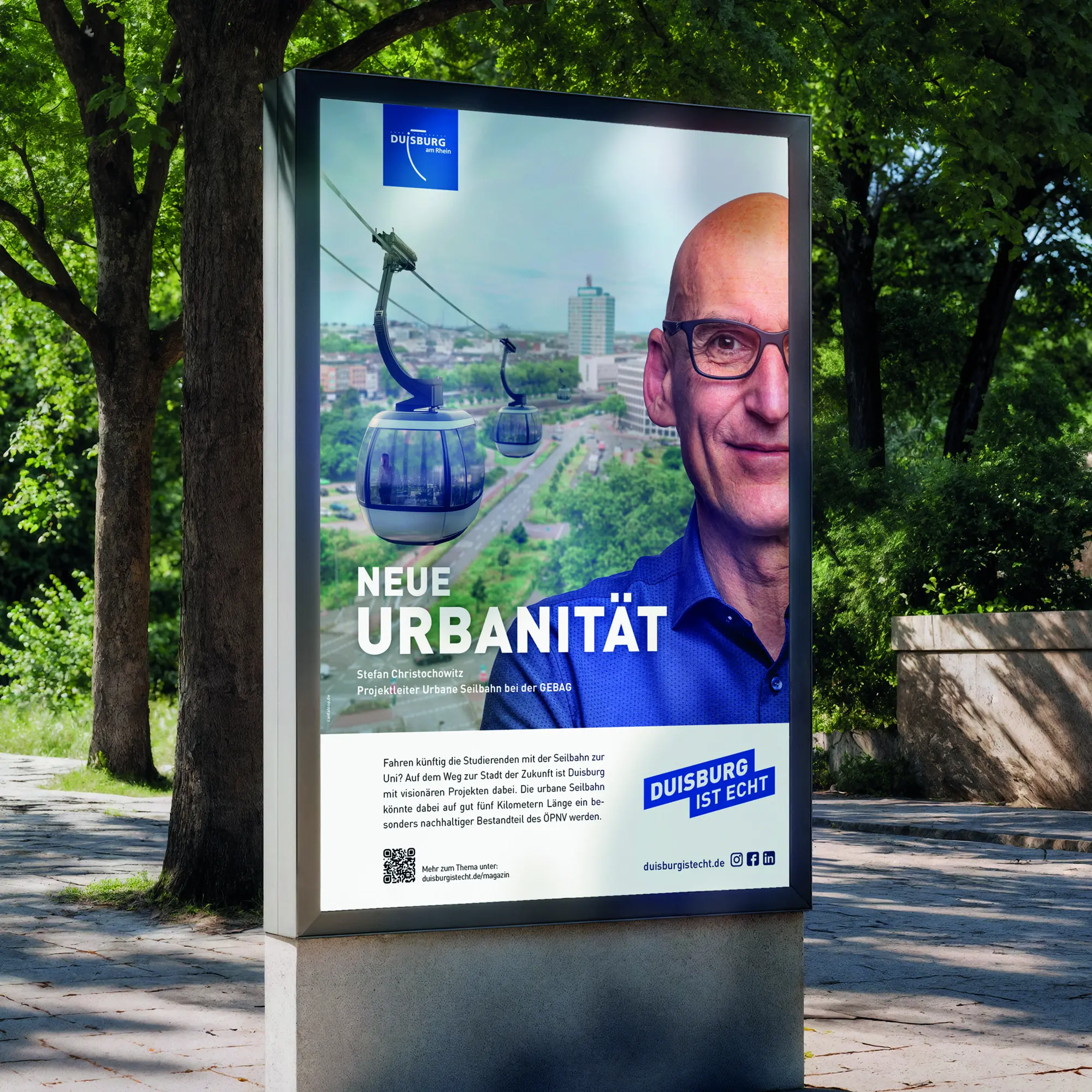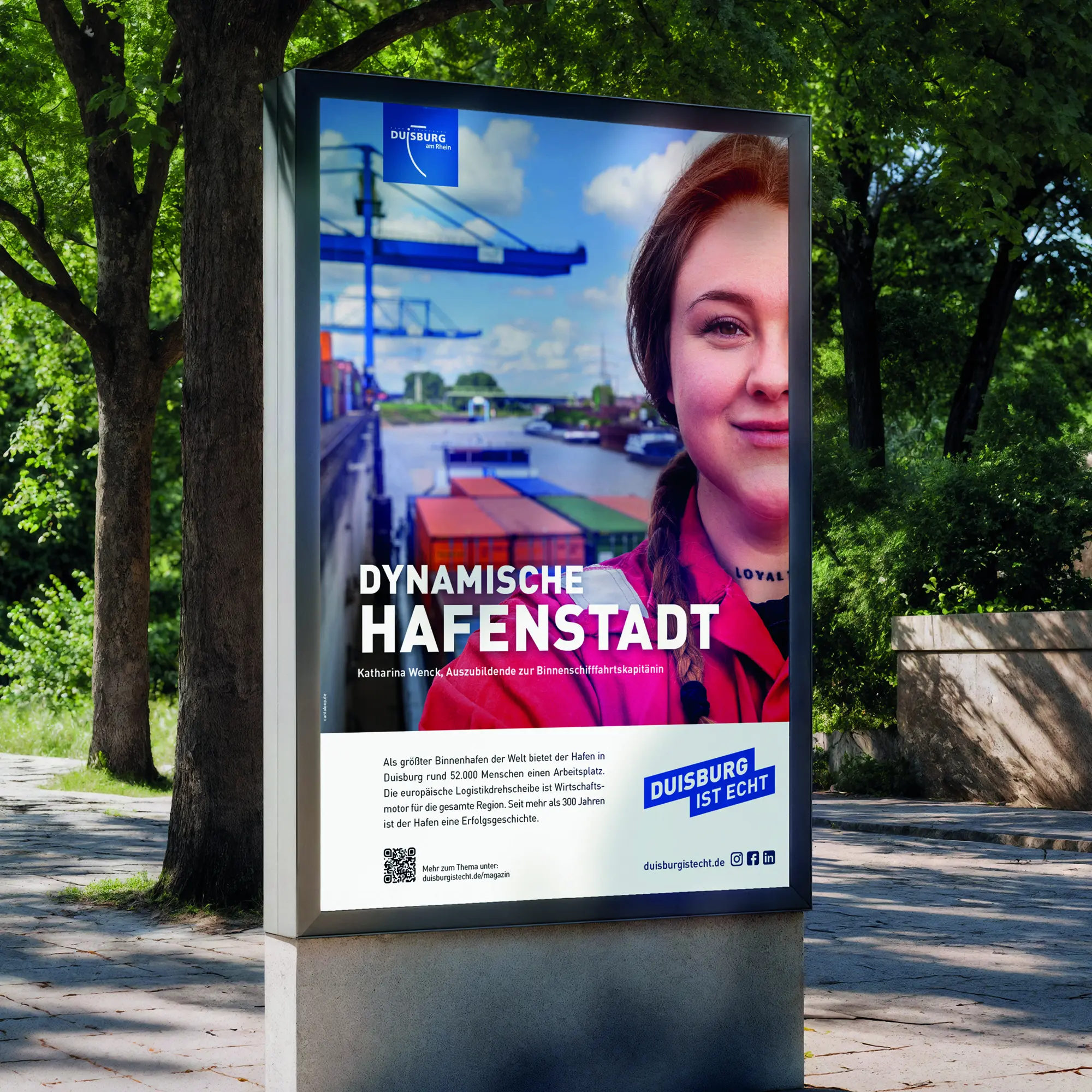 The “Duisburg is echt” campaign shines a new light on the city. At its heart are people and their stories. Through authentic voices, we reveal surprising and little-known facts about a city in transition, showcasing its strength and unique character. Our testimonials aren’t CEOs or board members, but intentionally people from the second row: project managers, apprentices, or even visitors who experience the city first-hand. The campaign extends beyond the initial message with a QR code that leads to a dedicated landing page, where visitors can dive deeper into the full story through an immersive mix of text, images, and video.
