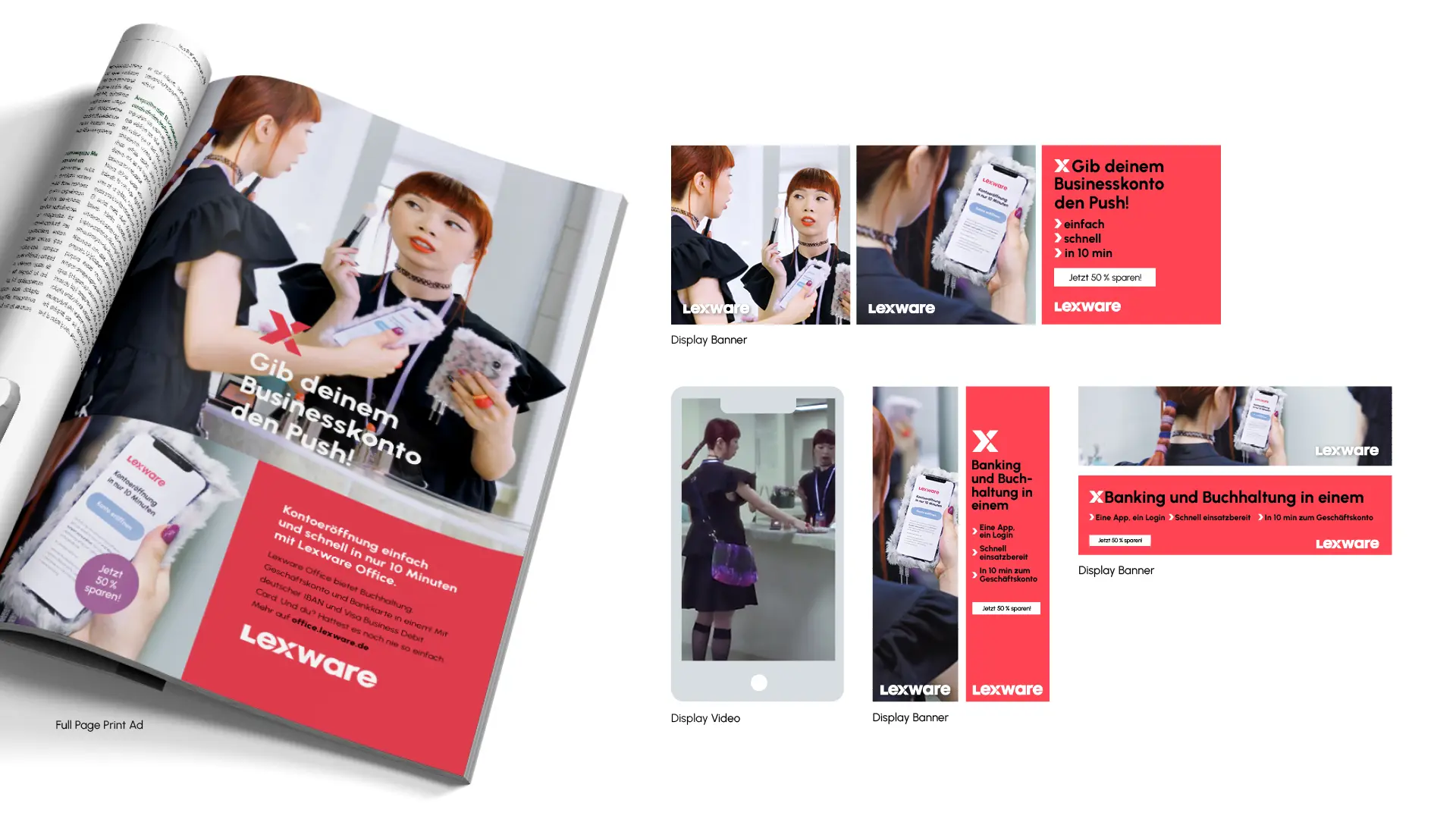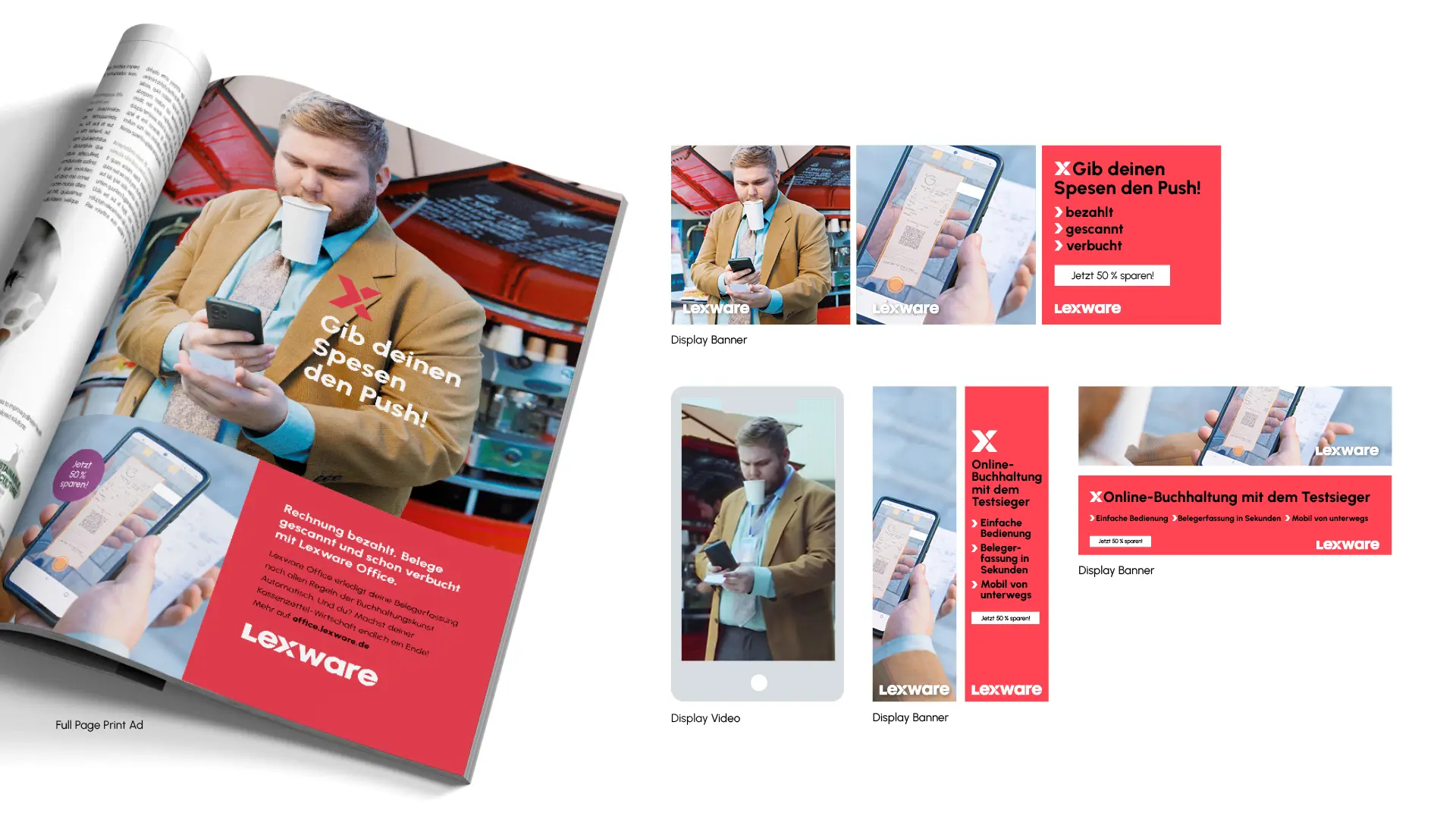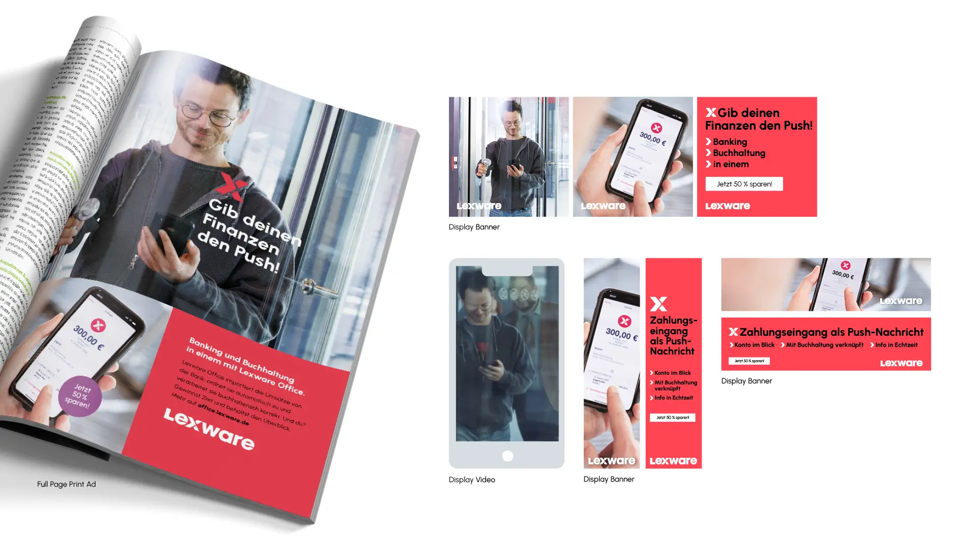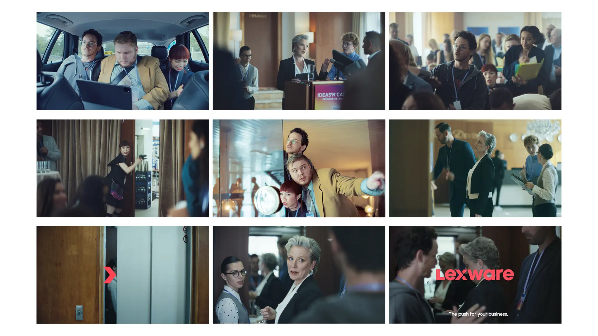 Lexware is Germany's market leader for commercial software solutions. The “Elevator Pitch” campaign focuses on a trio of founders - on the road to success. The three lovable underdogs are determined to elicit the seed capital for their start-up from a tough investor. When their mission threatens to fail despite all their efforts, the Lexware Push, a newly developed brand signal, literally opens the door for them at the crucial moment. At the heart of the campaign story is a TV spot, which is flanked by print and digital advertising in the upper, mid and lower funnel.