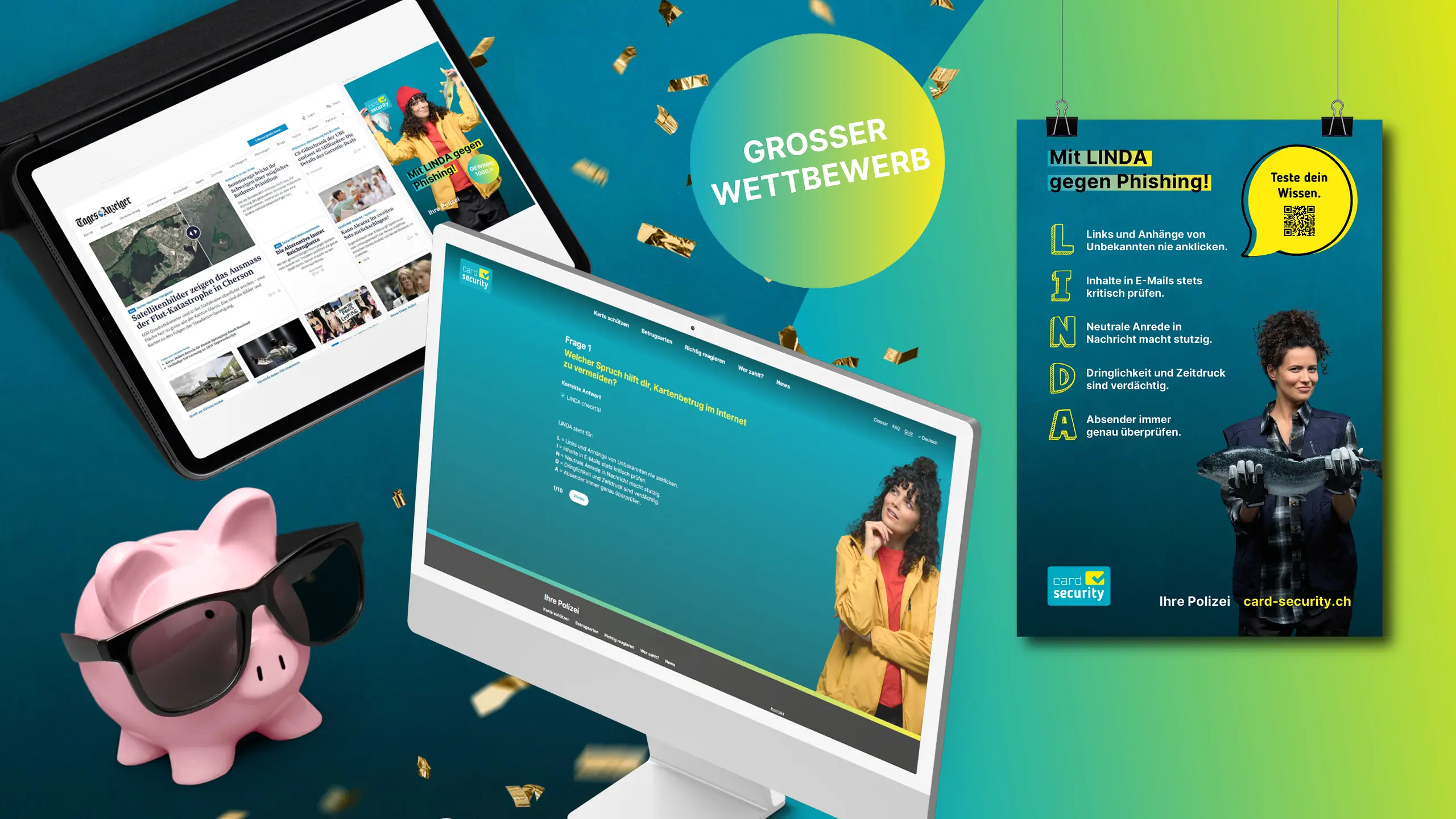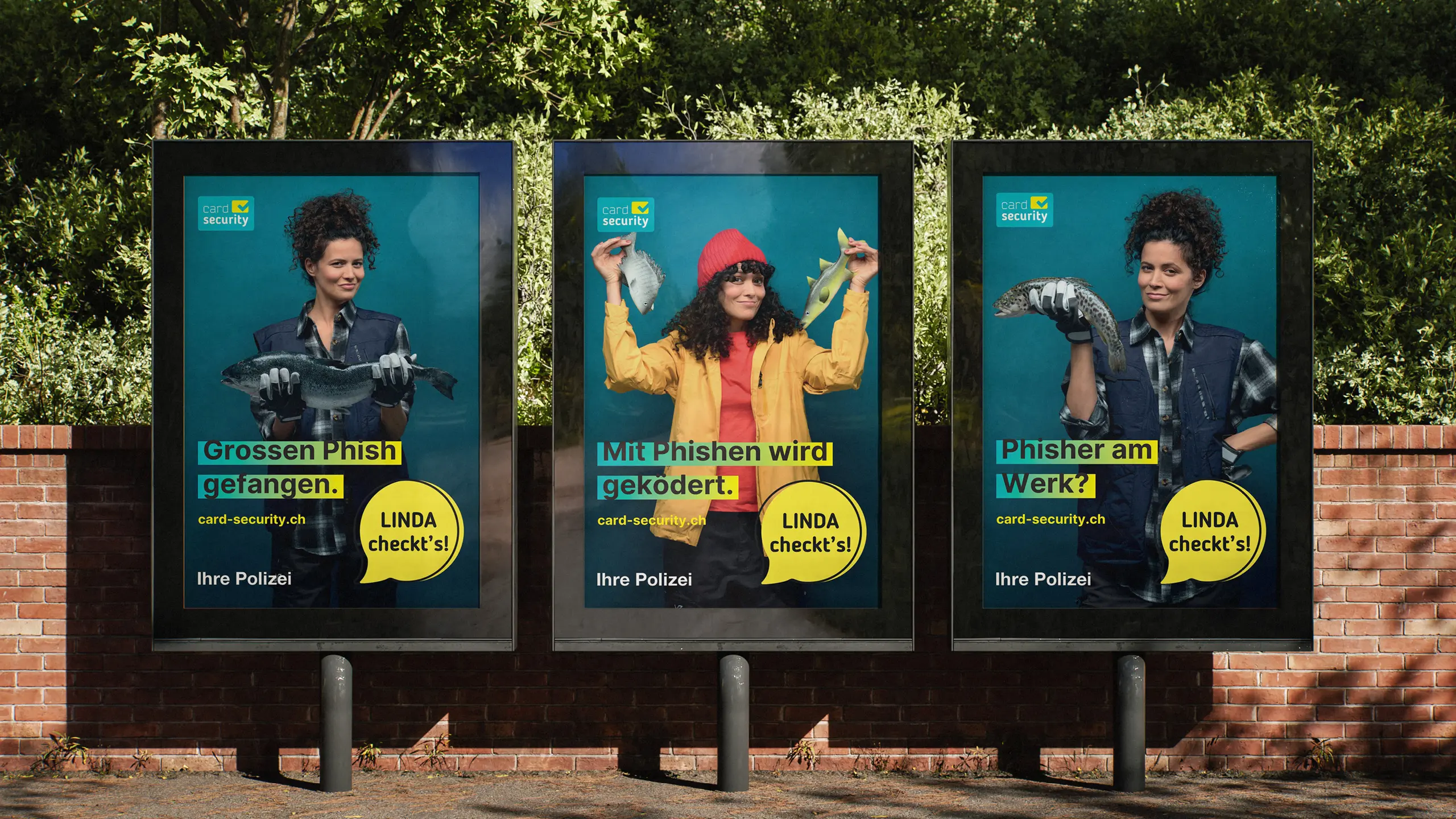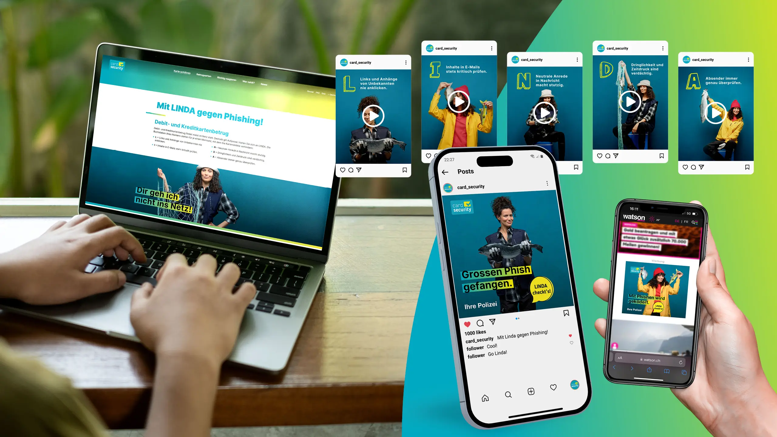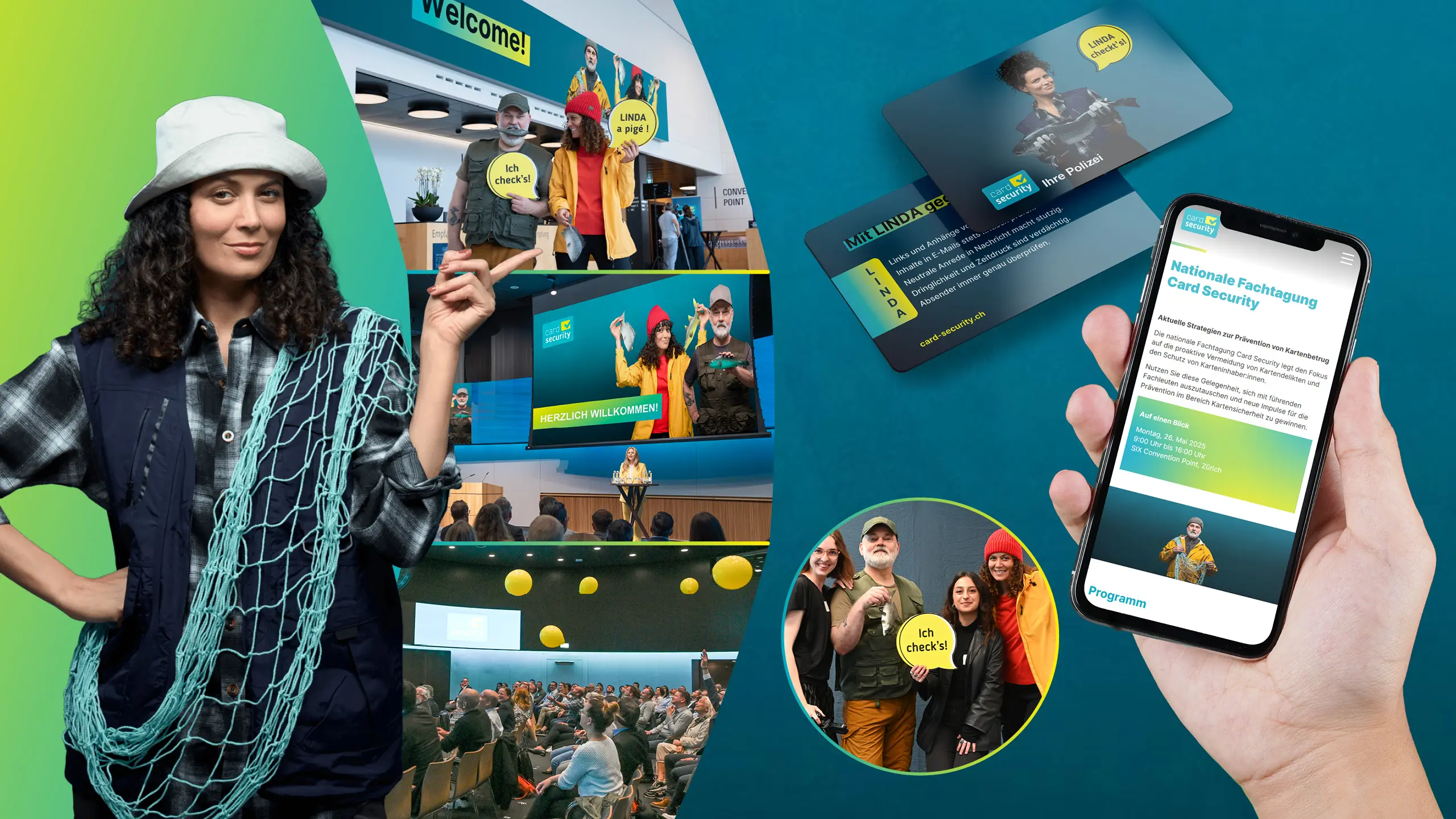 The national prevention campaign is being conducted in 4 languages and 2 phases throughout Switzerland. It raises awareness of phishing and the need for caution when using credit and debit cards for online shopping. The campaign is centred around LINDA, a fisherwoman. Each letter of her name represents a mnemonic that can be used to prevent phishing. The campaign uses striking visuals, an online quiz and banners on popular online and social media channels to generate interest. Police forces and financial institutions disseminate the campaign via their own channels. The campaign is rounded off with a national symposium for fraud specialists.