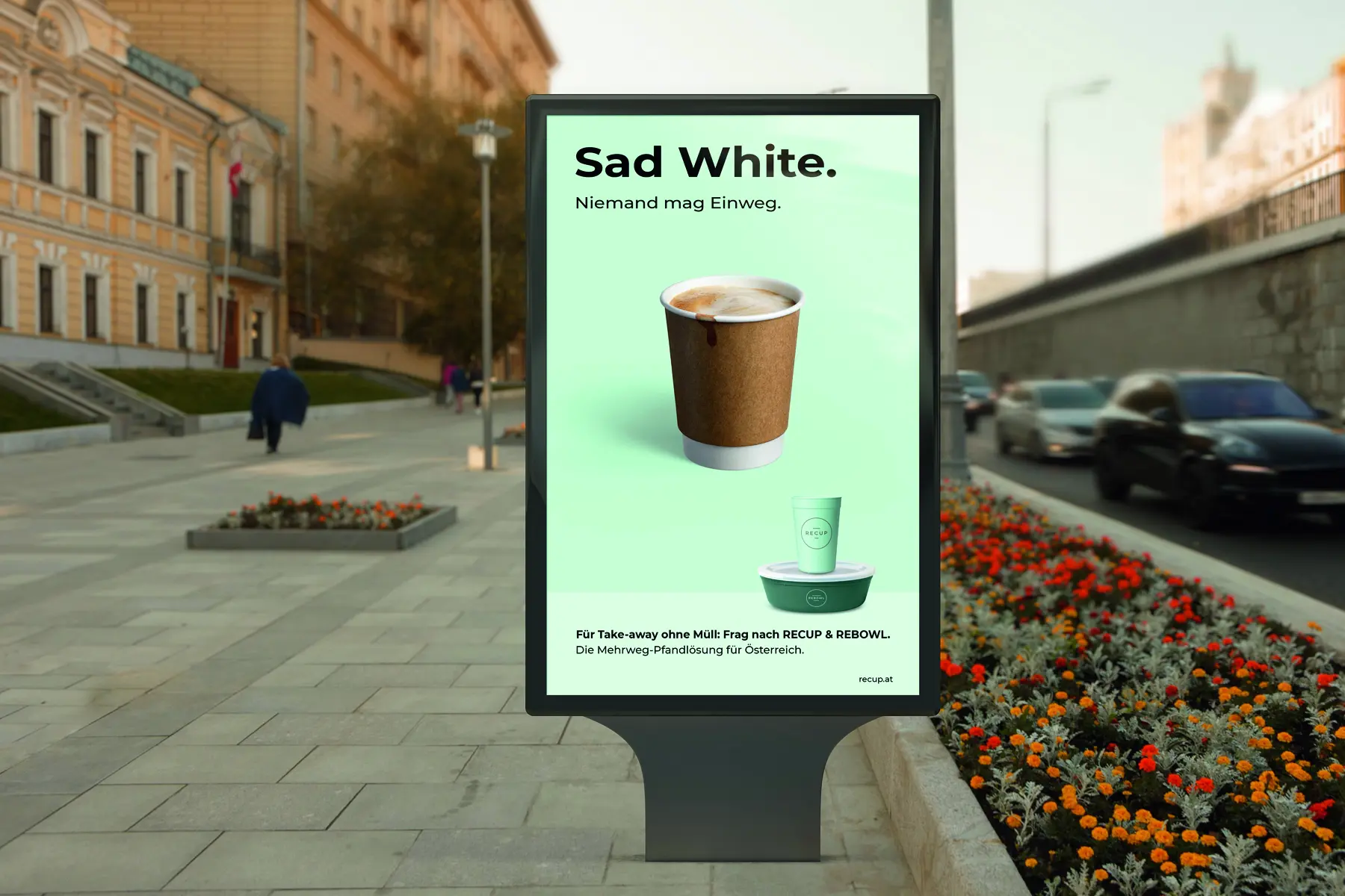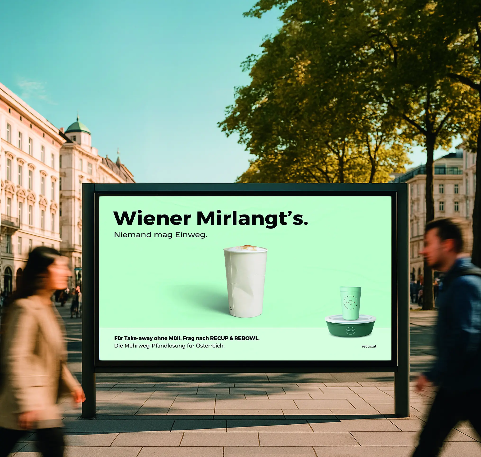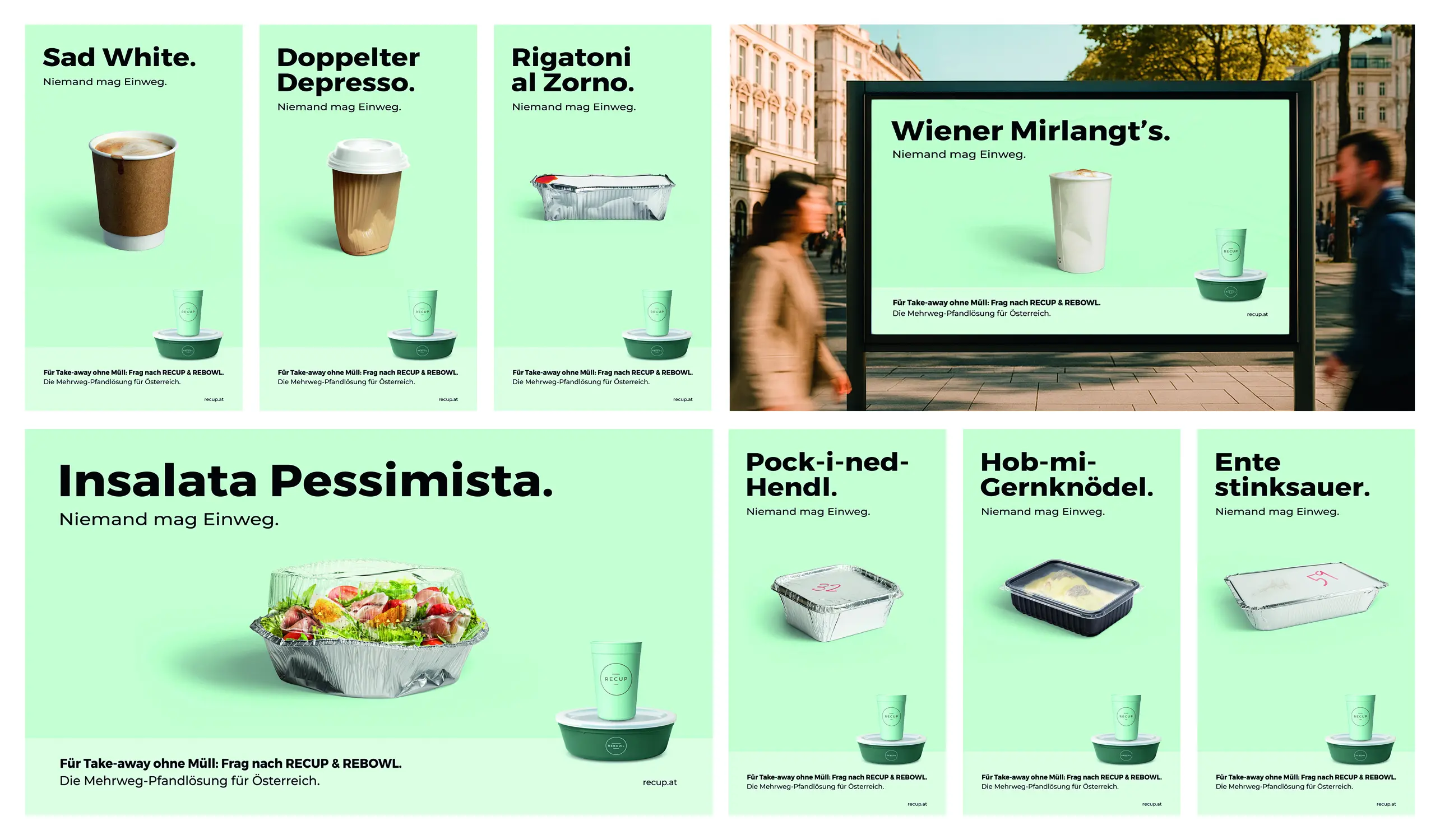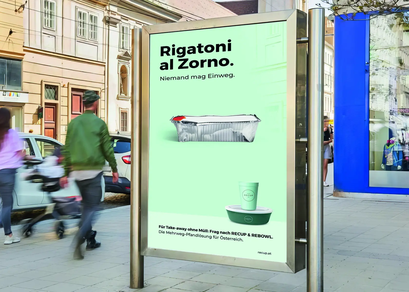 In Vienna, 100 million pieces of take-away packaging are thrown away every year. The RECUP & REBOWL reusable deposit solution can put an end to this ecological madness. An awareness campaign should publicize the brand. Instead of pointing a finger, we opted for a humorous campaign in keeping with the grumpy Viennese mentality. We had to-go classics express their displeasure with disposable packaging. The OOH campaign comprised print and digital motifs, placed near universities, technical colleges and the gastronomy scene. The surprising word creations not only attracted attention offline.