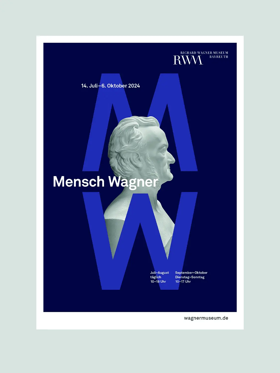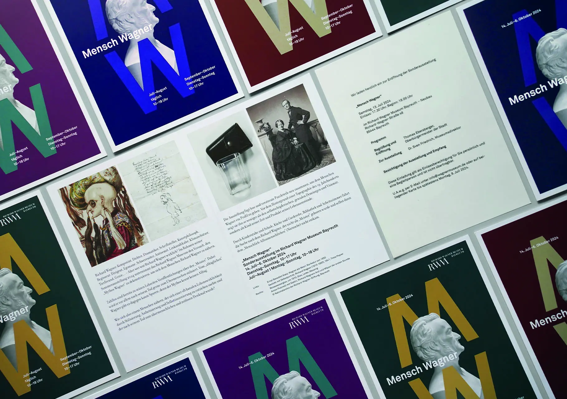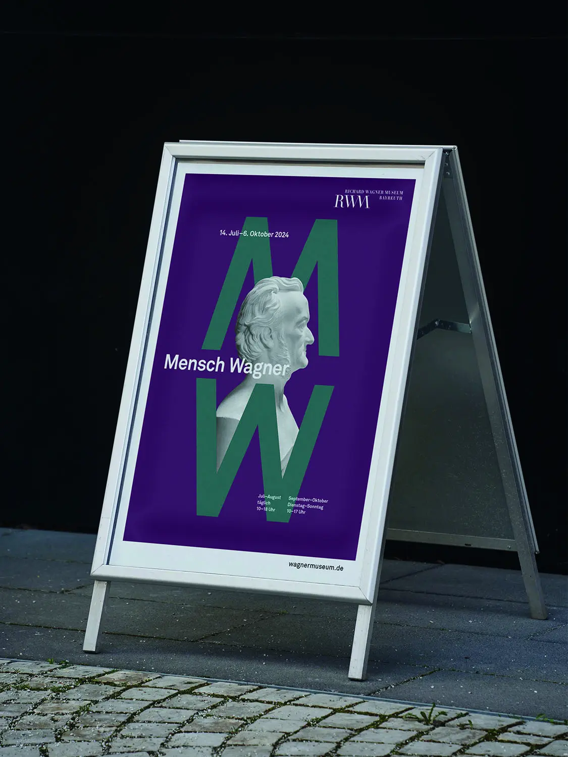 Who was Wagner, really? The Richard Wagner Museum Bayreuth’s 2024 summer exhibition sheds light on the man behind the composer. The visual design concept of the exhibition "Mensch Wagner" emphasizes Wagner’s fondness for bold colours. All communication materials were developed using a four-colour scheme inspired by this palette. To enhance the impact of the out-of-home campaign throughout the city, the posters can now, for the first time, be seen in four different colours all across Bayreuth.
