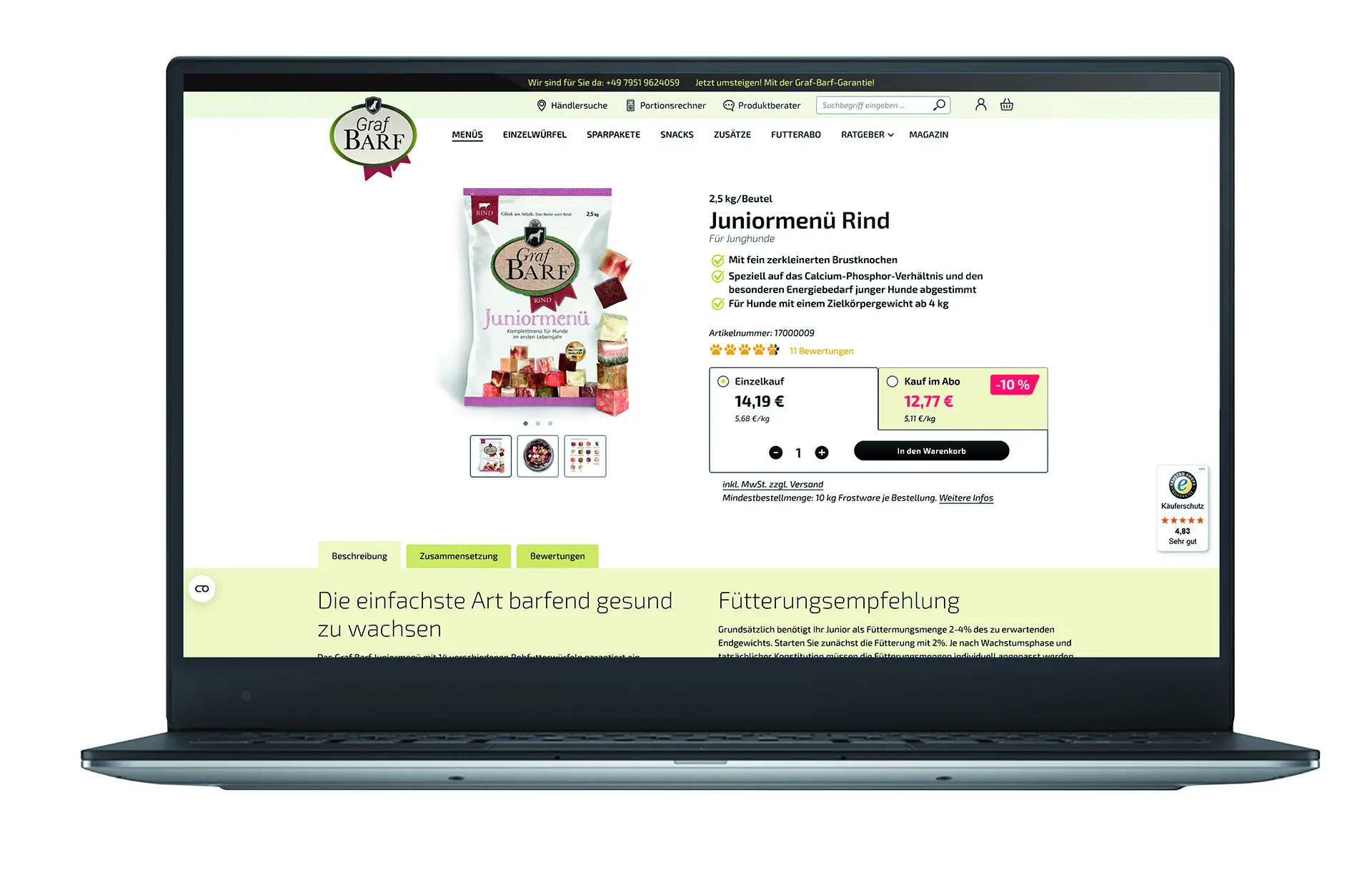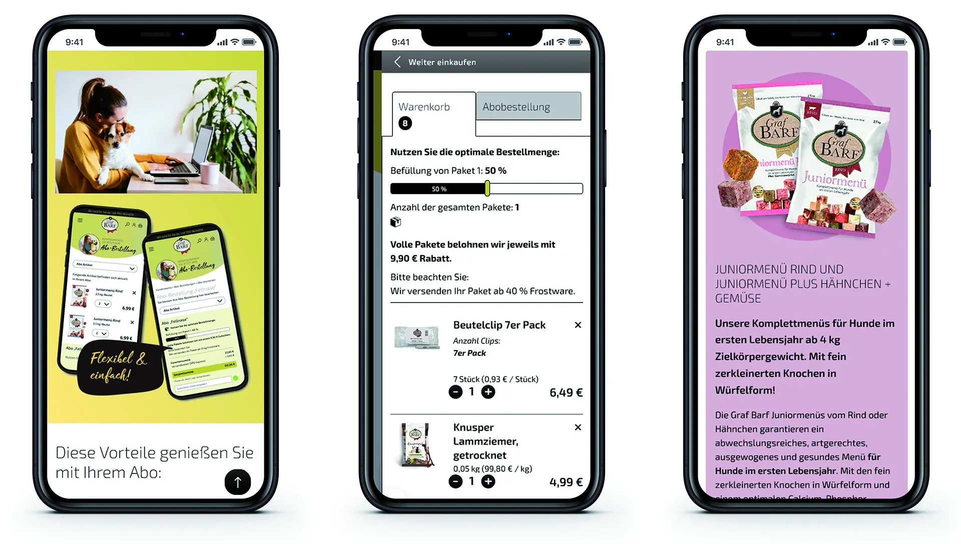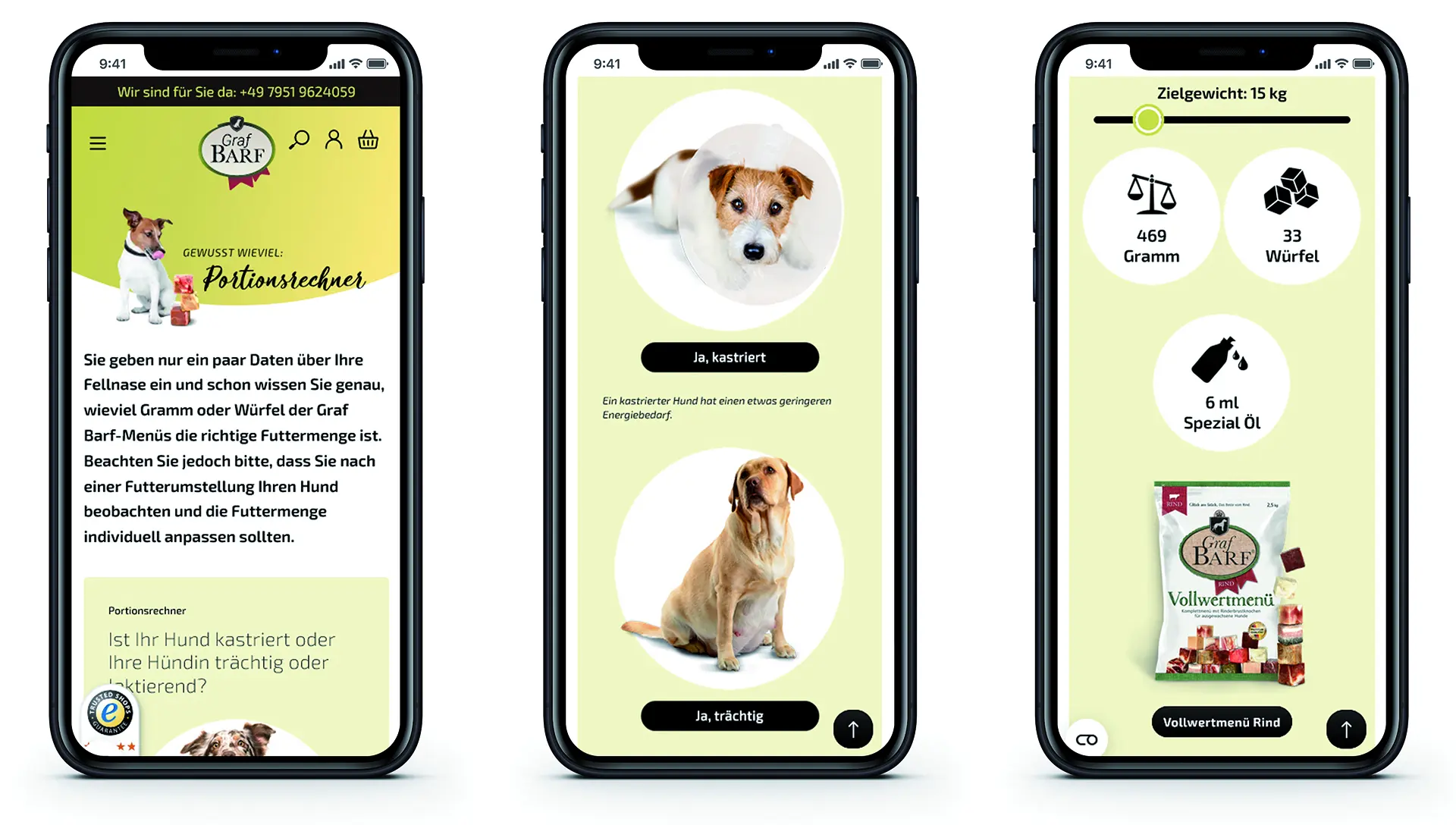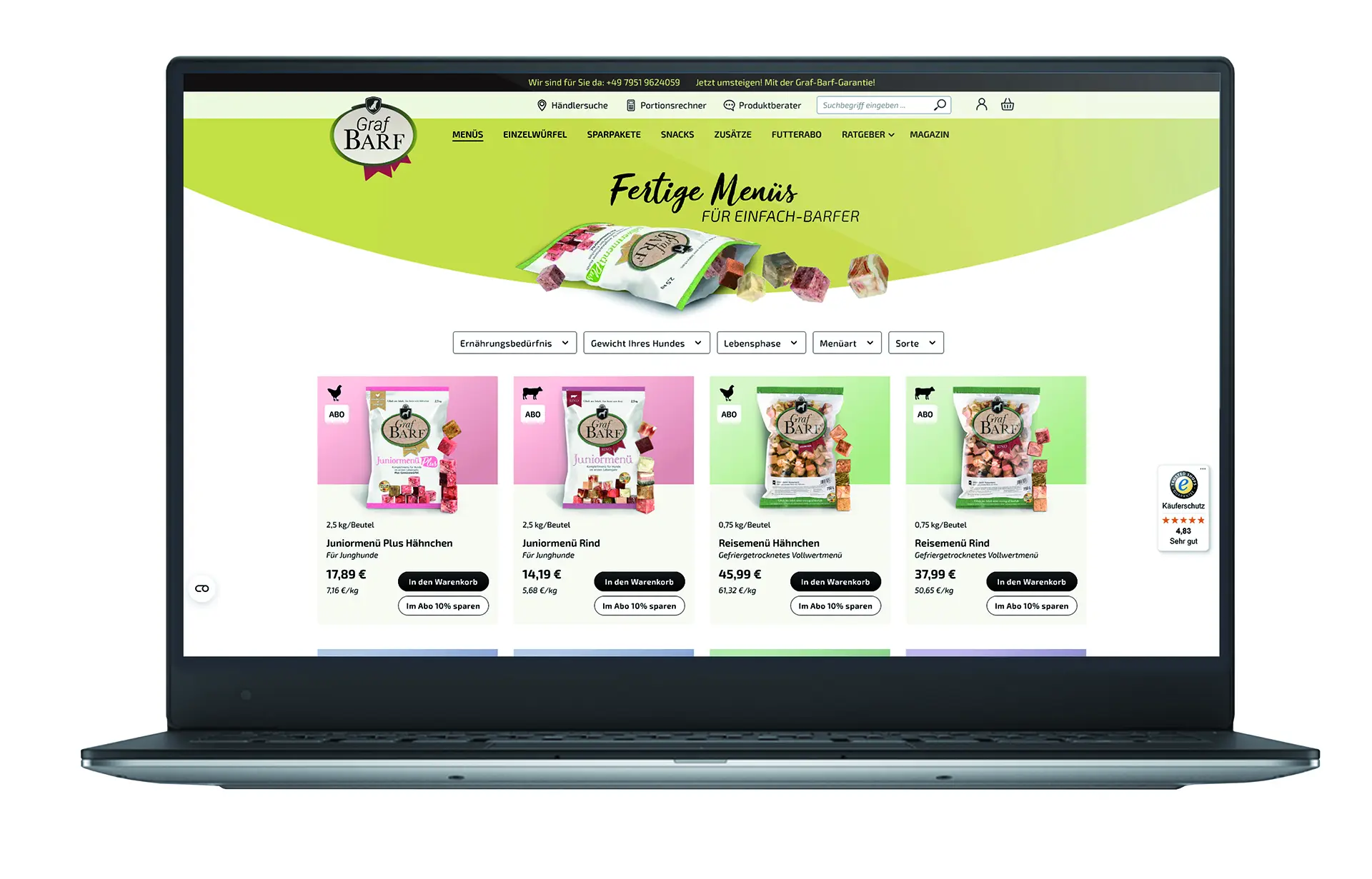 Graf Barf is a supplier of premium-quality portionable raw food cubes from Germany. Dog owners can configure and order ready-made menus, individual rations and snacks in the online shop. A portion calculator helps to determine the optimal amount of food for the dog’s breed, age, size and weight. A subscription model allows recurring orders and regular deliveries. A bonus programme and referral programme increase customer loyalty, while comprehensive tips and guides provide useful information. An affiliated breeder and dealer portal adequately addresses other user groups.