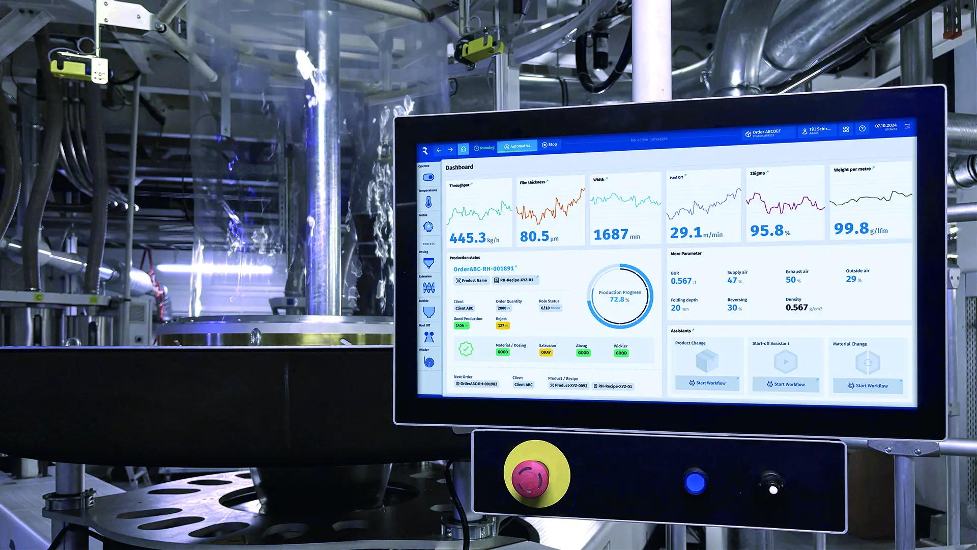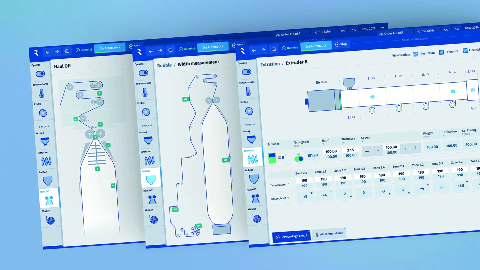 A company-wide user interface was developed for the Reifenhäuser Group, in which the three business areas of blown film, flat film and nonwovens are combined for the first time in a consistent design language. The aim was to harmonise the company's historically developed, diverse requirements. The user-centred process included context analyses and usability tests. The result is a modular, scalable UI that combines technical complexity with user-friendliness. A graphical band metaphor provides visual guidance, while assistance systems, illustrations and clear hierarchies facilitate the secure management of sensitive production processes.