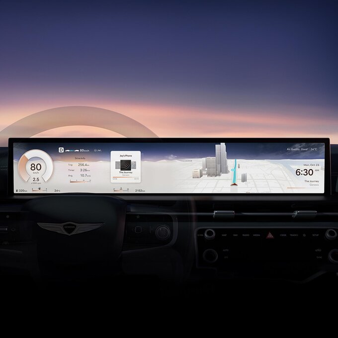 The infotainment system for vehicles provides an innovative connection between the interior and the environment by seamlessly integrating and displaying information. It facilitates the operation of complex functions and dynamically adapts to external conditions to ensure improved interaction and safety. The ‘Genesis Panoramic Infotainment System’ creates a new level of user experience.