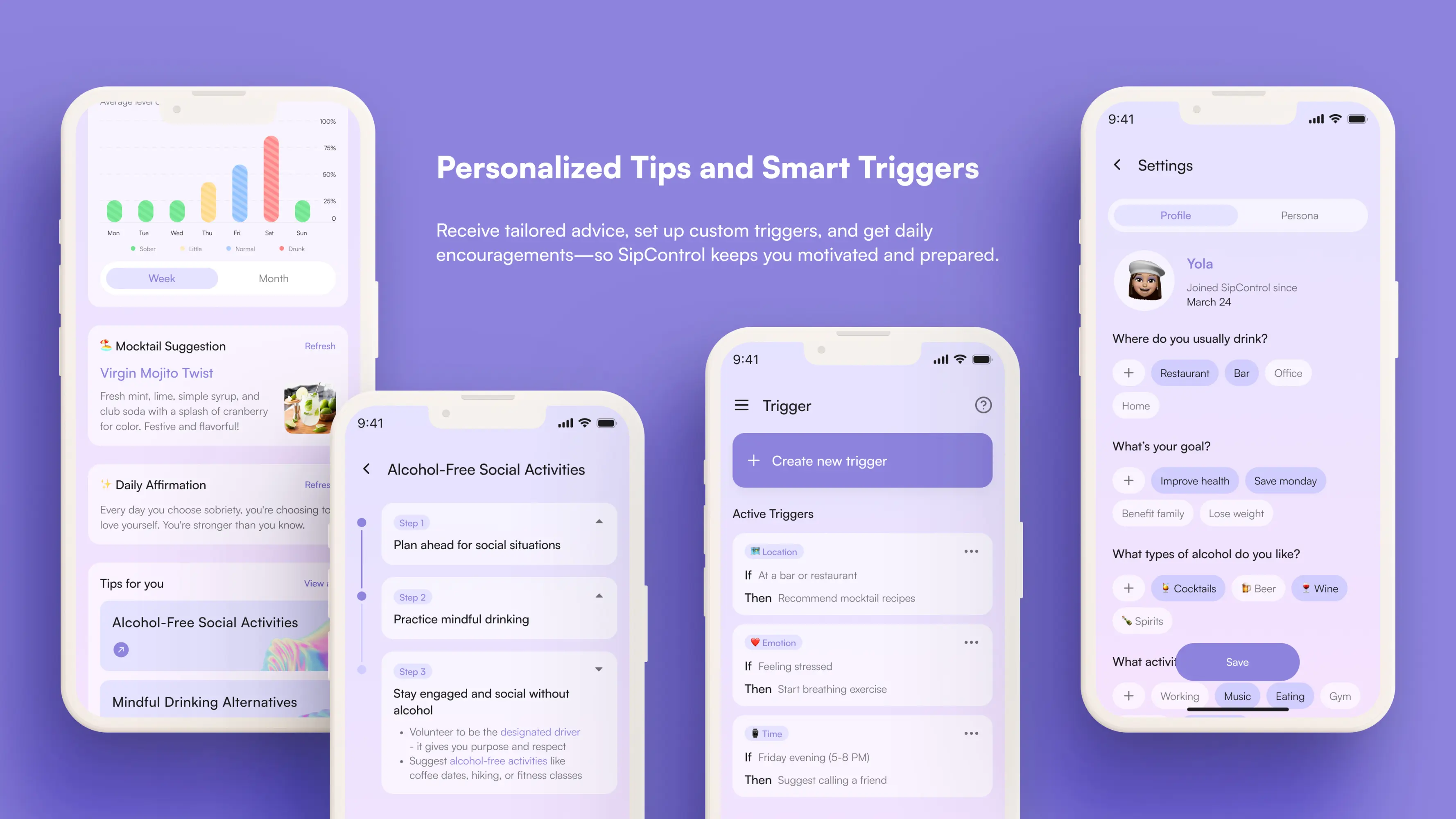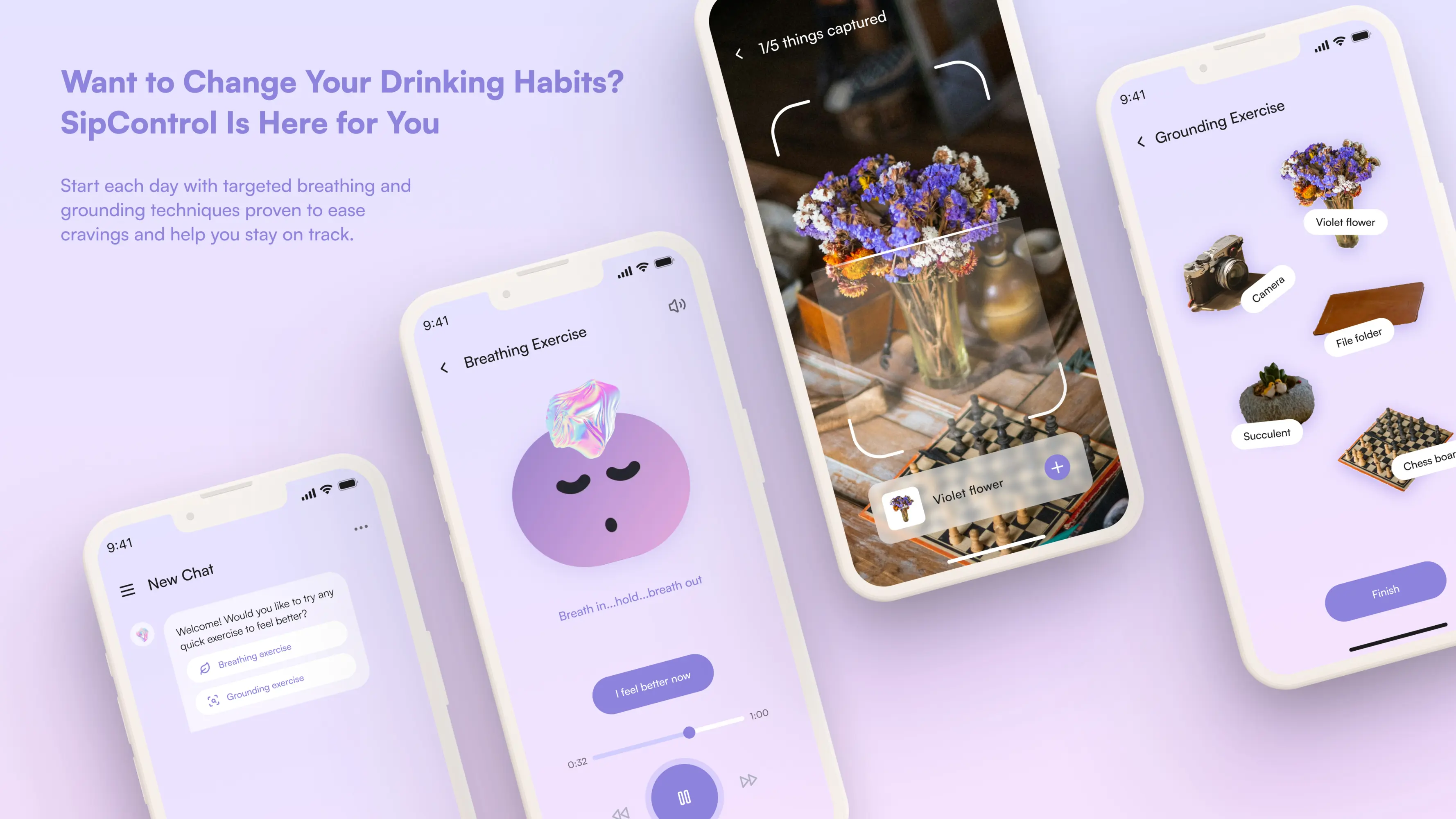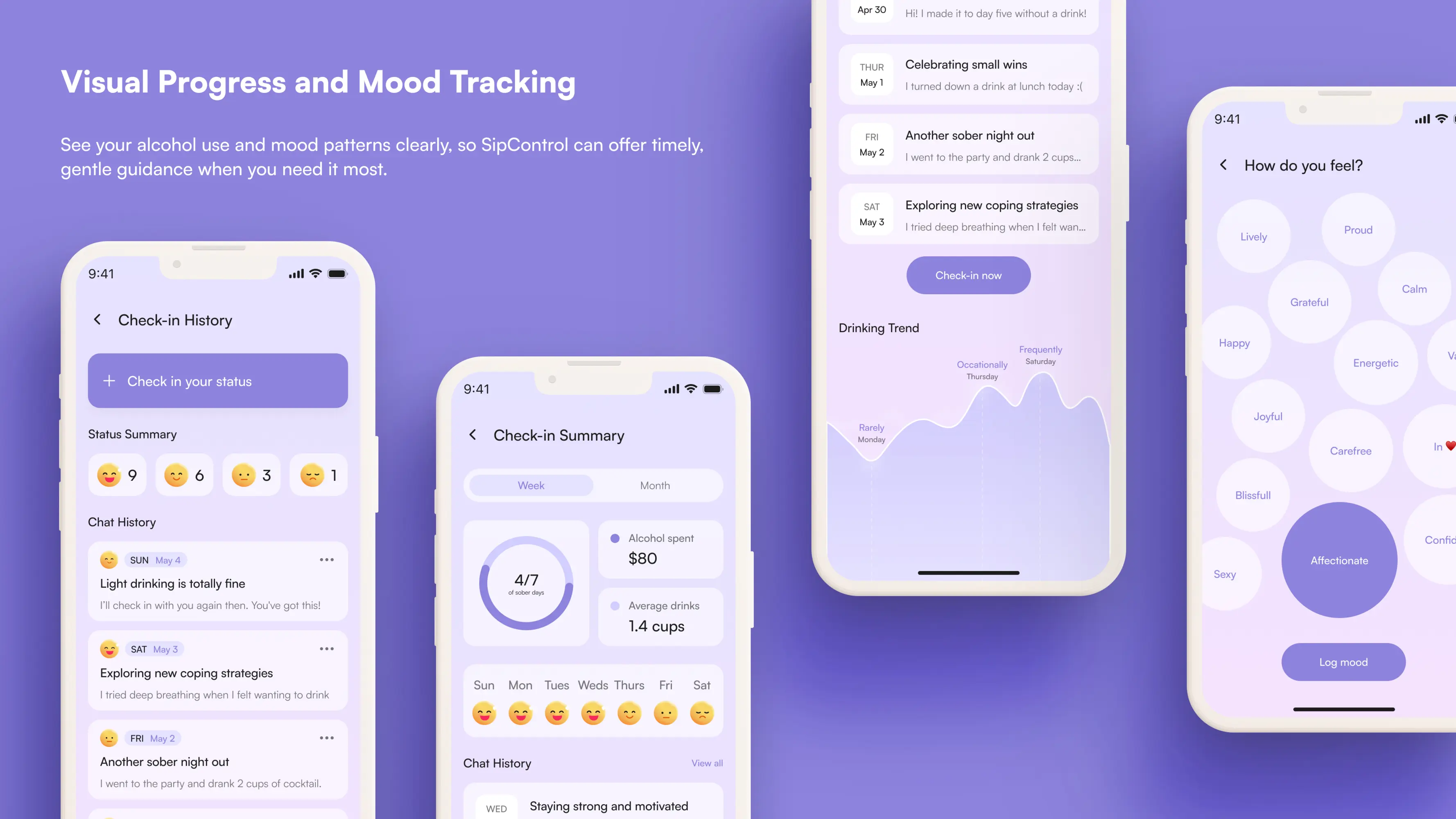 SipControl is a supportive mobile app that helps people build healthier drinking habits through mindfulness, self-awareness, and positive reinforcement. It combines daily breathing and grounding exercises with clear visualizations of alcohol use and mood patterns, offering personalized tips and encouragement tailored to each user’s journey. By turning progress into achievable goals and real-life rewards, SipControl makes behavior change feel motivating rather than restrictive. With its empathetic, non-judgmental design, the app reduces stigma and empowers users to make lasting, sustainable changes.