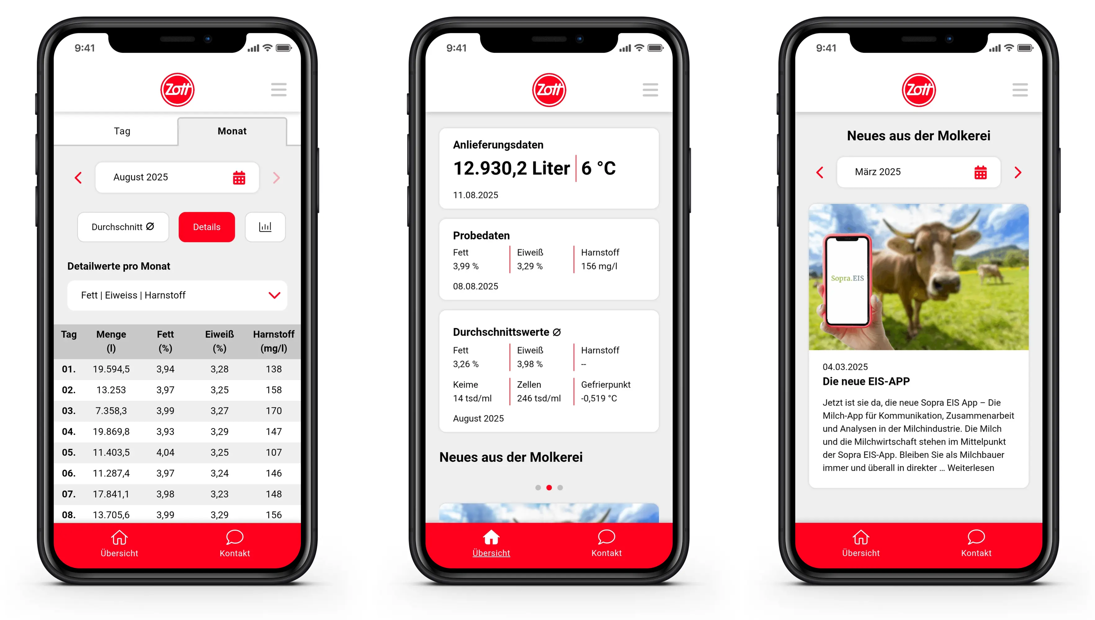 Dairies and milk producers manage their data in real time: deliveries, milk payments, and laboratory results. With the mobile app from ERP provider Sopra, dairies can provide farmers with up-to-date information and request data directly for their own planning purposes. Various view options are available and can be individually configured, meaning that back and forecast data can also be accessed in the barn. Farmers register using their existing profile and can manage everything centrally. Dairies that offer the service to farmers can brand the app according to their own corporate design specifications, thanks to its modular structure.