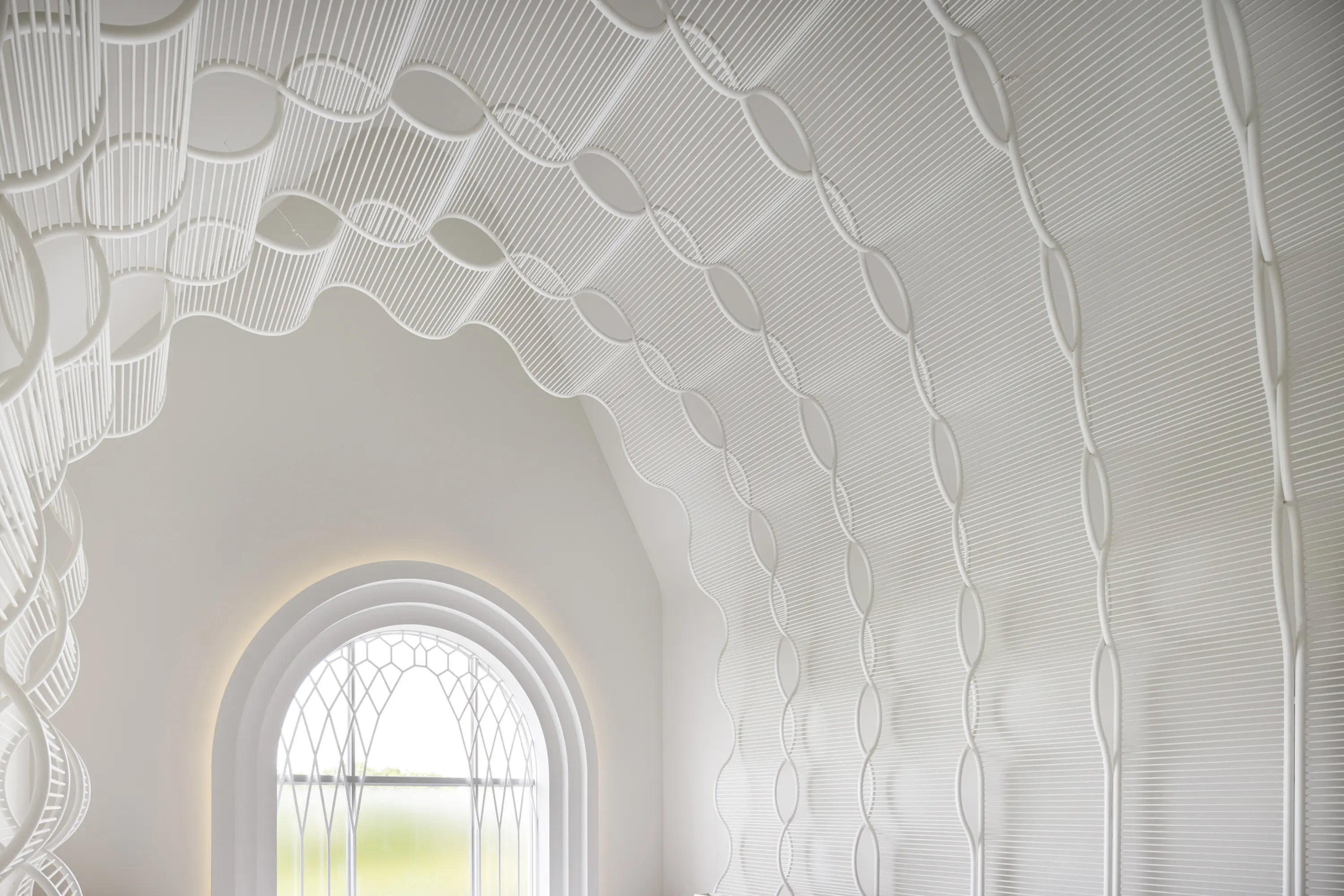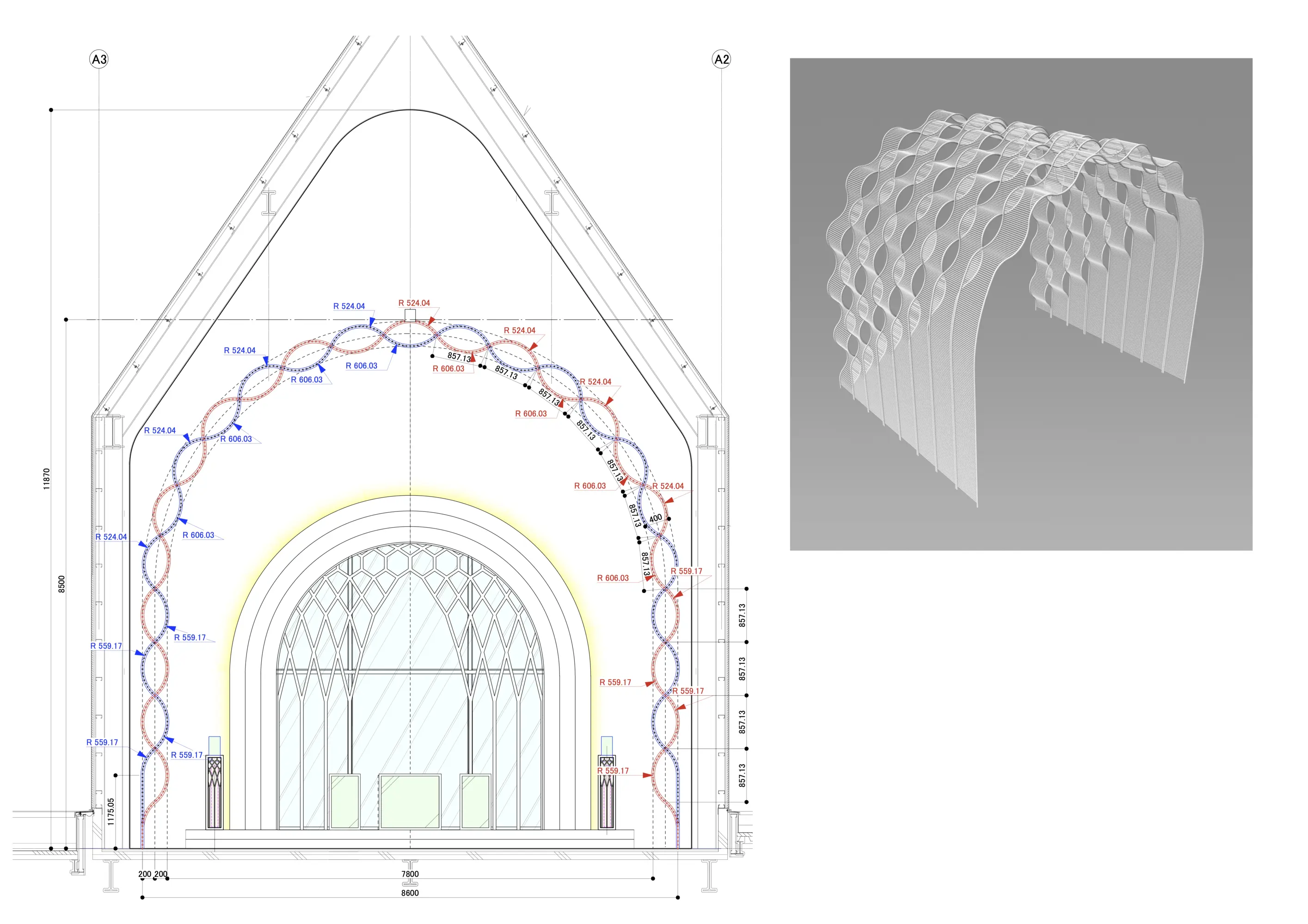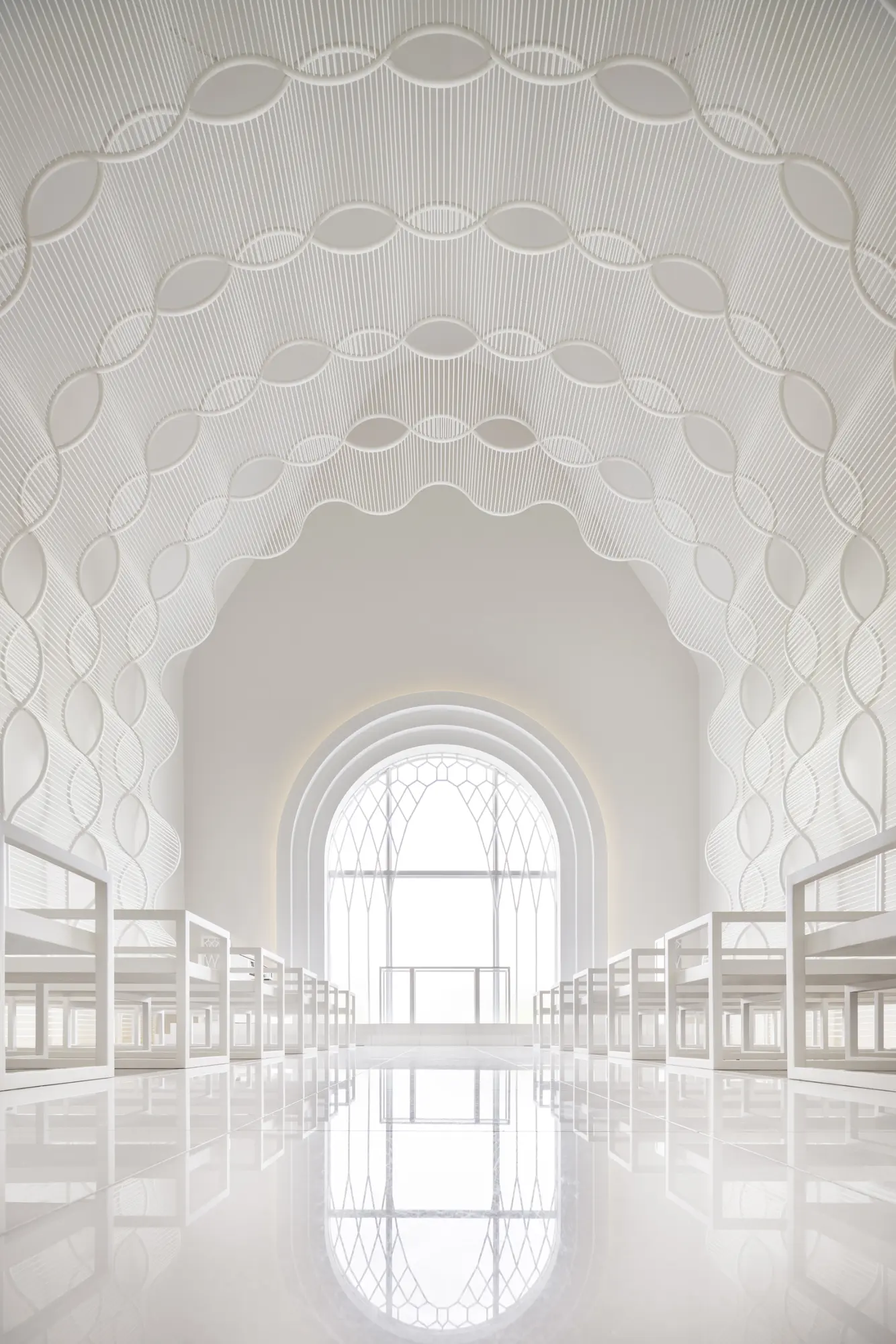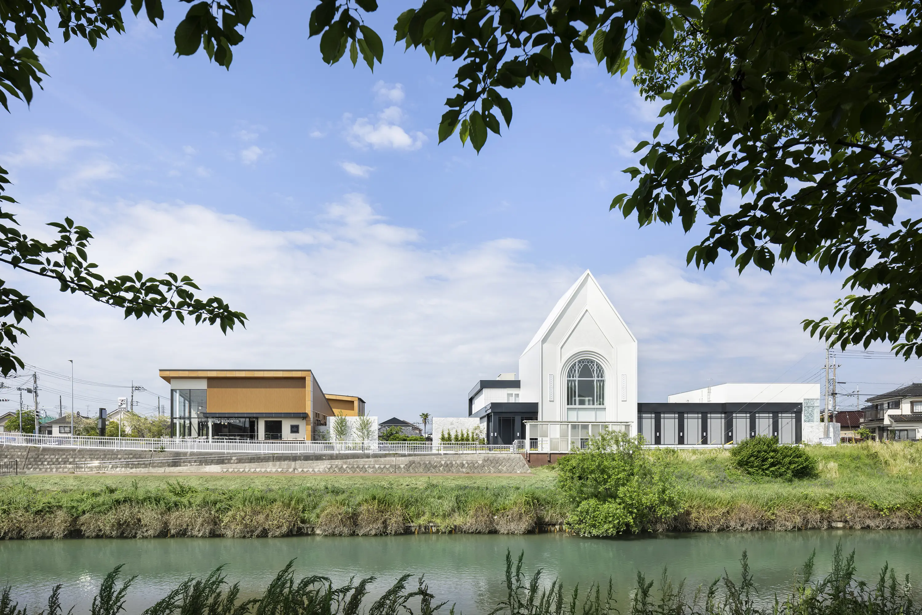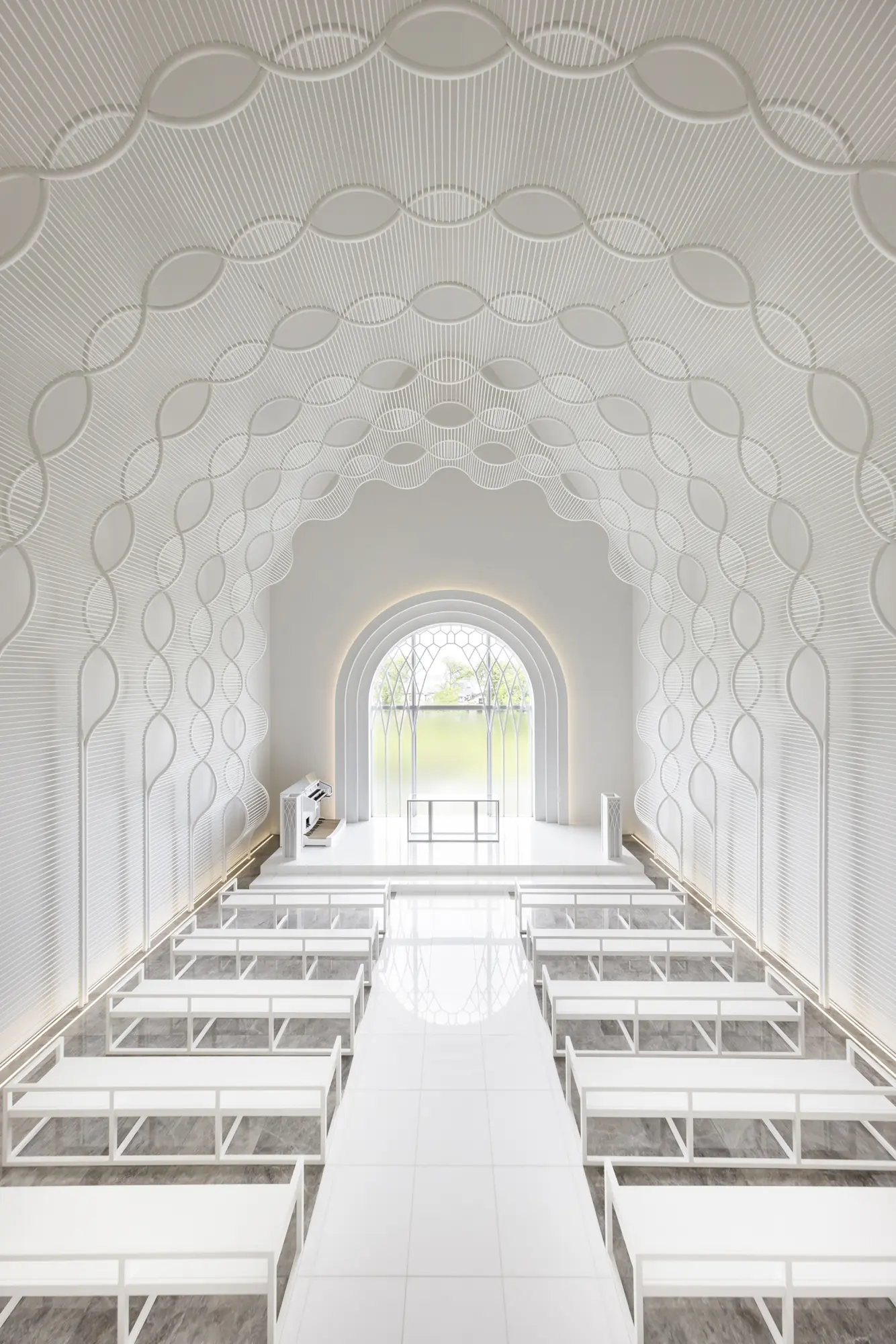 A wedding complex completed in Koshigaya City. We aimed to create the chapel being sacred, and immaculate. The energy inherent in all beings is transmitted as waves, resonating. In this chapel, it was expressed that the energy for the future spreads as waves. A freestanding frame is 8.5 m high, made of steel pipes in the form of wavy curves, and connected horizontally by inverting the R shape. The spread of the waves is depicted by increasing the number of curves in each frame.