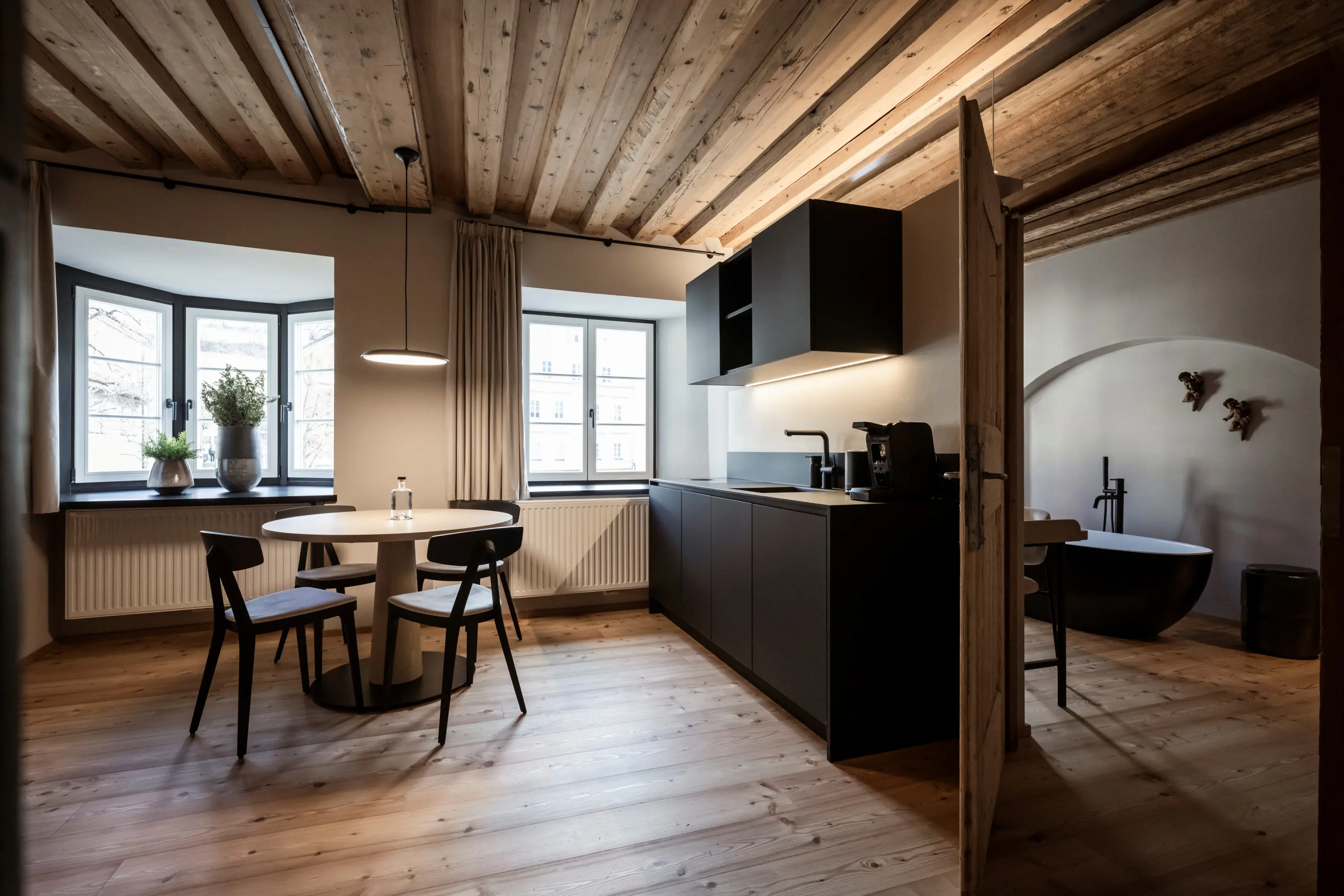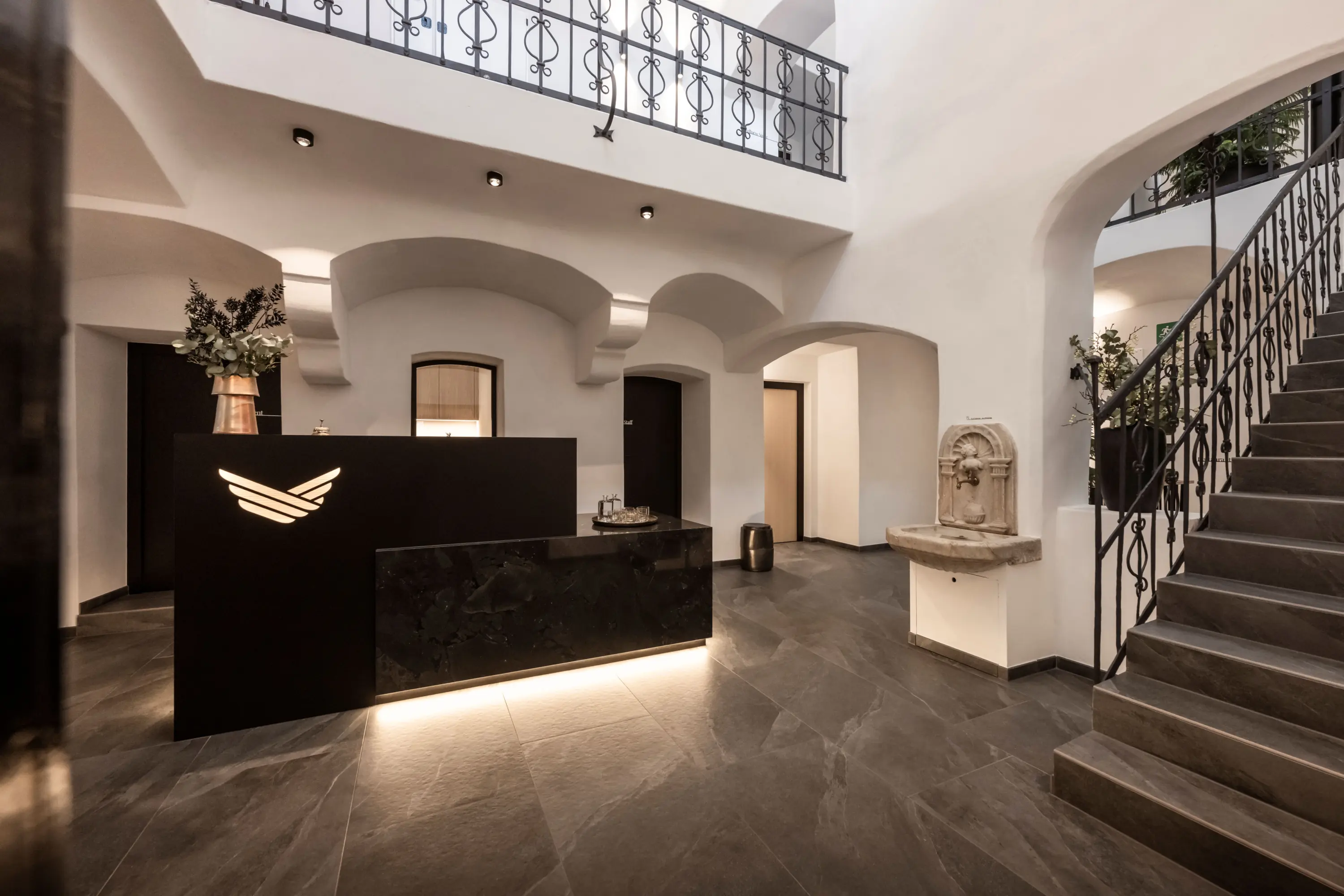 The historic old town of Vipiteno has been revitalized by the Hotel Schwarzer Adler, a 4-star hotel with 28 rooms. A charming blend of antique and modern elements has been created in each room. The hotel includes a lobby, a fitness area, a small wellness area, a restaurant with a listed 'Schwemme', a bar, and storage areas for skis and bicycles. The ground floor is wheelchair accessible via a second entrance.