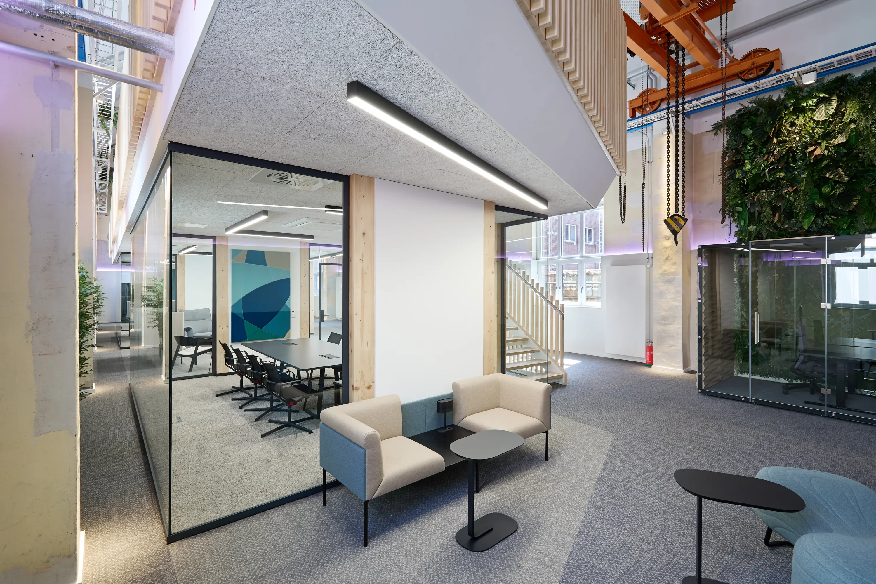 A former industrial site has been reimagined as a New Work office. Within the industrial park, a striking hall preserves its historic fabric while introducing contemporary workspaces. The existing structure is reinterpreted with agile zones for focus, retreat, and collaboration. A suspended volume with cubistic forms appears light and elegantly floating. Subtle lighting highlights transitions, while greenery softens the industrial character. A trinity of history, architecture, and innovation—an office world balancing heritage and future.