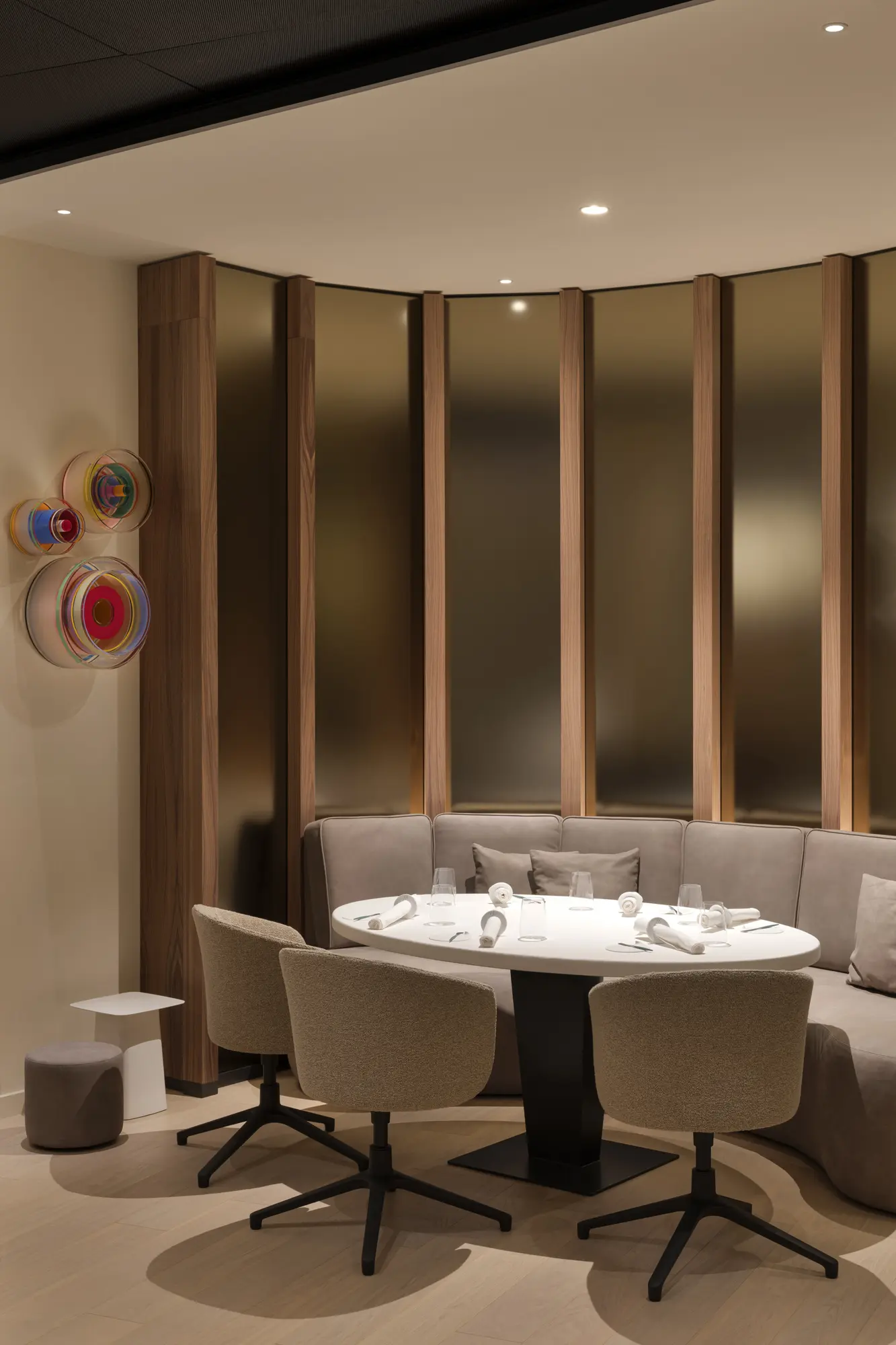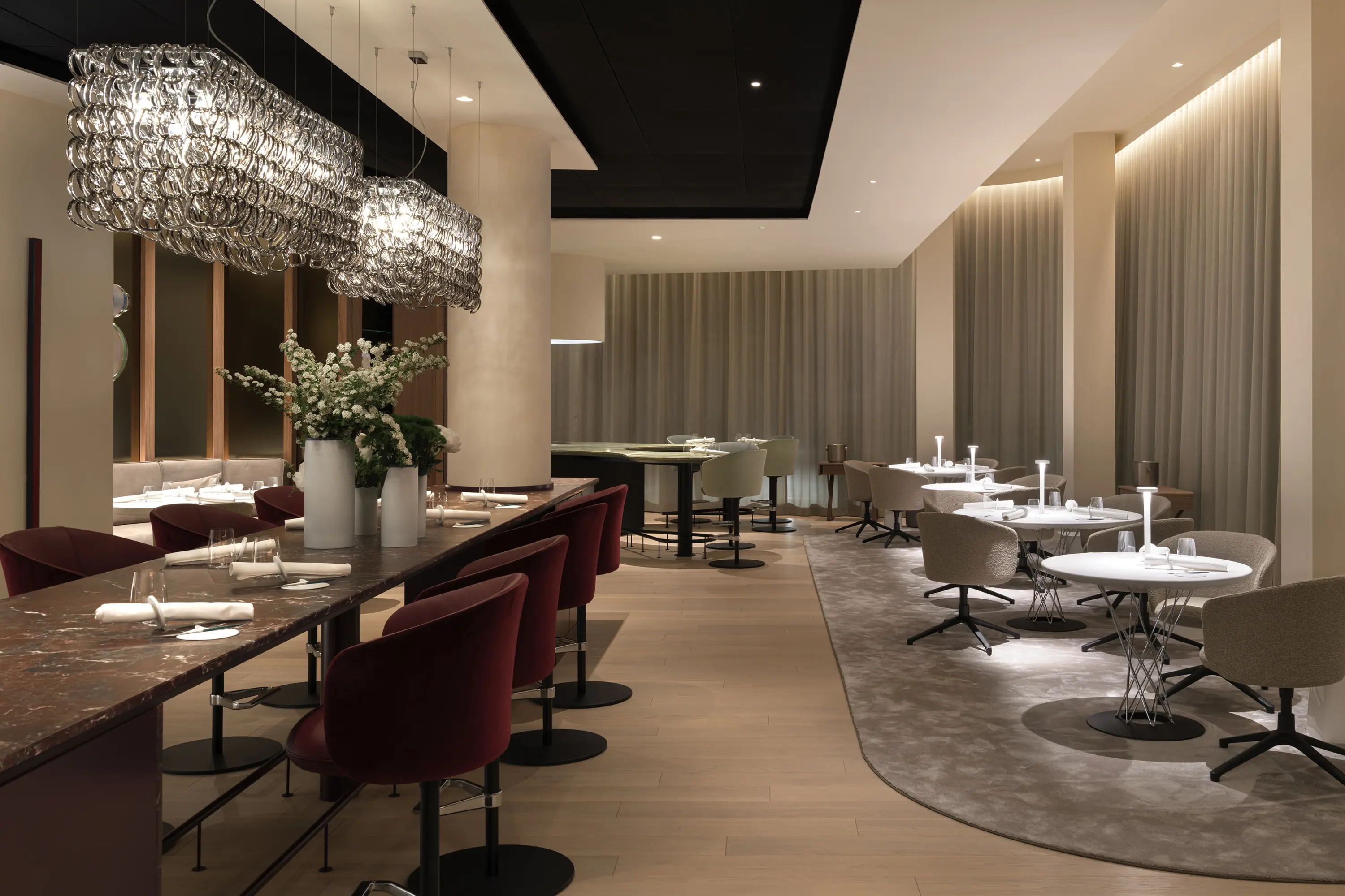 The restaurant of internationally renowned chef Thomas Bühner combines two culinary worlds—French and Asian—in an exciting yet harmonious fusion. The interior design creates an inviting backdrop for the culinary masterpieces and is characterized by a formal minimalism that is brought to life by the changing materials and colours.