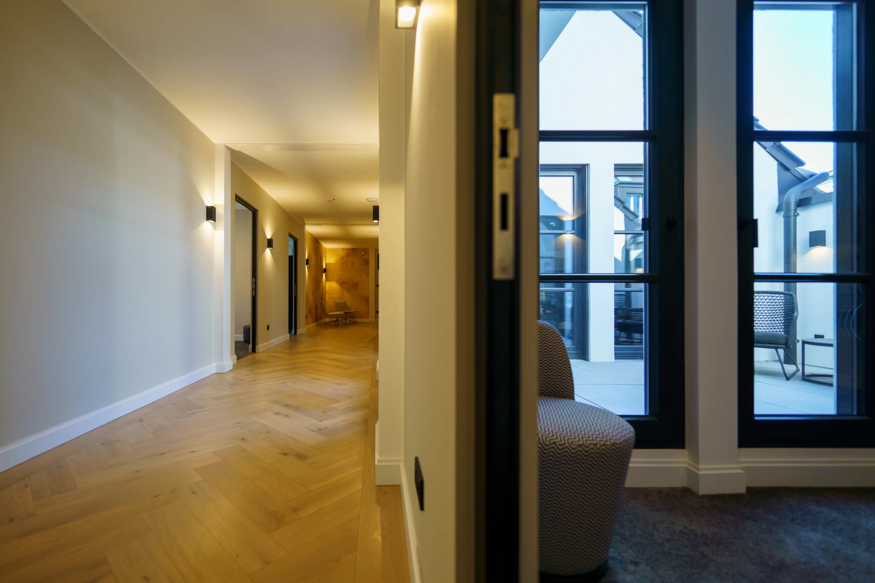 The new office of Bahners & Schmitz GmbH covers around 940 square metres and extends over three floors, including roof terraces and loggias. The project was completed in May 2024. The original “Mäschig-Hof,” as the square courtyard in Düsseldorf-Heerdt is called, was built in 1833 and has undergone a complete refurbishment. From the very beginning, the main objective was to develop a sustainable building that integrates harmoniously into the existing urban landscape.