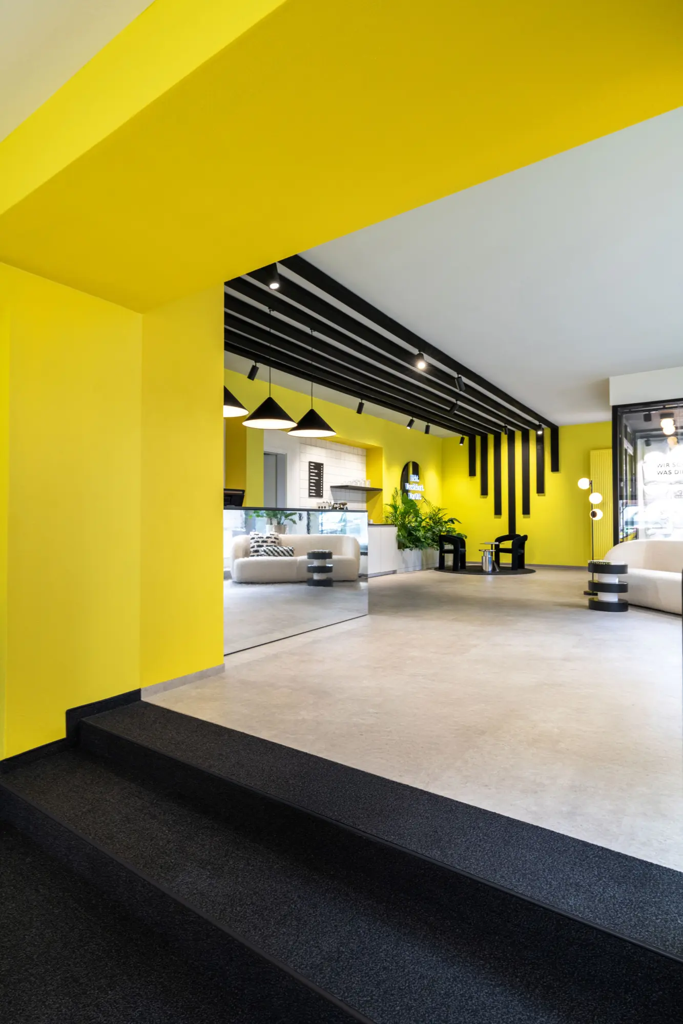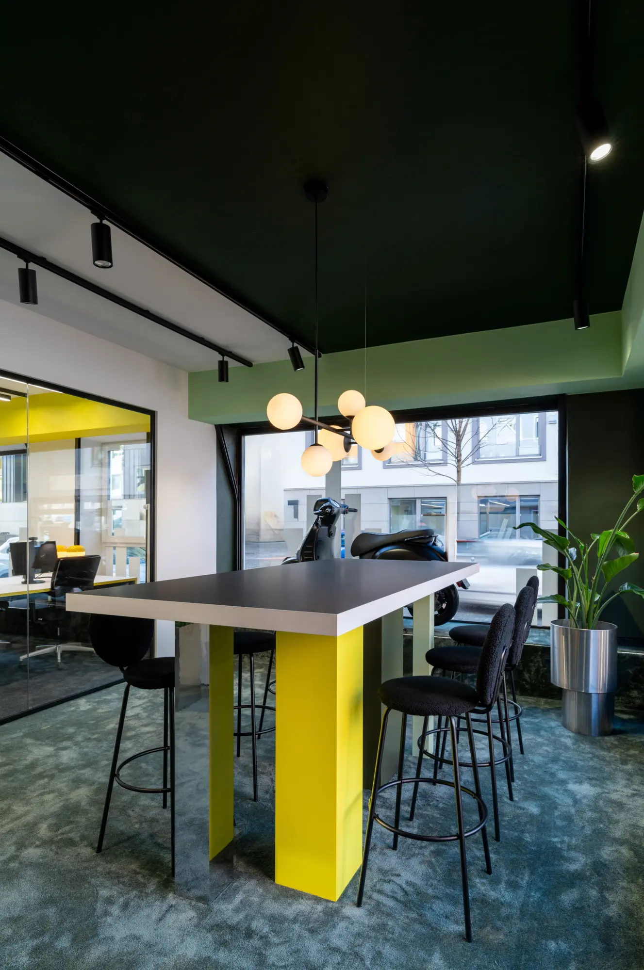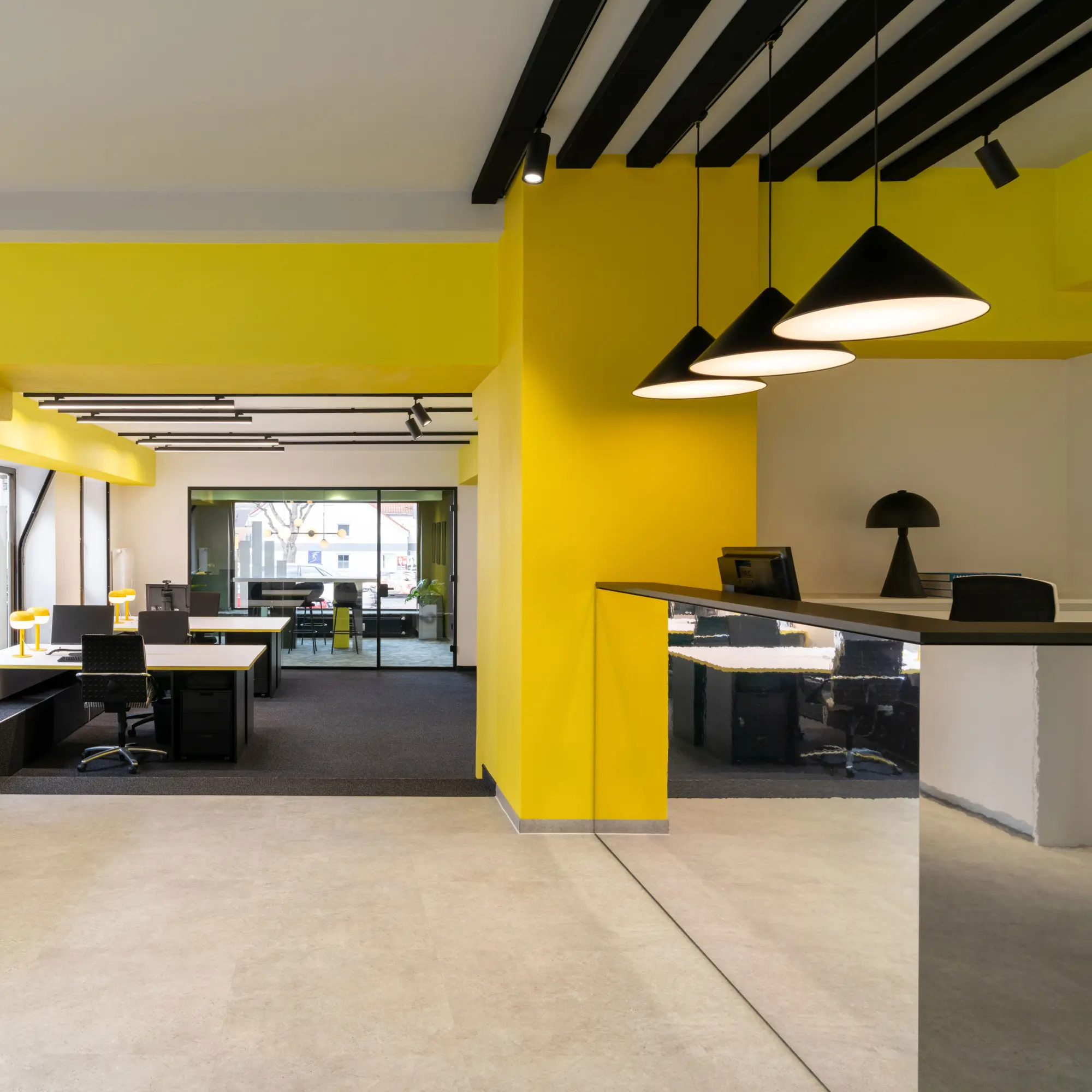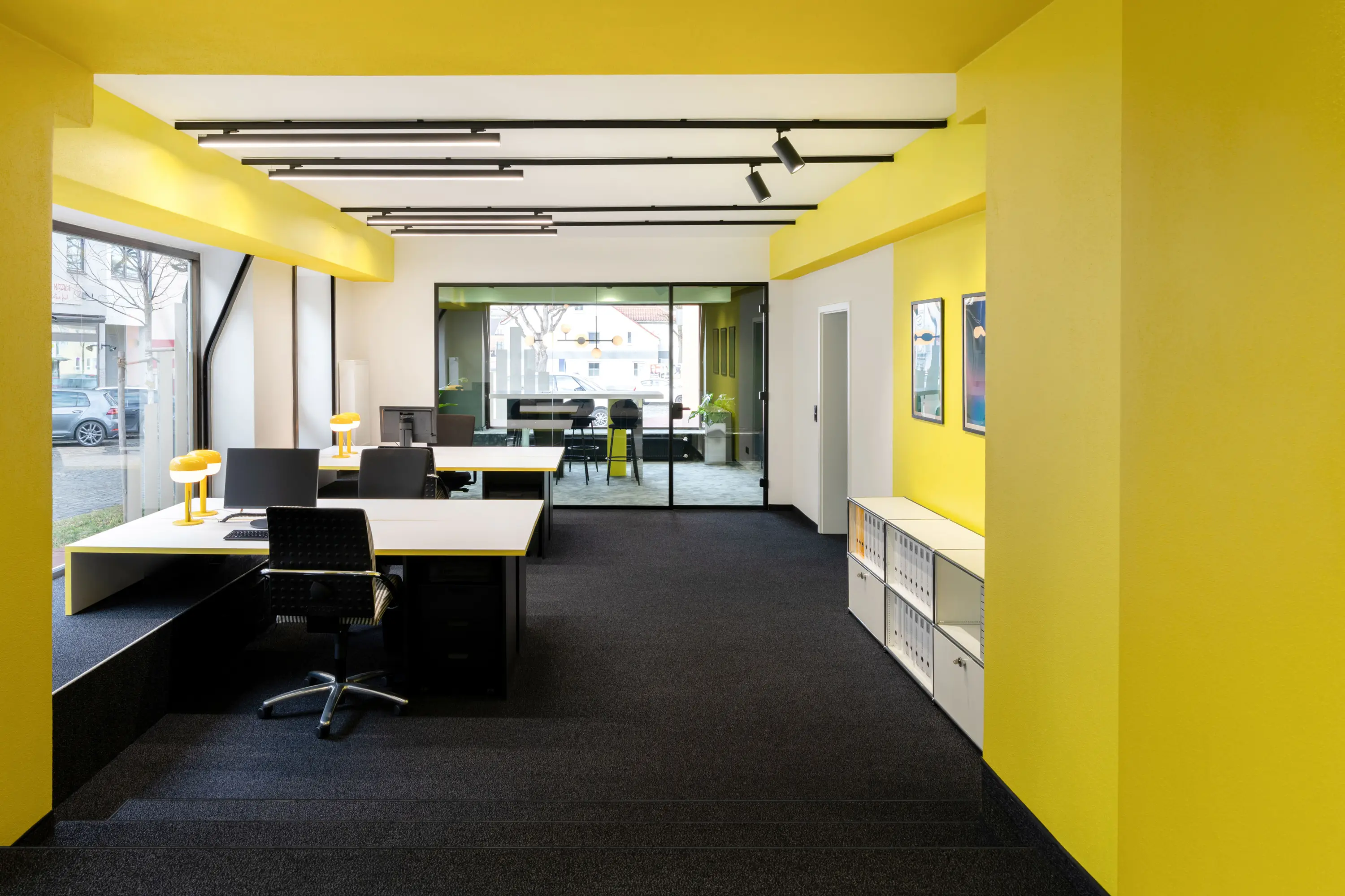 With the move to its new premises in Dachau’s old town, the Mecklenburgische Versicherung begins a new chapter. The design by Sebastian Zenker consistently applies the corporate colours yellow, black, and white. A highlight is the abstract ceiling installation of the logo in acoustic slats, visible from outside. A mirrored reception desk, a minimalist coffee station, yellow accents, playful furniture, and greenery shape the atmosphere. Homely workspaces with rugs and window niches create a modern, functional environment that reflects the company’s identity.