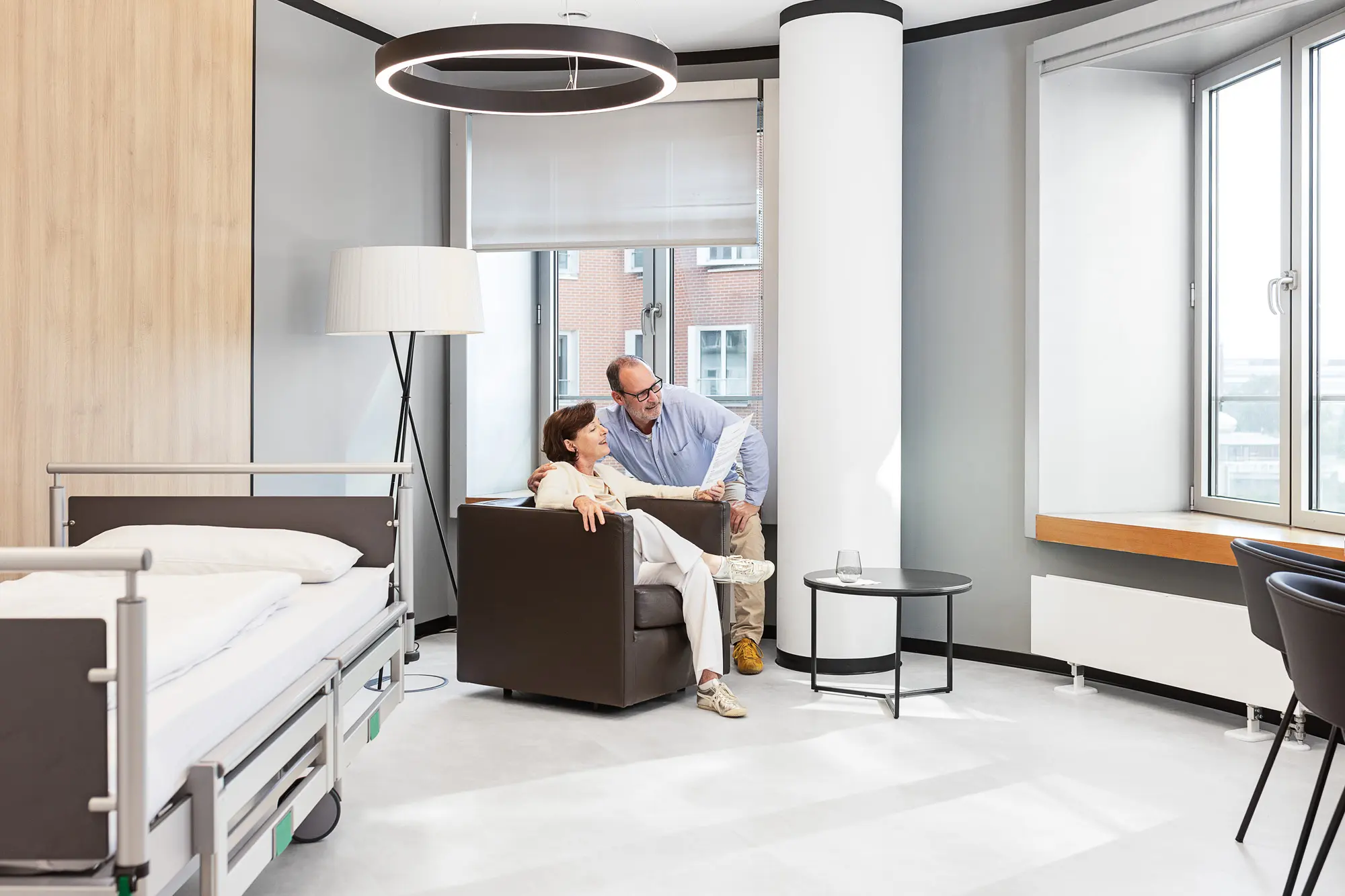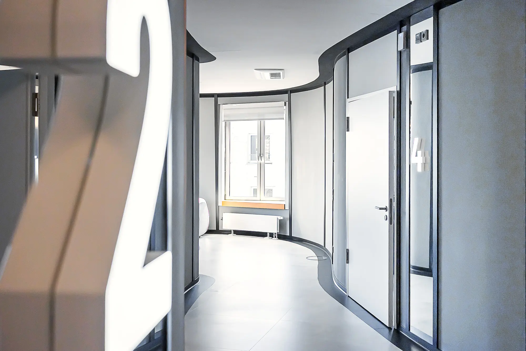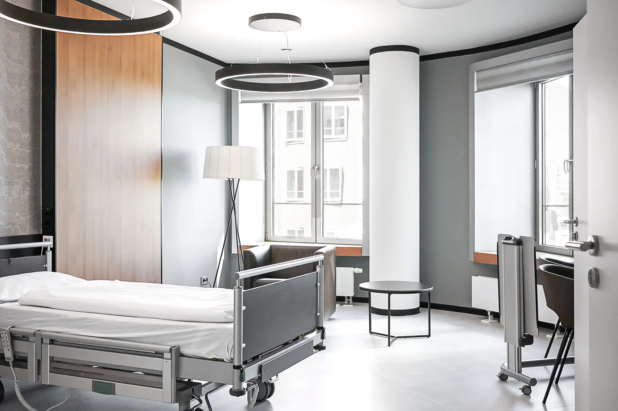 Plastmed is a highly functional clinic building in Düsseldorf's Medienhafen that rethinks architecture, design and medicine. The conversion combines maximum functionality with monument protection requirements. The iconic Gehry ensemble combines two daylight operating theatres, elegant reception areas and individually designed patient rooms with a hotel feel. Warm materials, reflections of the river Rhine and an atmospheric lighting concept create an atmosphere that combines comfort and precision. Architecture, medicine and design combine to create a holistic Plastmed experience - in one of the city's architectural landmarks.