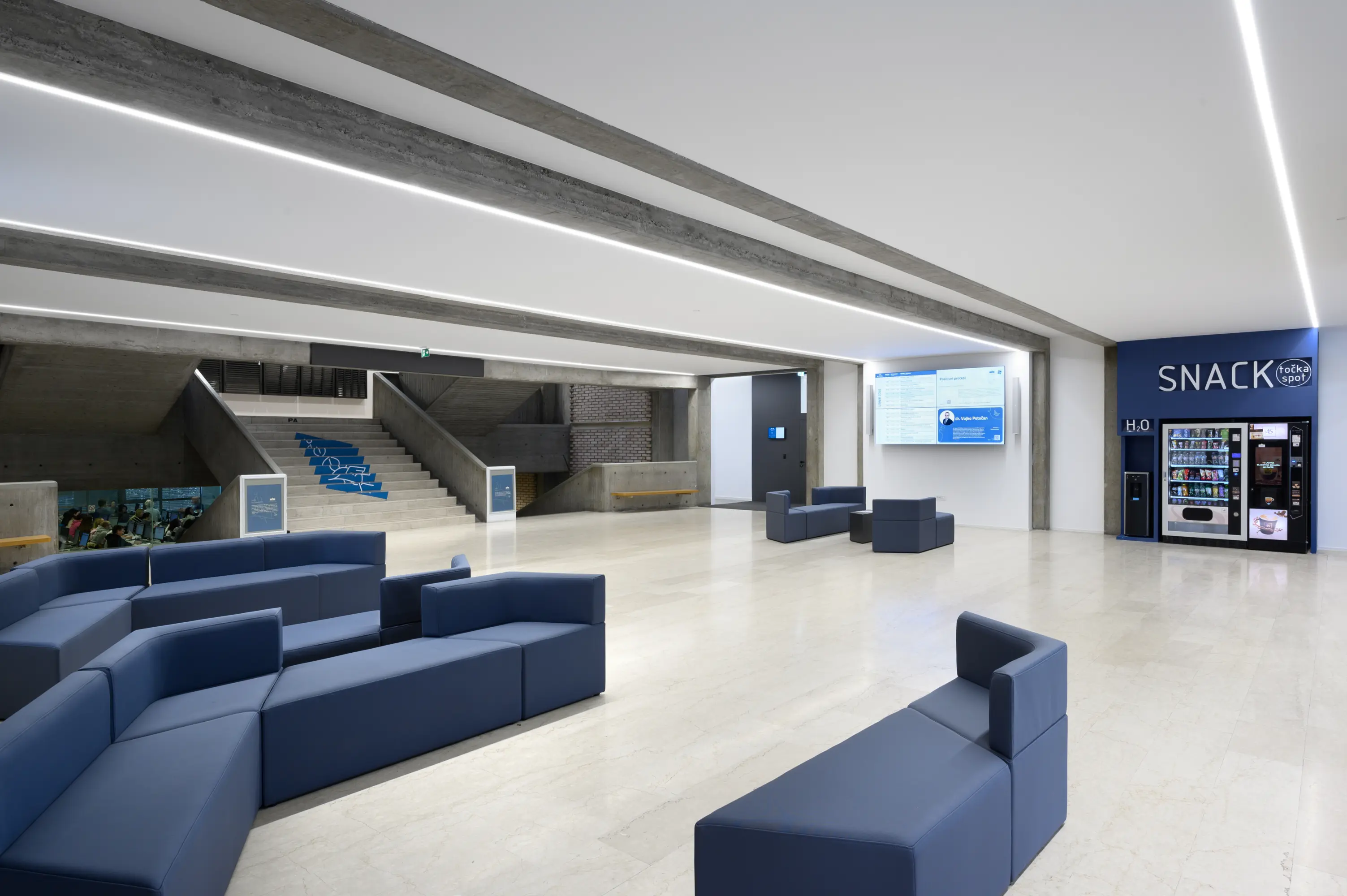 Renovation followed the principle of evolution, all unnecessary elements were removed, subtle and restrained modern was added, which emphasize the space, respects it and brings it to the new level. Guidelines were: sustainability, digitization and dialogue between the existing and the new. Moving through space is designed as a path to knowledge, guided by a blue thread: the base for creating the conceptual design and the colour scheme is taken from the logo of the Faculty. White colour gives the space freshness and a sense of light. Blue colour builds an accent of digitalization, dialogue with science and wisdom.
