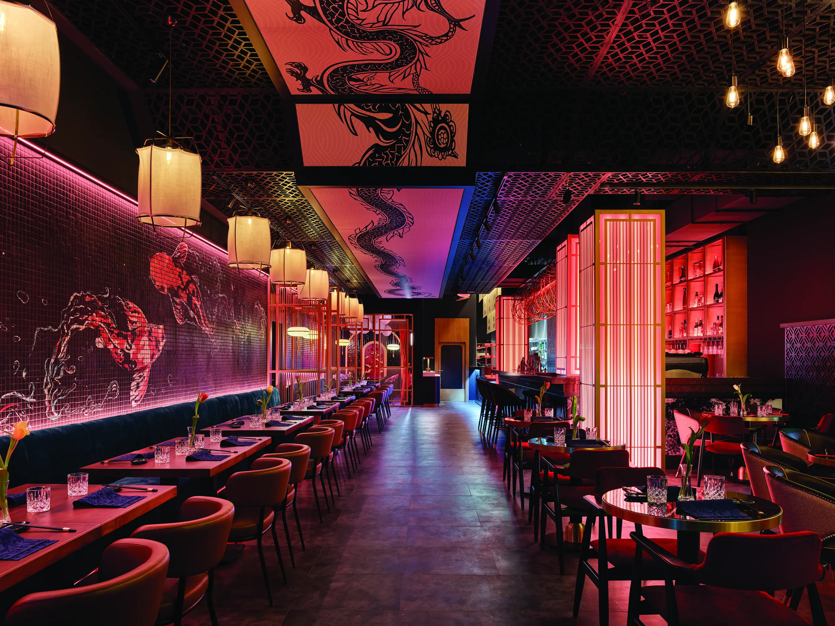 SHA GUO blends the authentic spirit of Asian cuisine with a contemporary atmosphere. The open kitchen engages guests in the process, creating a warm and transparent experience. Red and blue neon lights set a dramatic mood, while dragon motifs, koi fish, and calligraphy panels are reimagined with modern materials. Wooden details add warmth, stainless steel conveys modernity. SHA GUO stands as a strong social meeting point where tradition and modernity come together.
