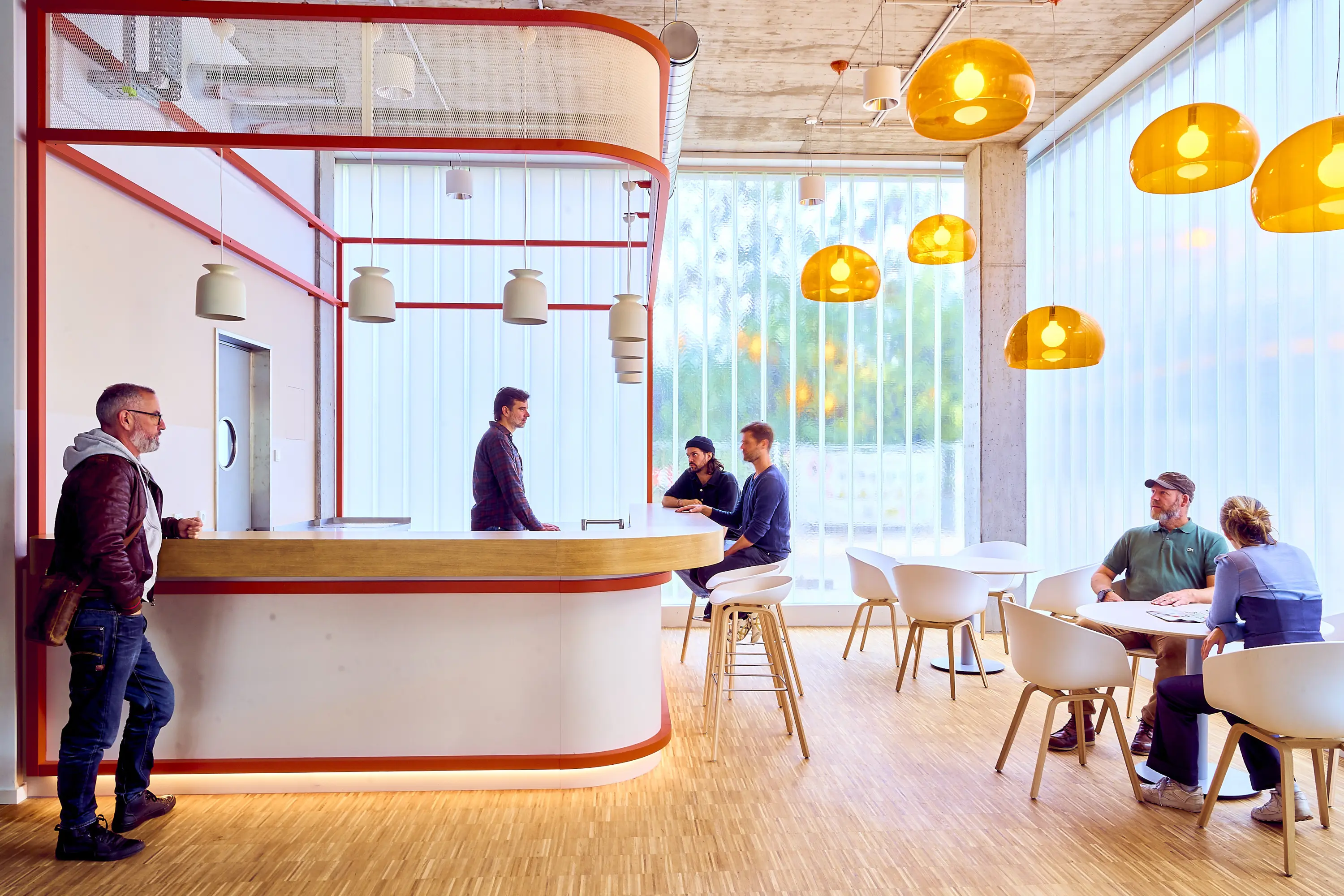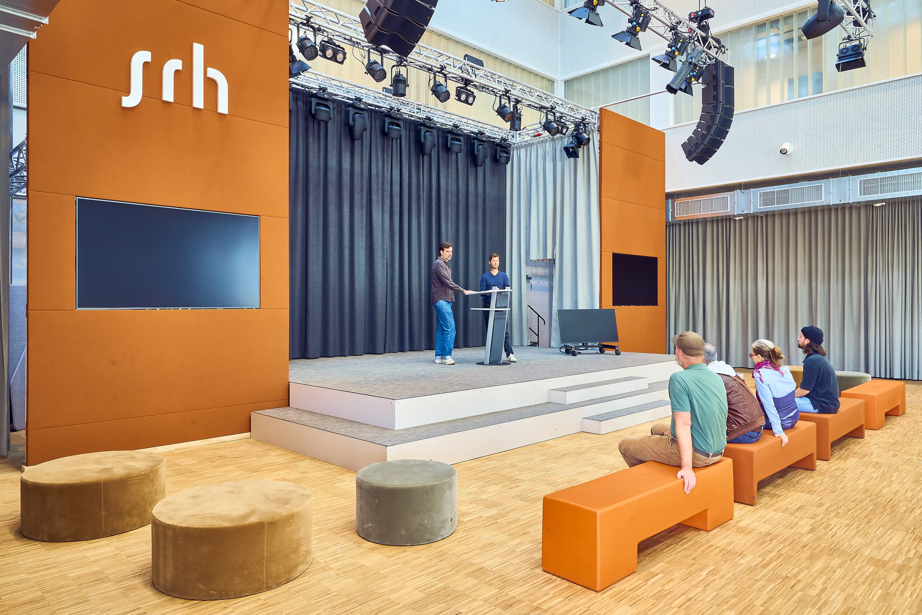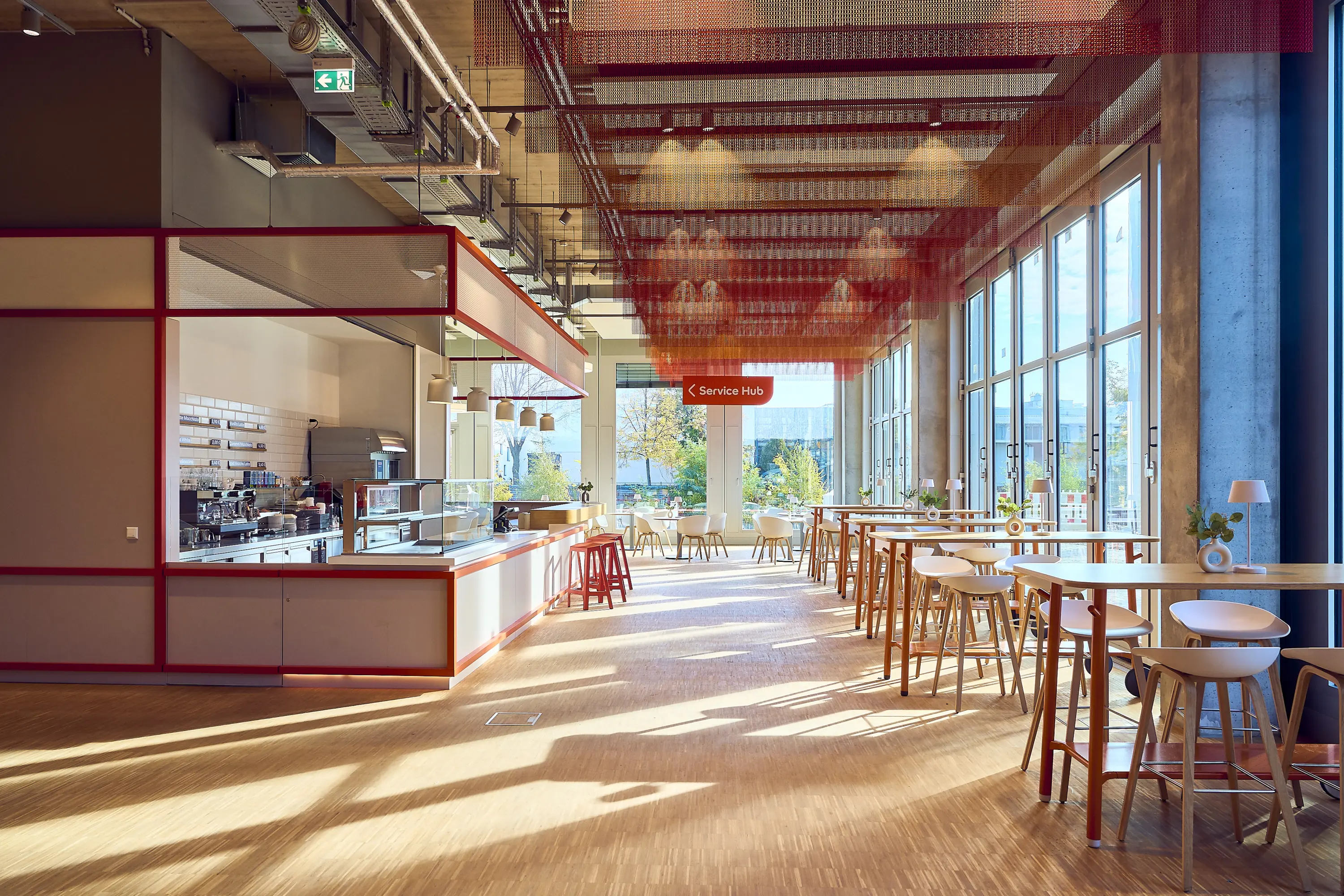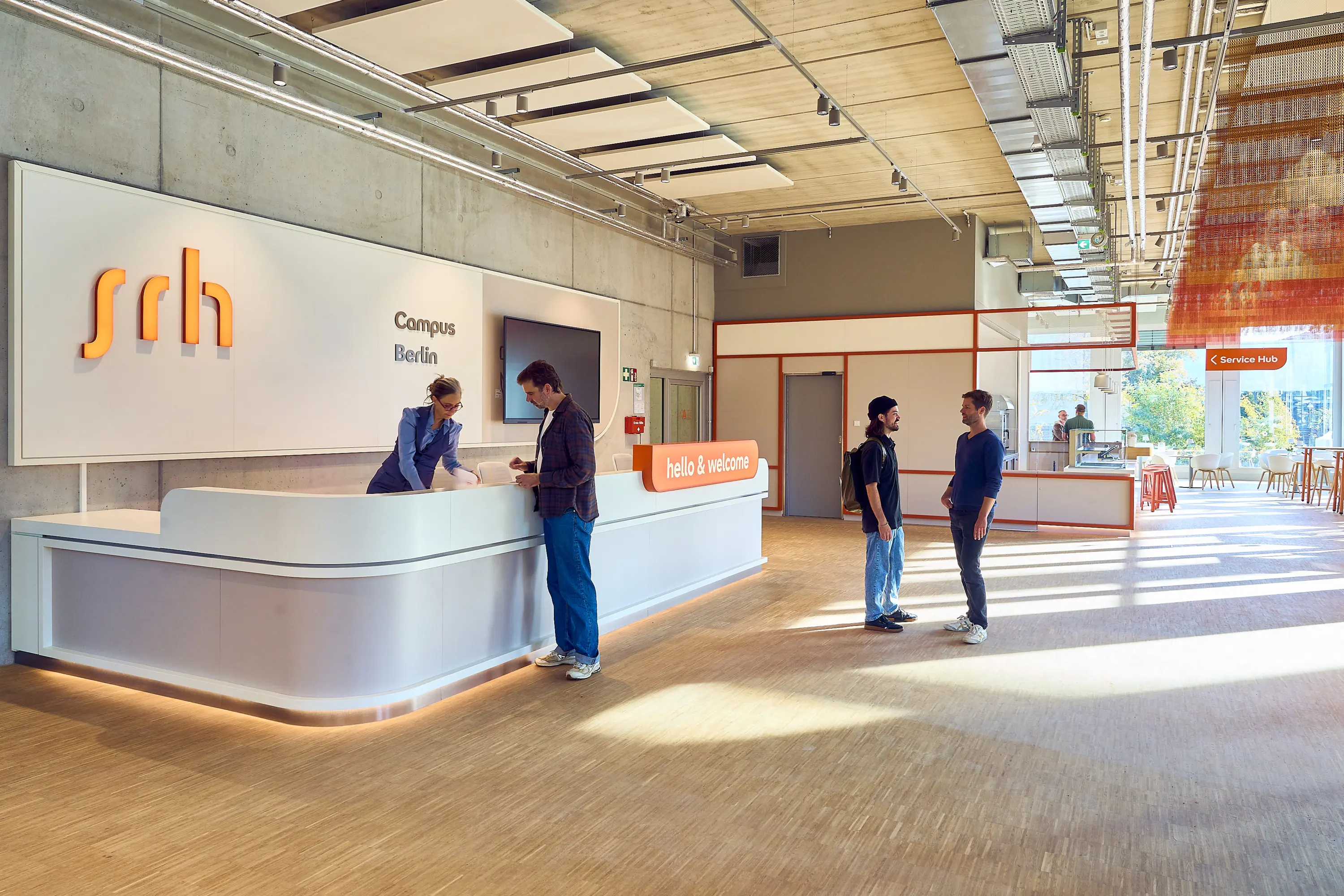 The SRH Campus Berlin serves as a “New Learning Hub & Collaborative Space”, symbolizing the transformation of traditional learning environments into dynamic, innovative settings. It is tailored to the needs of a modern, digital society. The brand-in-space concept for future-oriented learning and working was conceived, planned, and implemented by dan pearlman under the direction of Prof. Marcus Fischer. Building on the university’s corporate identity, all materials, colour and form concepts, furniture types and colours, surface configurations, as well as design elements and their spatial implementation, were carefully defined.
